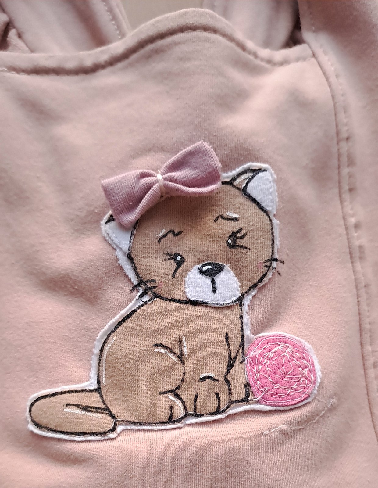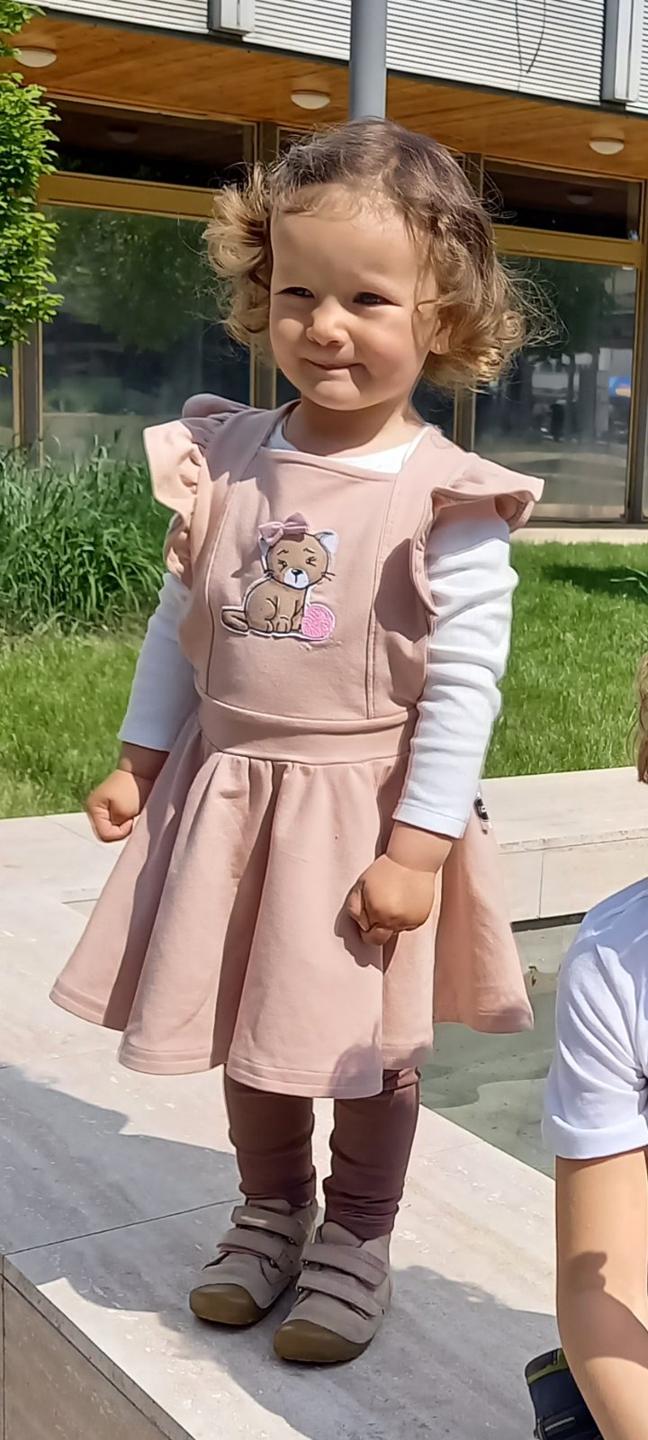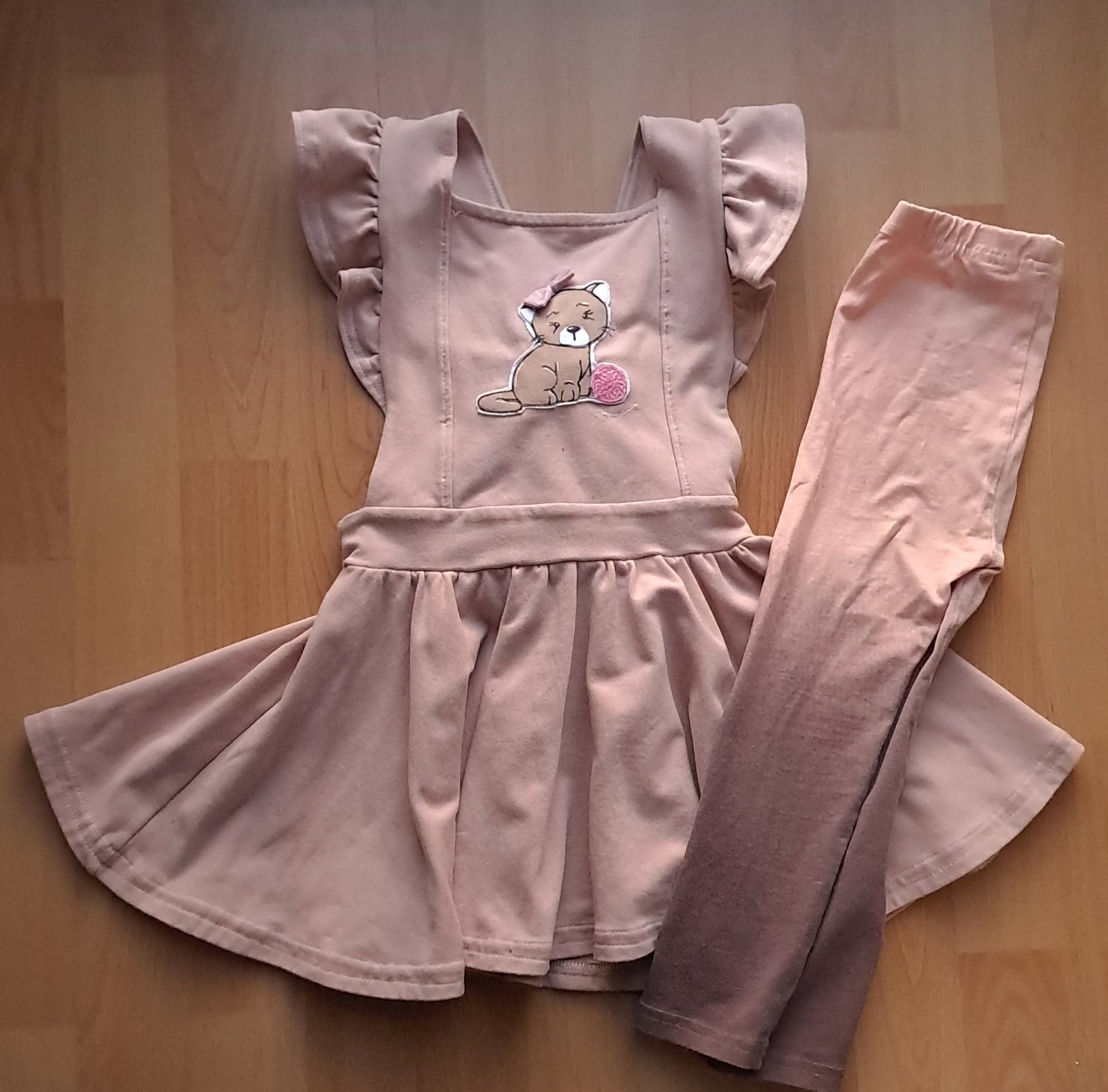 Nadherna staroruzova tociva sukna na traky, s volanikmi, vyrobena na moje zelanie. Latka je velmi kvalitna, mierne hrubsia, macicka je rucne kreslena a rucne nasivana aj s maslickou. Na chrbte je gumicka, ktora sa da posuvat a upravit ramena aby nepadali. Dcerka ich dostana na 3 roky, oblecie aj ako 4.5 rocna ale uz su jej trochu kratke.