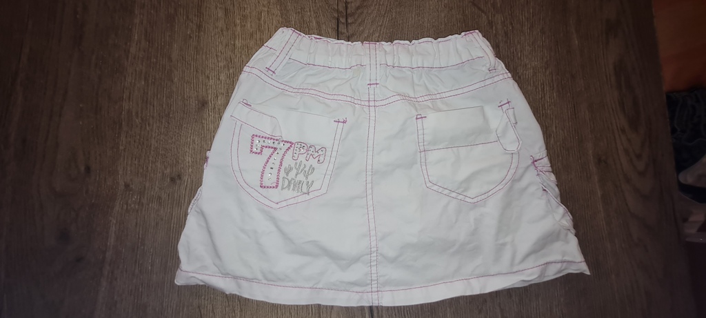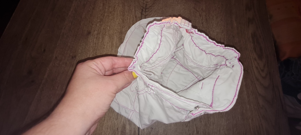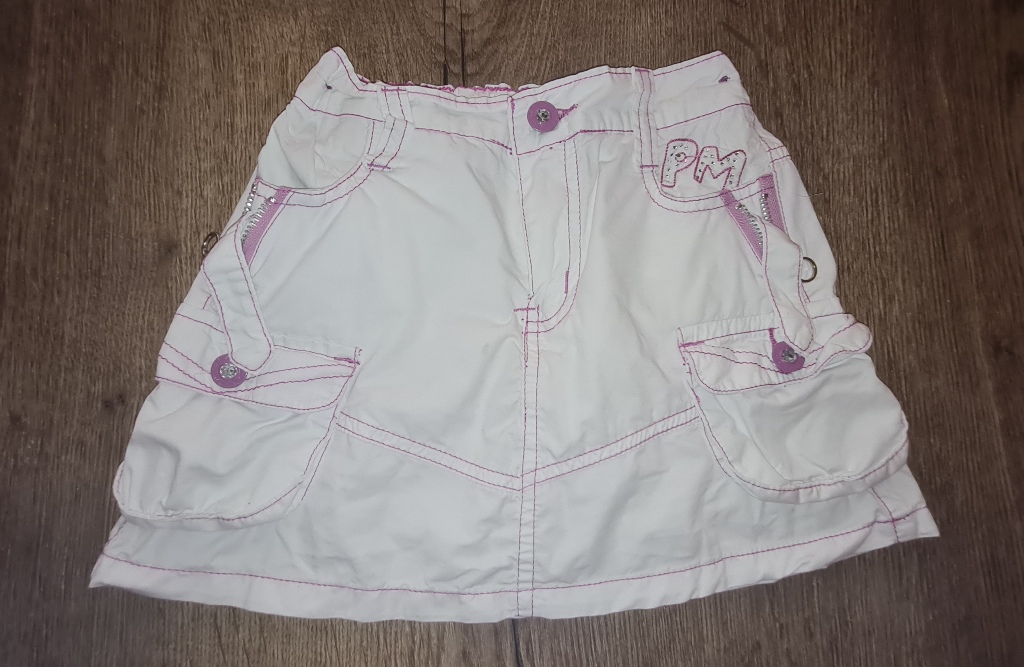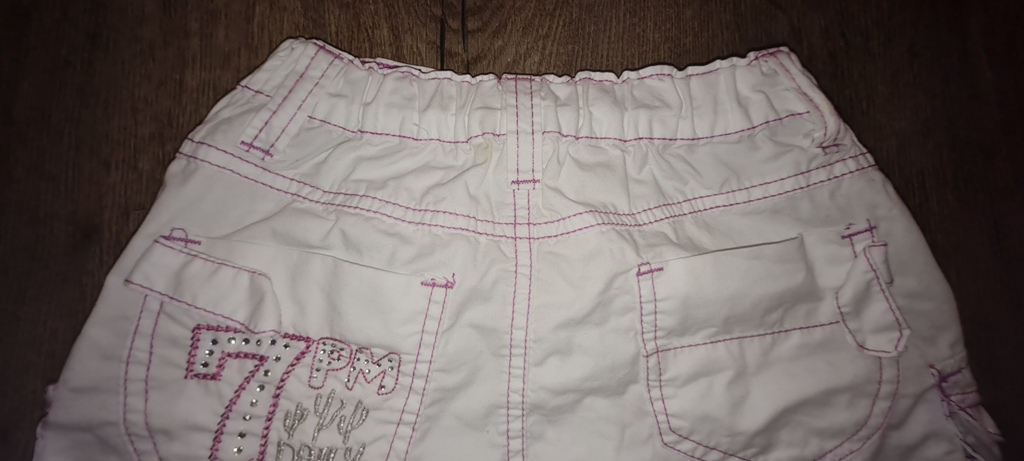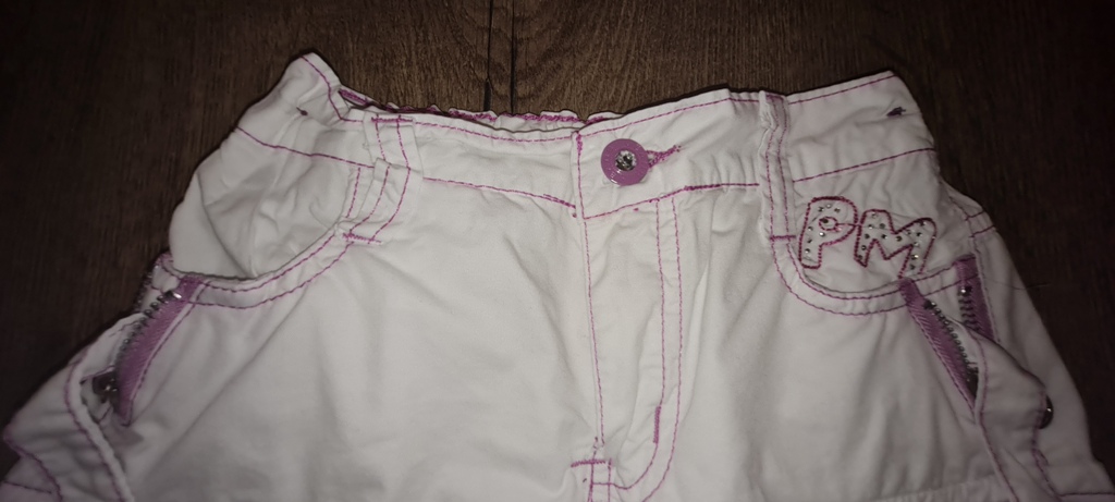 biela obšívaná ružovou niťou, ružové ozdobné zipsy, ružové gombíky, pevnejšia letná látka, vzadu na páse drobný fliačik - viditeľný len pri detailnom sledovaní, na páse posuvná guma, vpredu aj vzadu vrecká, perfektný stav