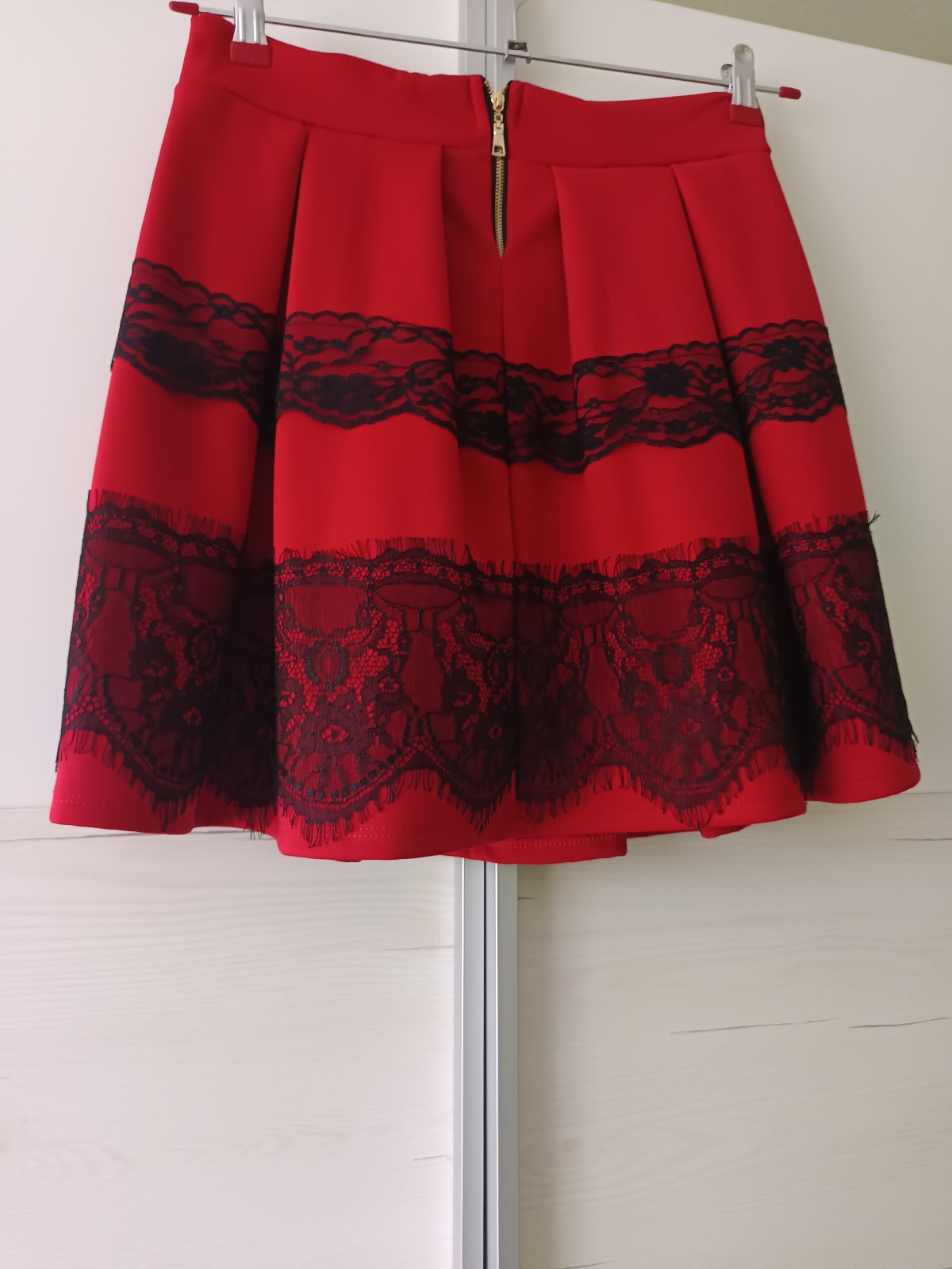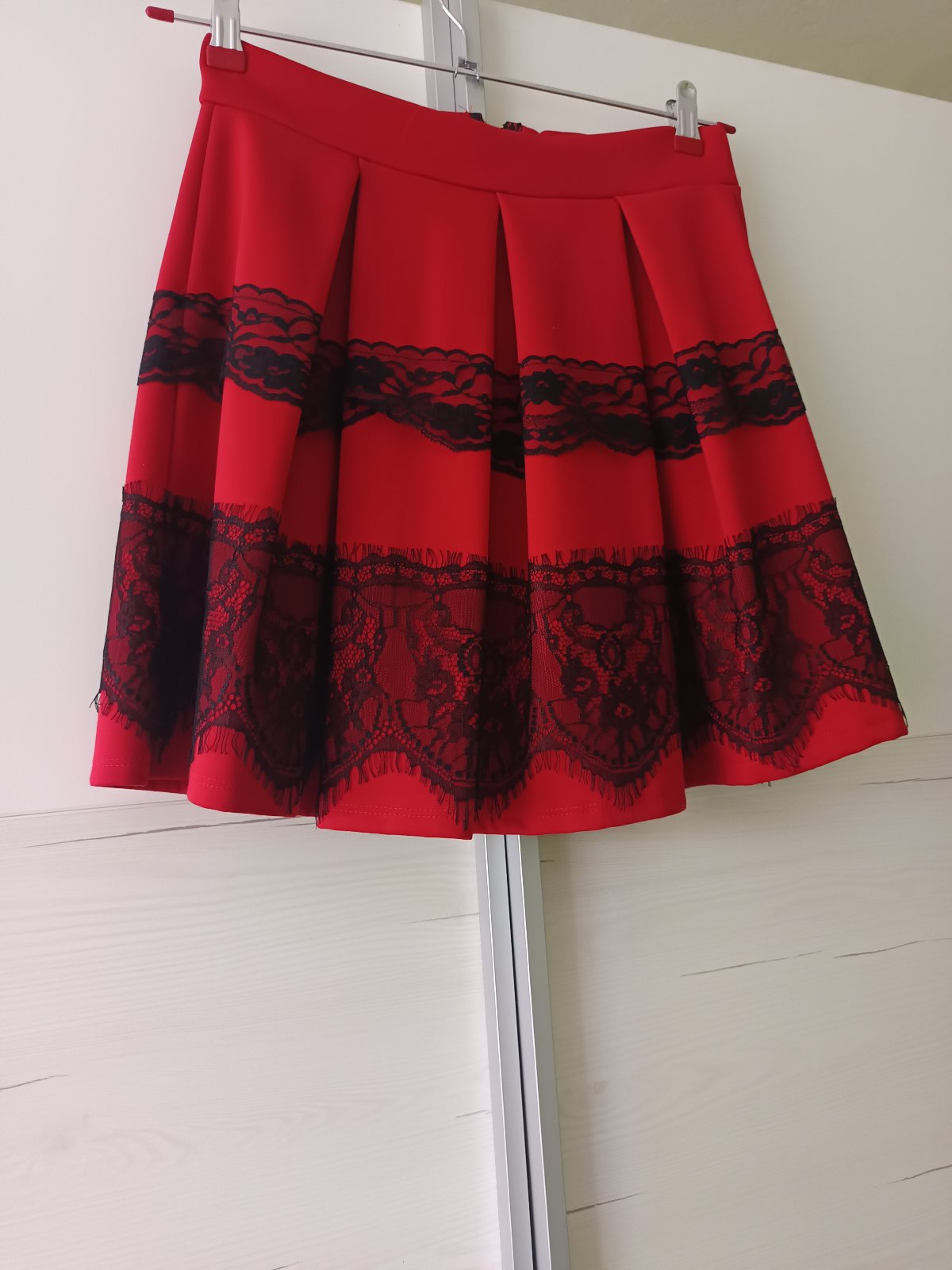 Predám červenú mini sukňu ozdobenú čiernou čipkou so zapínaním na zips. Uvedená je veľkosť L, ale sedí na S.