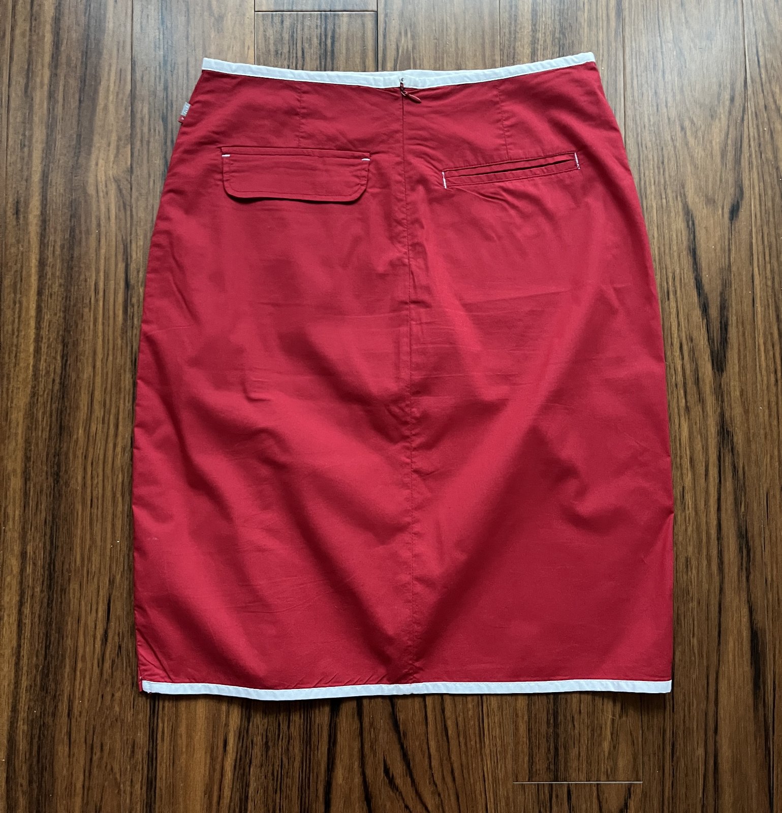 Letná sukňa červená s bielym olemovaním, veľkosť 38. Zapínanie na zadnej strane na zips. Dve vrecká na zadnej strane. Celková dĺžka 58 cm, v páse 37 cm, spodný lem 49cm. Málo nosená.