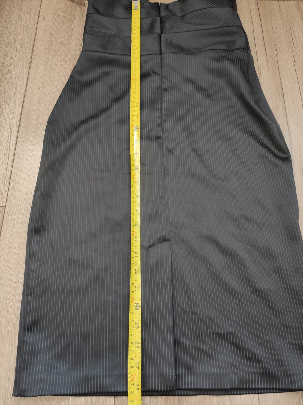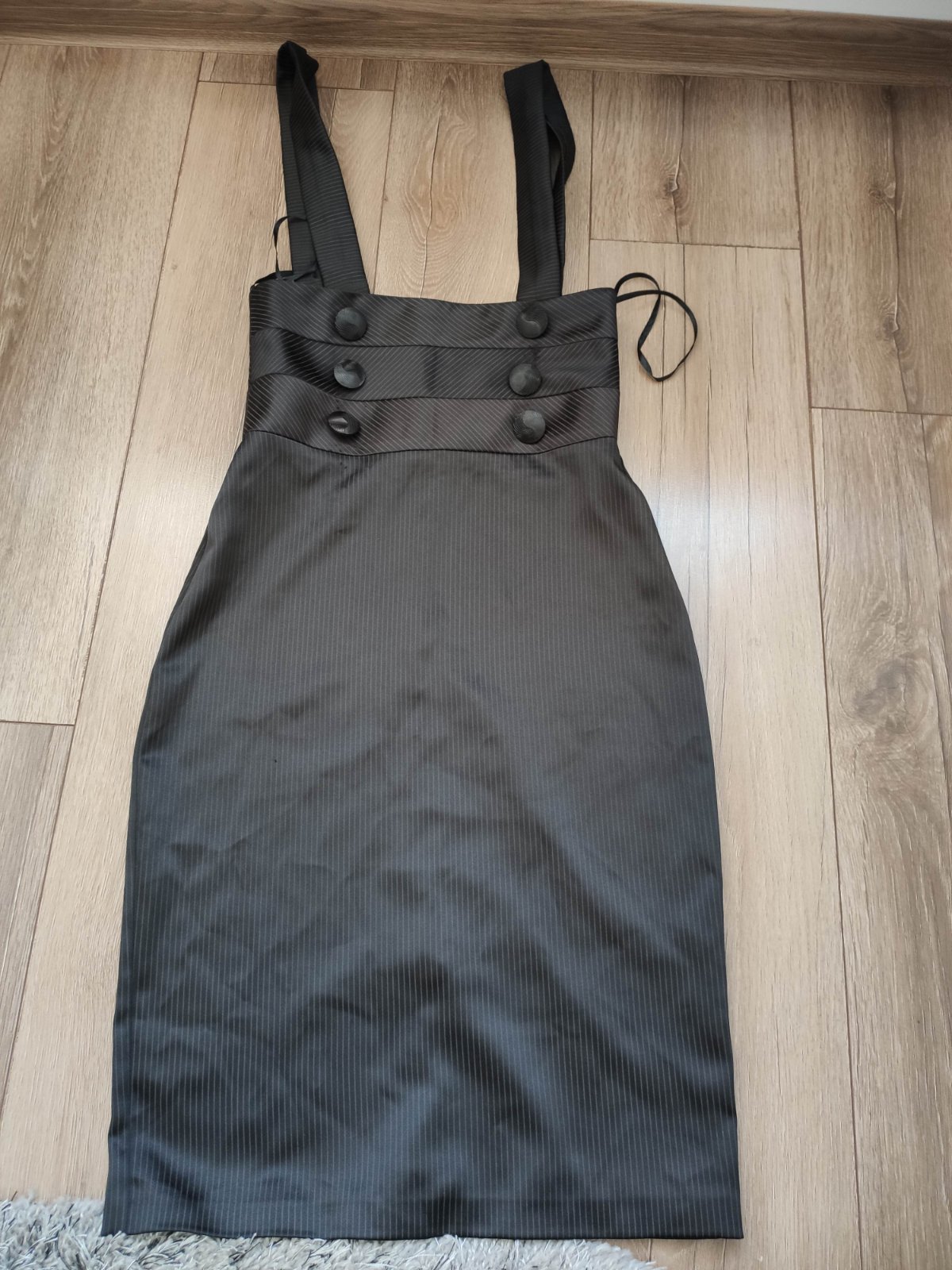 Elegantná sukňa na traky, ktoré sú odnímateľné a dĺžka je regulovateľná, vzadu zips, úzky strih, tesne pod kolená, vysoký pás až k prsiam, pekne ukáže s blúzkou, pod gombíkmi na jednej strane pozaťahované od gombíka.