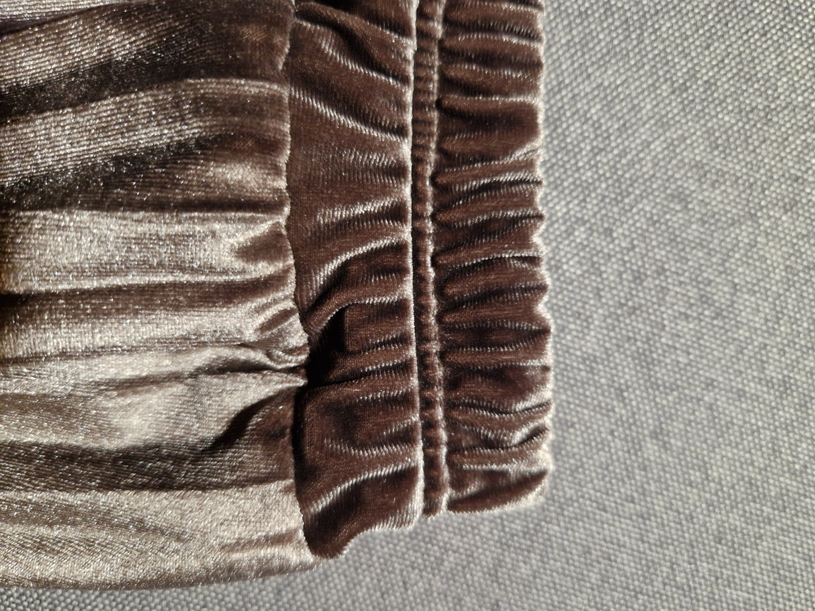 Minimum nosená. Zamatová mäkká. Pevnejšia guma v páse. Krásna zvláštna farba. Podšívka do pol sukne. Pás v kľude 29, dĺžka 74. Štítok s veľkosťou ani značkou nemá.