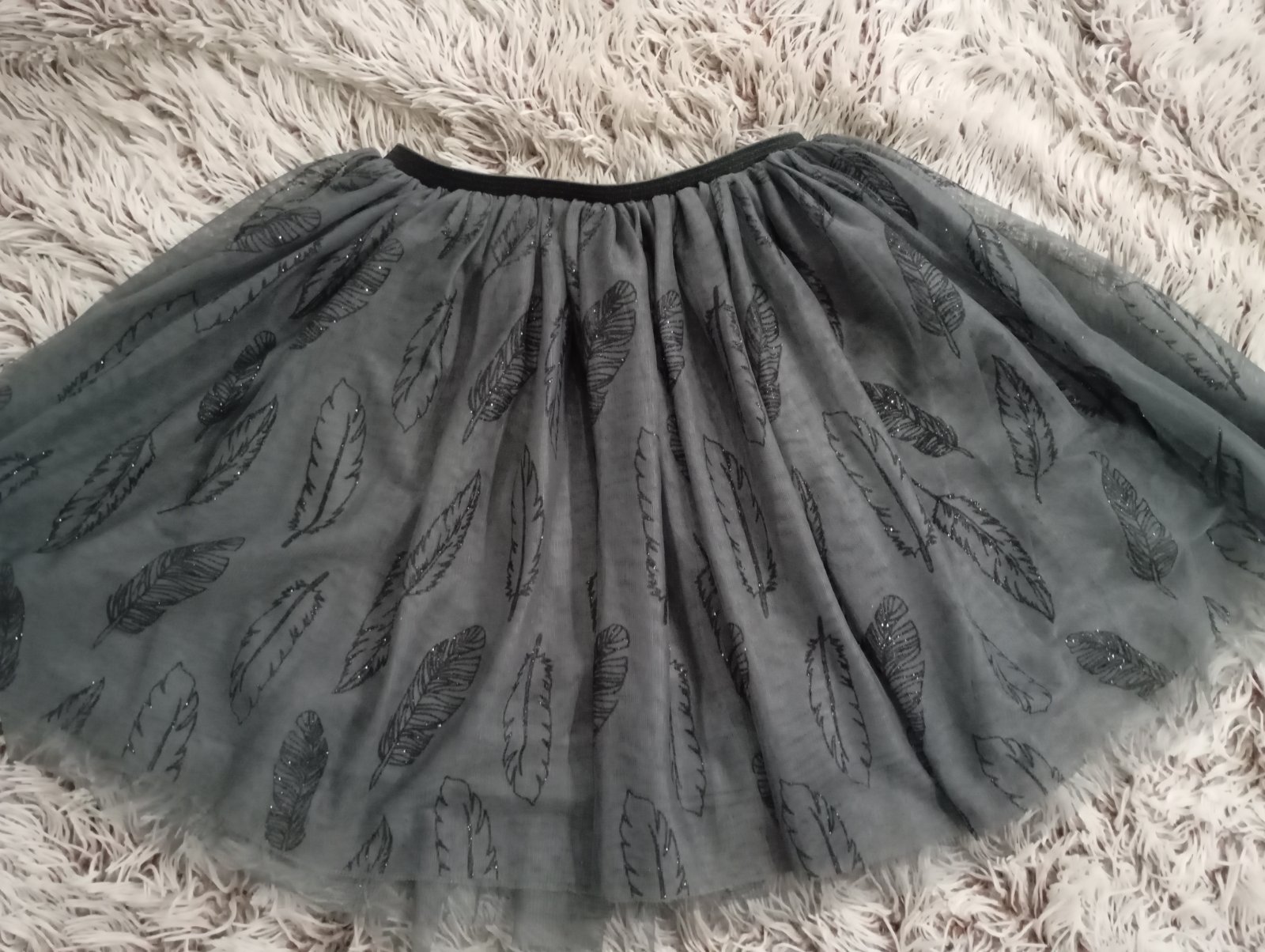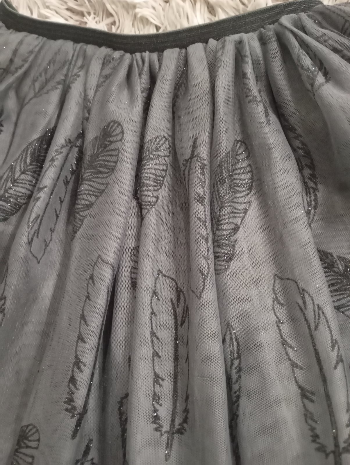 Krásna tmavošedá sukňa s trblietavými lístkami, v páse má gumičku. Krásne sa točí. Minimálne nosená, žiadne poškodenia.
