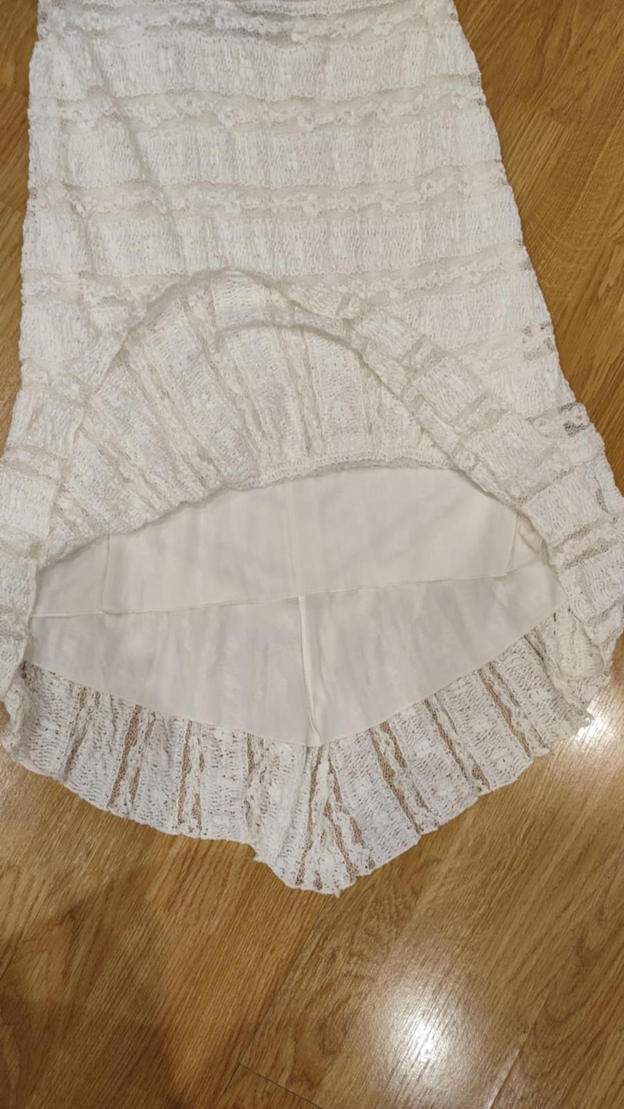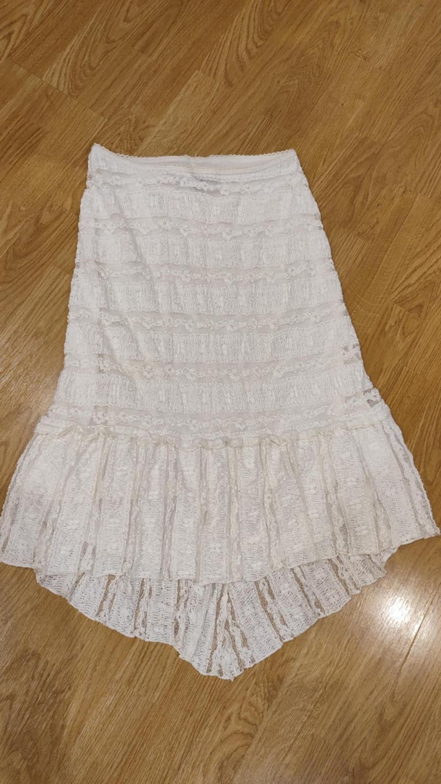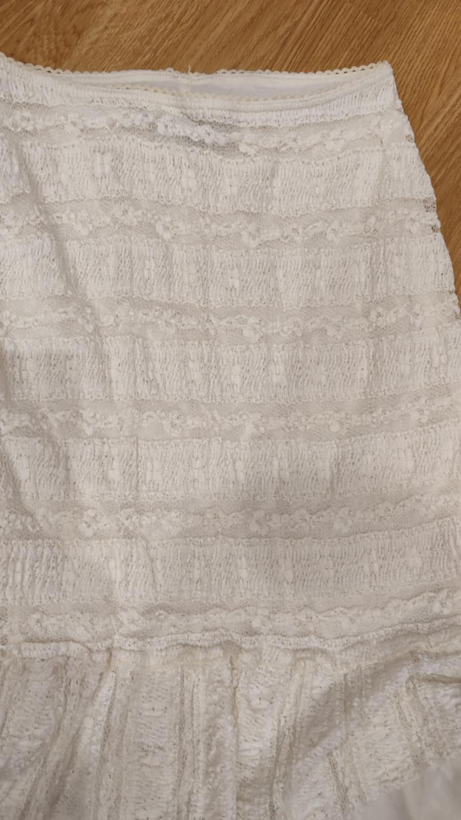 Pekná madeirová podšitá sukňa, v páse guma, v zadu je dlhšia ako v predu. bez chyby.