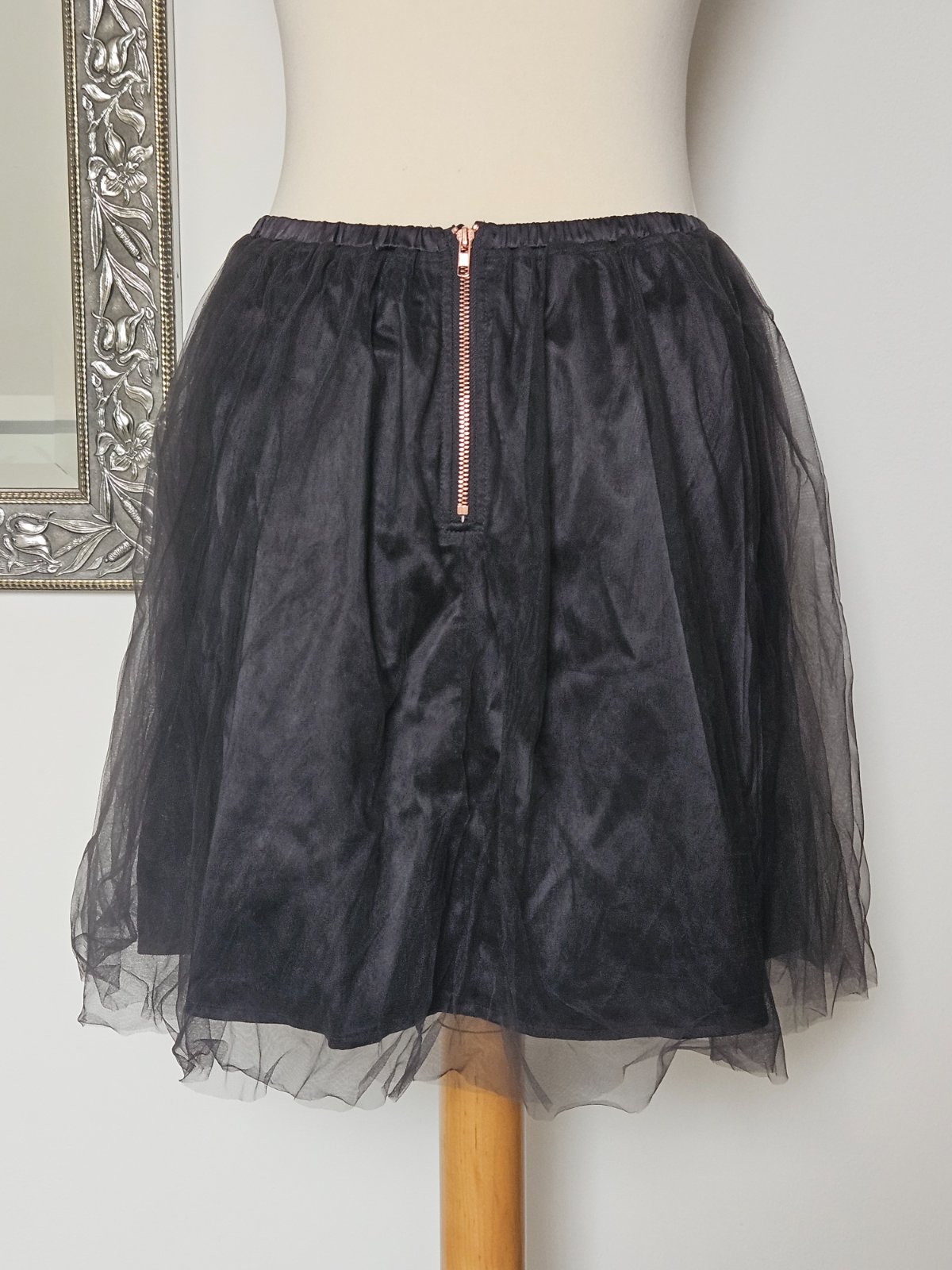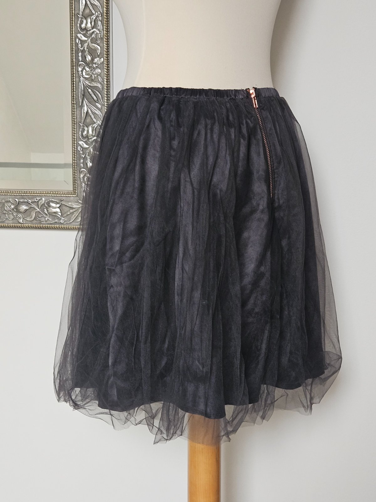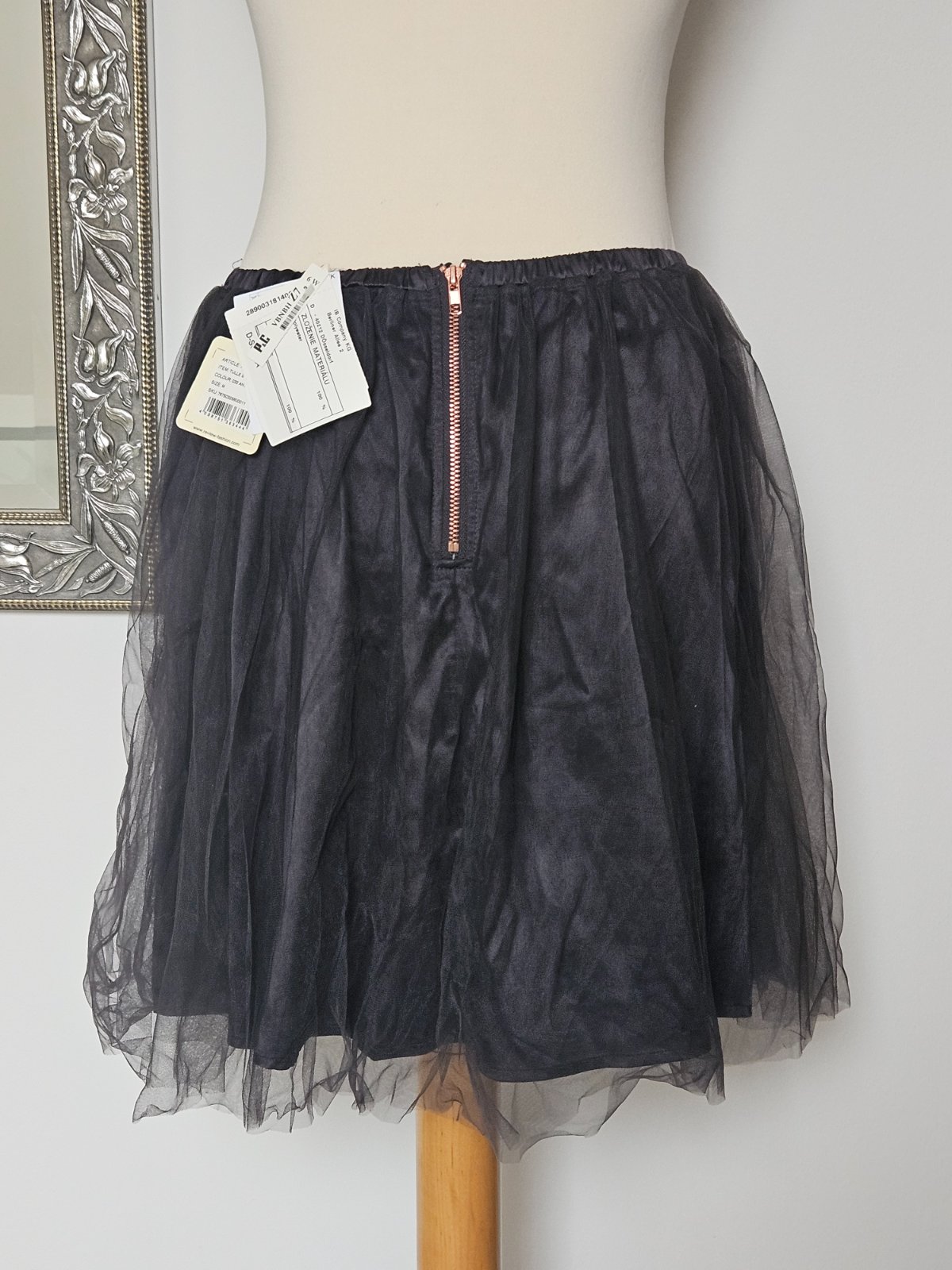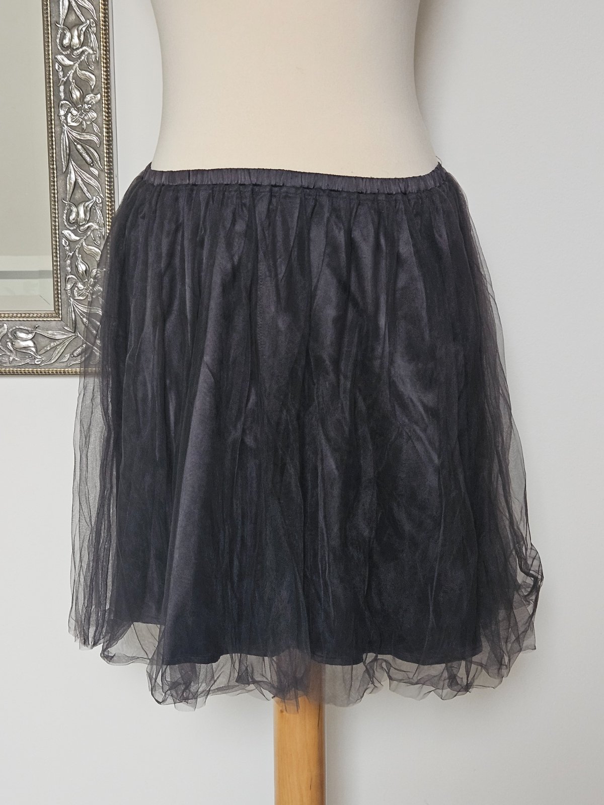 Nová riasená tylová mini sukňa Review v oceľovo sivej, antracitovej farbe. 2 vrstvy tylu a potom spodnička. Uvadzaná veľkosť je M ale kľudne aj UNI