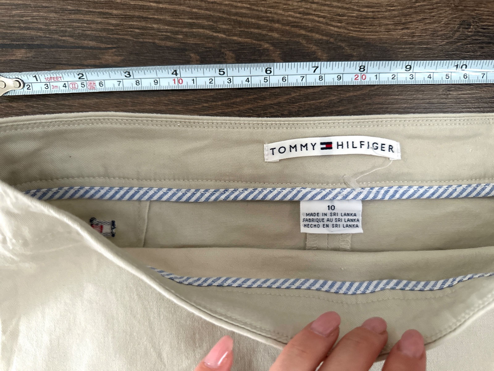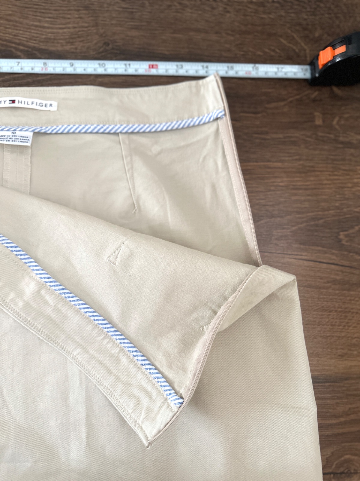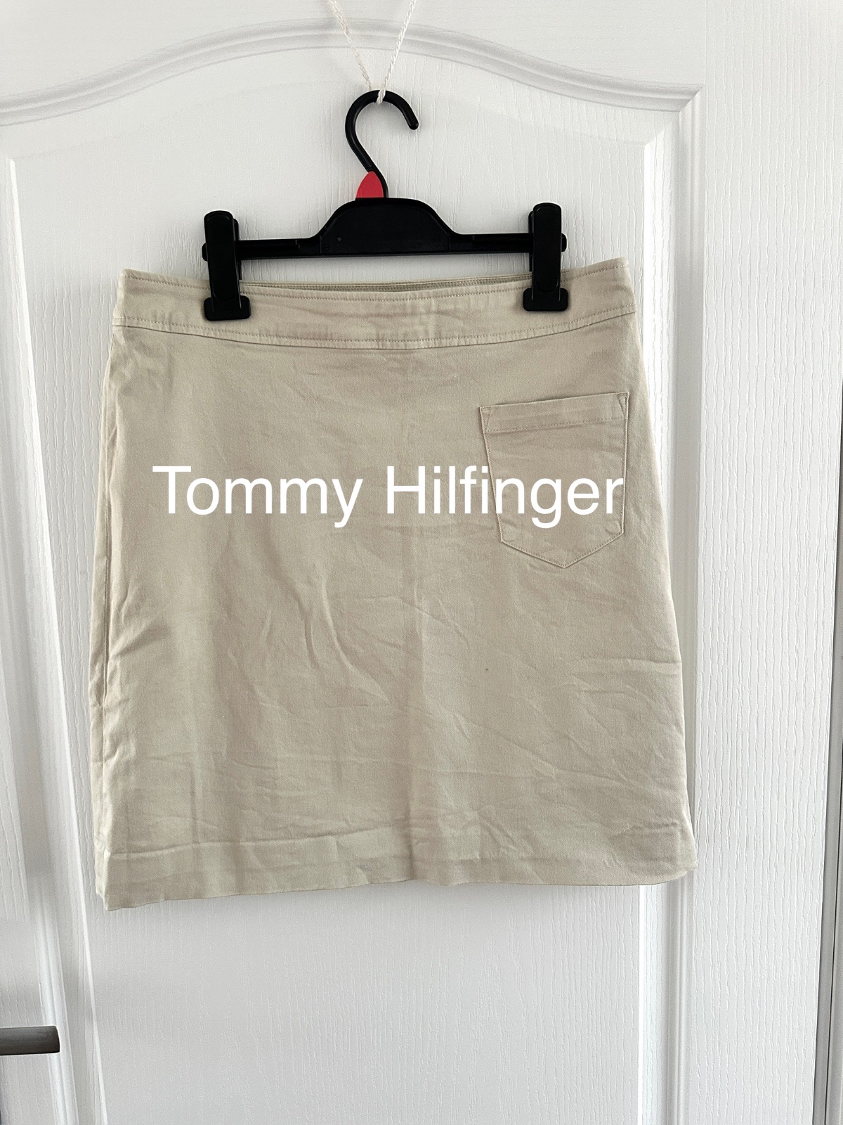 Sukňa Tommy Hilfiger áčkového strihu v krásnej béžovej farbe. Sukňa sa zapína na bočný zips. Vpredu má malé vrecko a na zadnej strane je vyšité logo značky. Sukňa je vyrobená s dôrazom na detail. Je vyrobená z 96 % bavlny a 4 % elastanu. Na štítku je uvedená veľkosť 10, S/M; všetky miery sú na fotografiách. Sukňa vyzerá skvele s teniskami a tričkom alebo s bielom košeľu a lodičkami. Ideálna do práce alebo na prechádzku s dieťaťom.