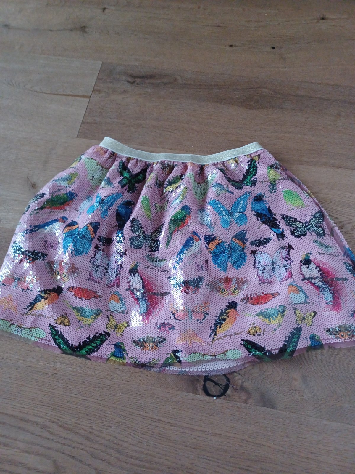 Krásna ligotavá suknička s motýlikmi a vtáčikmi. Celková dĺžka 36 cm, v páse 29 cm (na gumičku).