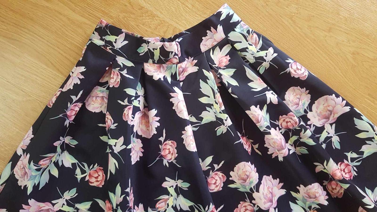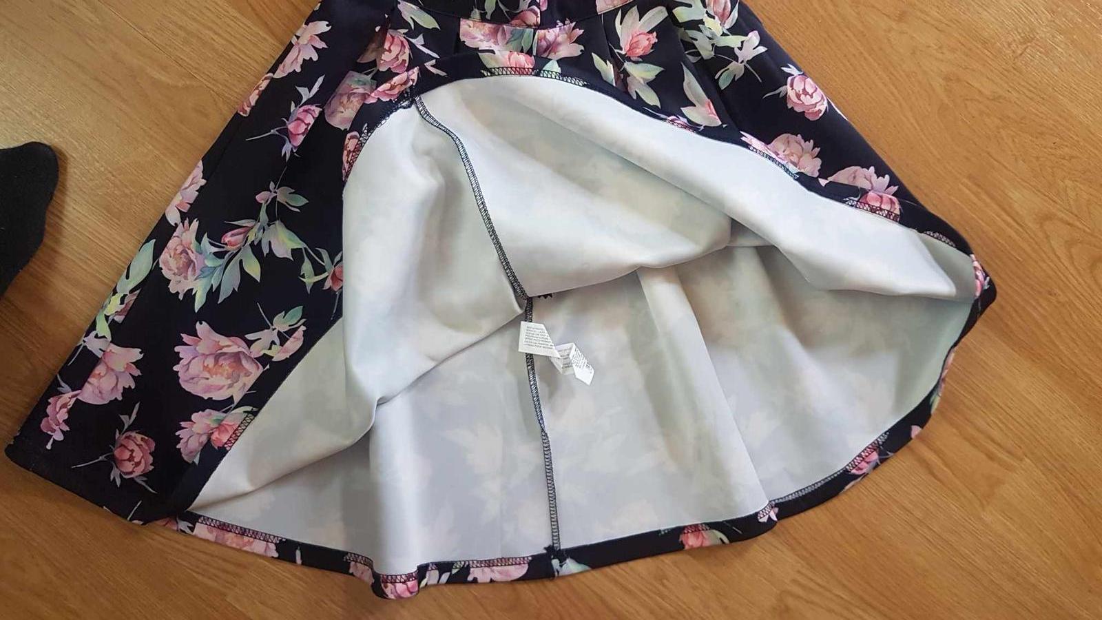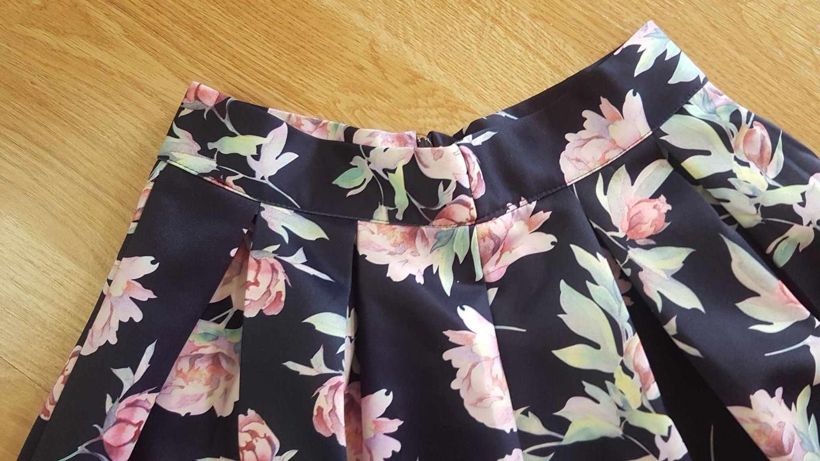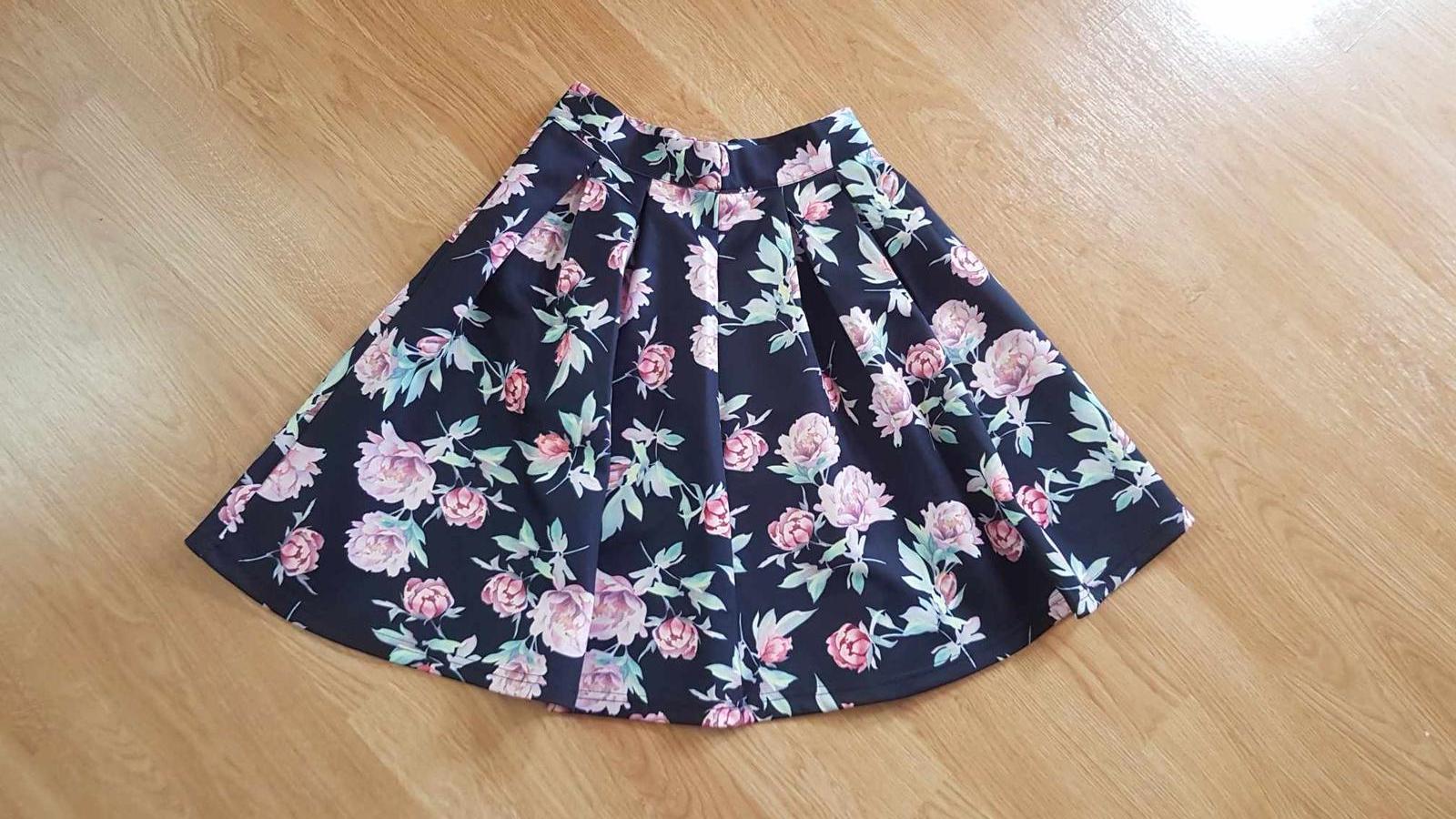 Pekná sukňa štýlová, čo drží tvar, je z nekrčivého pevnejšieho materiálu, elegantná, aj na príležitosť, v zadu sa zapína na zips. Pekne sa točí. Pás 33 x 2 cm. Celková dĺžka je 53 cm.