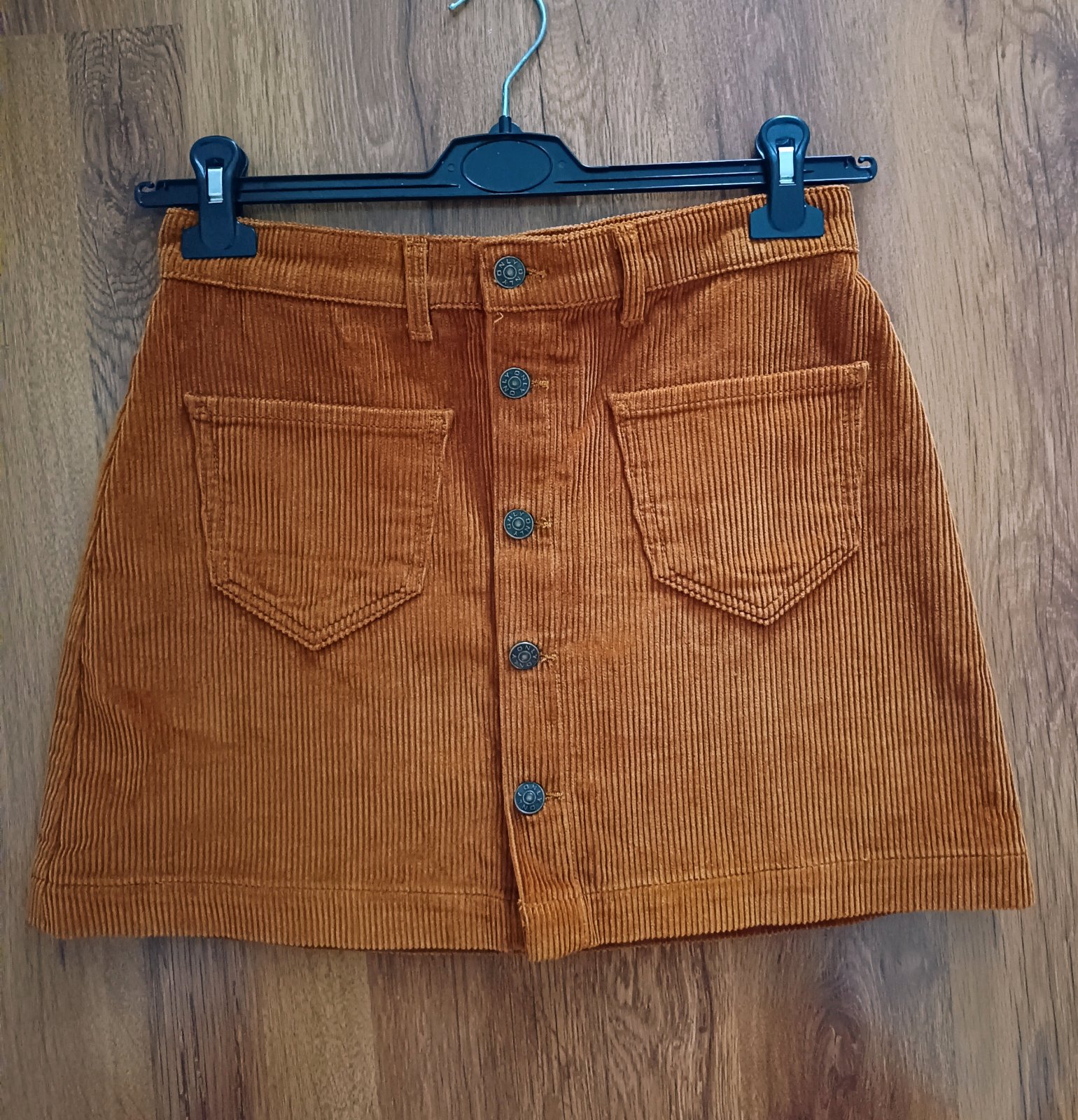 Predám hnedú minisukňu, veľkosť 38/M. Je nosená, no v top stave bez poškodení. Vpredu na jednej strane ozdobné prešívanie, vzadu na jednej strane na opasku ozdobná aplikácia. Pás 2x 41 cm, dĺžka 32...