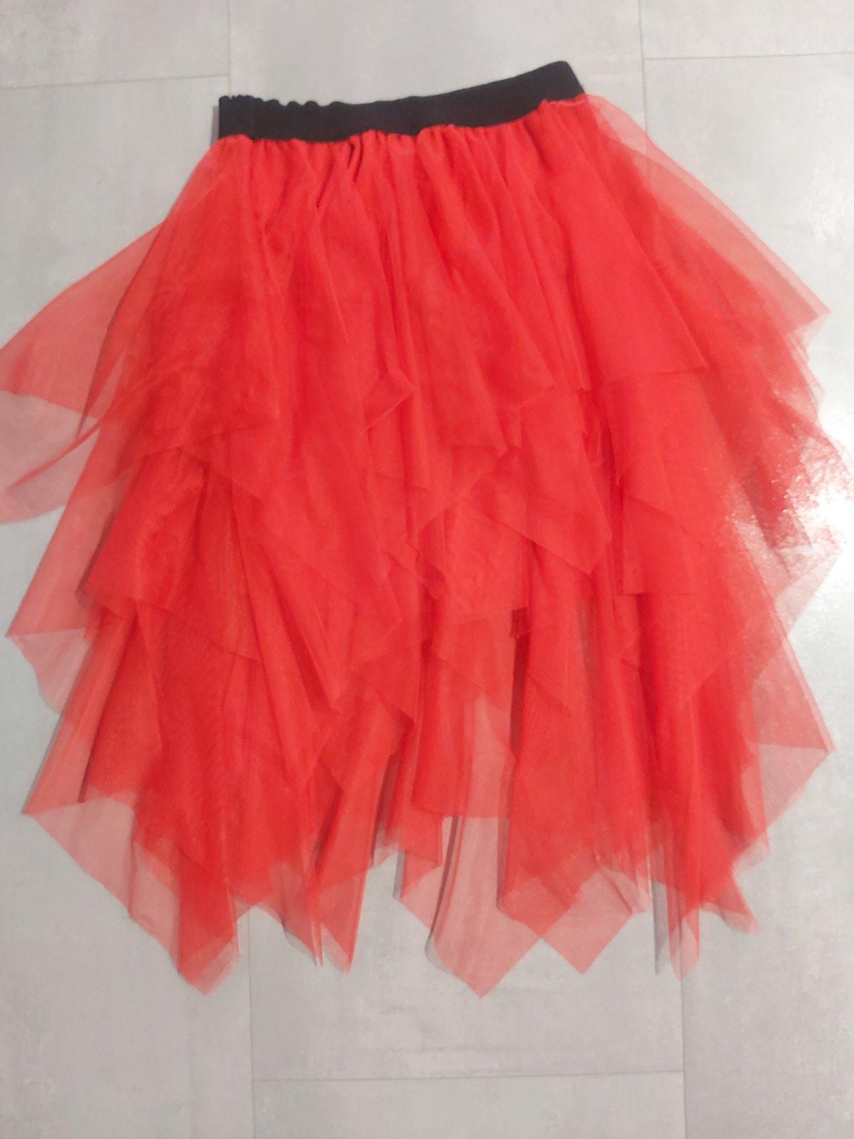 Tylová sukňa červenej farby vhodná na bežné ako aj príležitostne nosenie. V páse s gumičkou. Sedí va veľkosť S-L