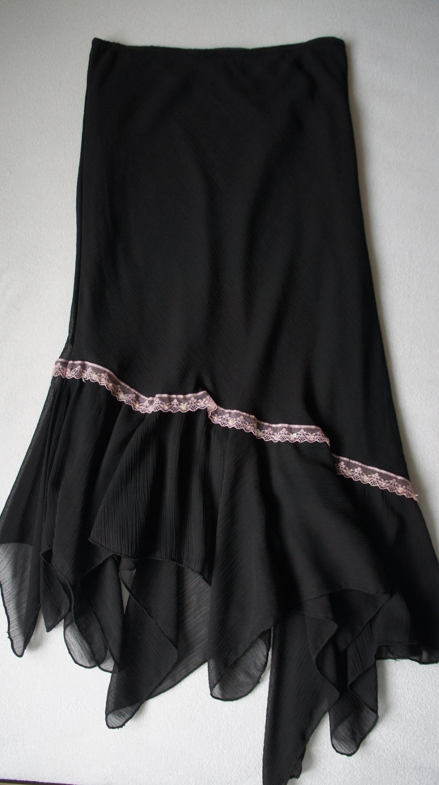 Sukňa na spoločenskú príležitosť. Farba: čierna s bledunko ružovou krajkou. Veľkosť na štítku nie je uvedená, podľa seba uvádzam S/M, nakoľko je mierne elastická - dokáže sa prispôsobiť postave. Je príjemná a ľahunká. Nakoľko tá vrchná jemná látka mierne presvitá, je cca po tú krajku podšitá spodničkou.