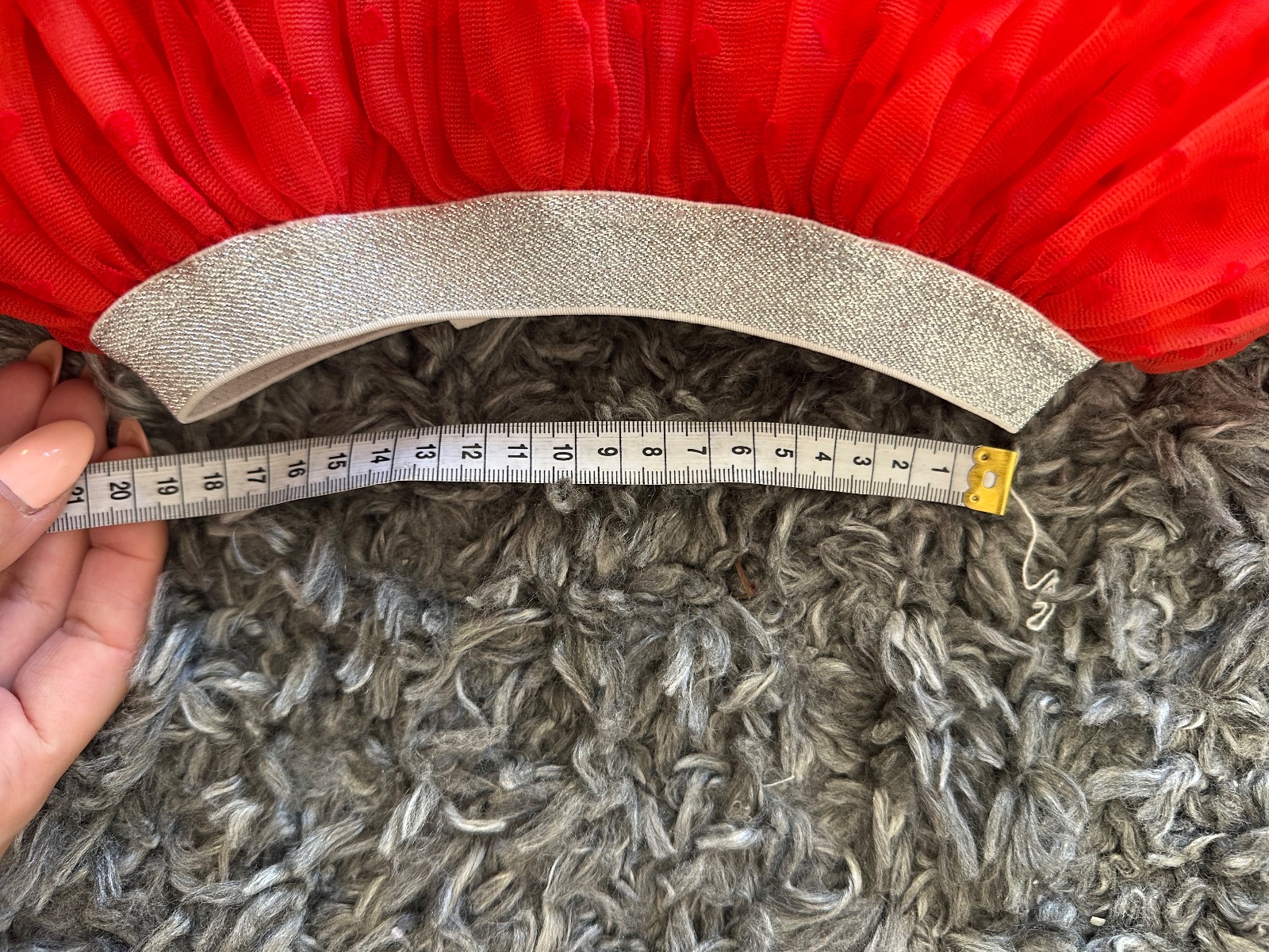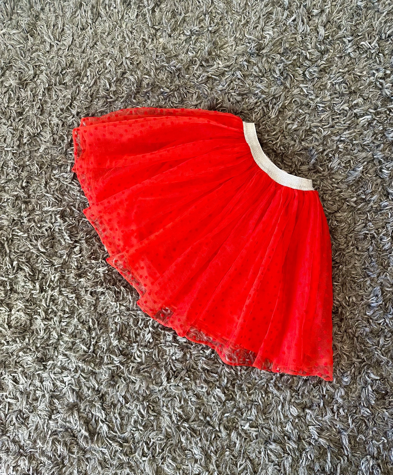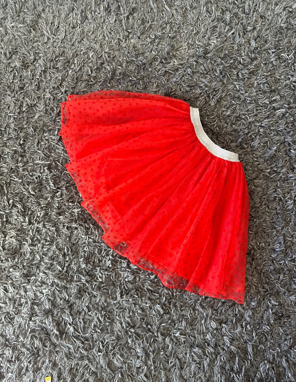 Nádherná jasno-červená tylová suknička so srdiečkami, so striebornou dostatočne naťahovacou gumou v páse. Veľkost písaná 116, my sme ju nosili od 4-8 rokov; treba si prizrieť len šírku pásu (nie je vhodná pre deti s plnším bruškom). Pri veľkosi 116 je pod kolená, moje dievčatá ju nosili ešte teraz na jesen (ked mali 7 a 8 rokov, 130 cm) a v tomto veku im bola nad kolená. Mám 2 velkosti - 110 a 116, obe sú v inzerátoch. Dlzka 39 cm.