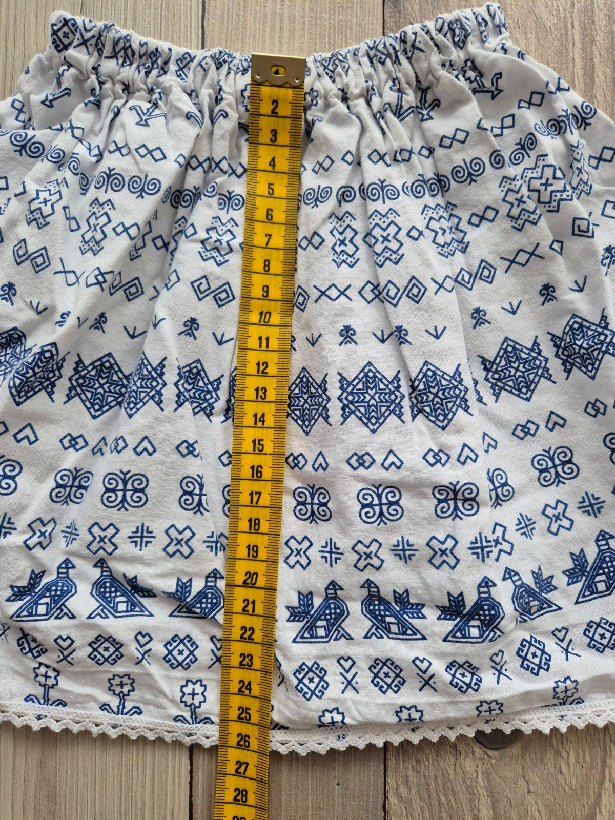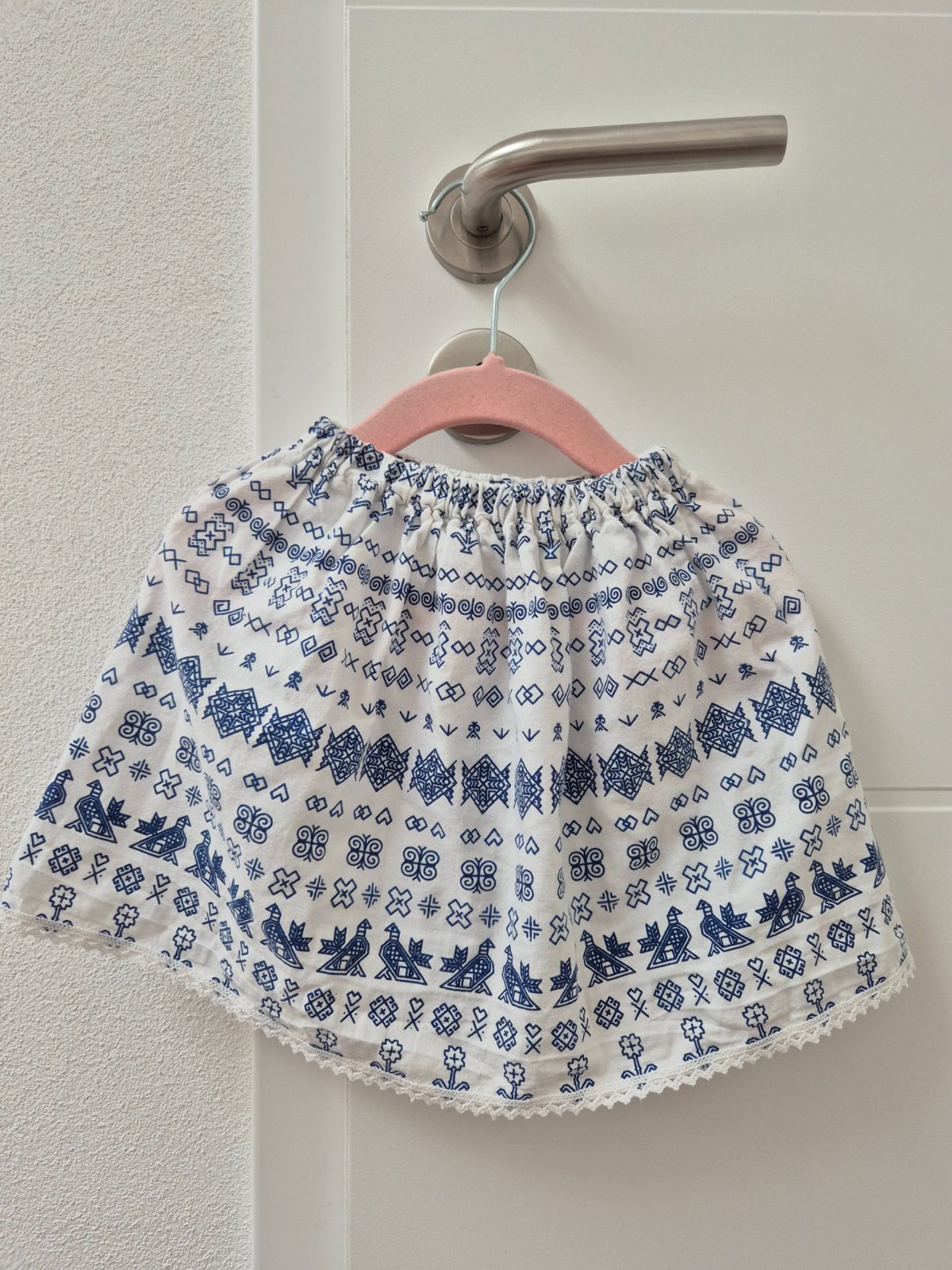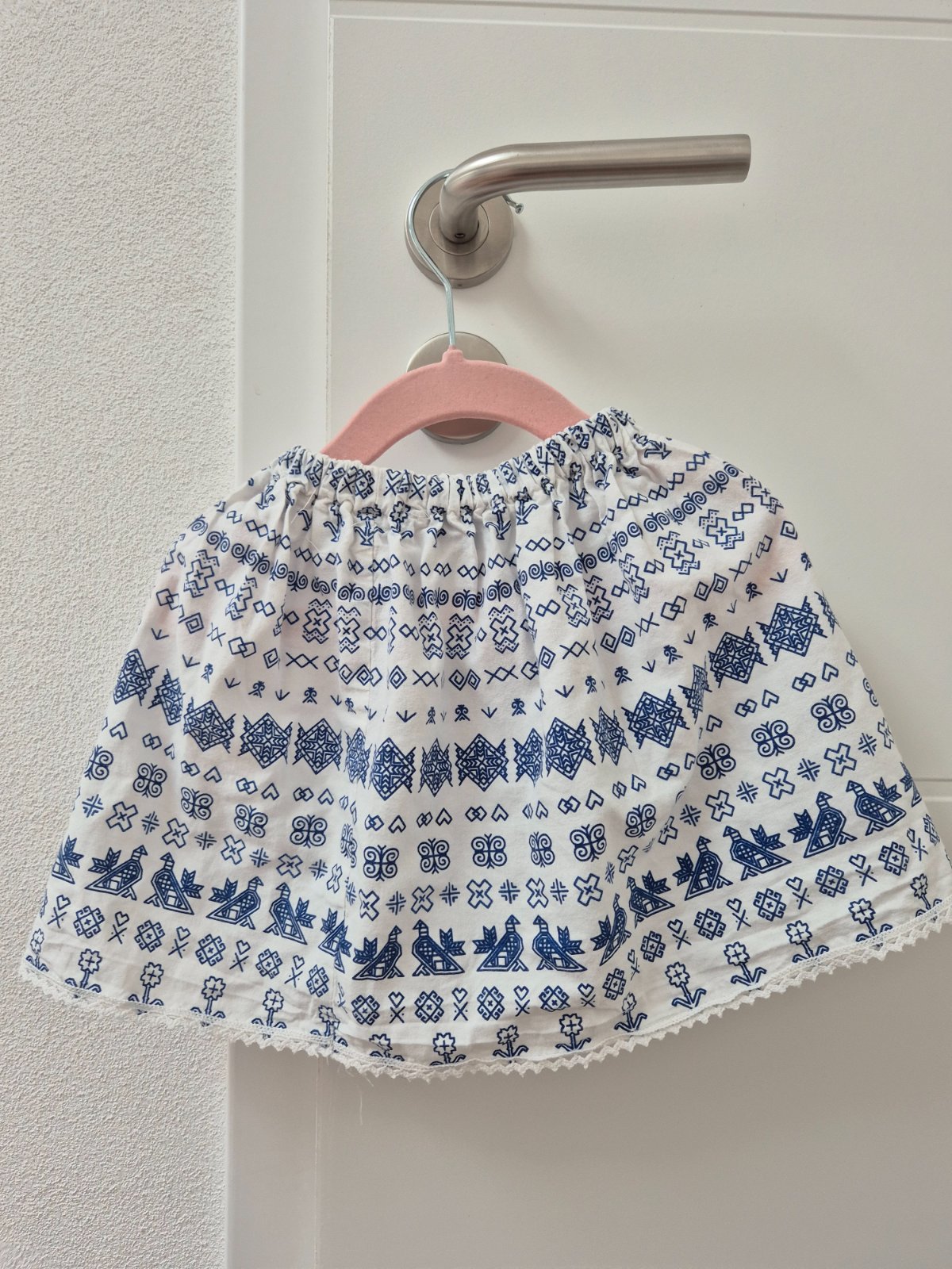Sukňa s ľudovým motívom. Sukňa nemá štítok s veľkosťou, ale dĺžka polovičného pásu je cca 18 cm a dĺžka sukne na výšku je cca 26 cm. Odhadovaná veľkosť od cca 74.