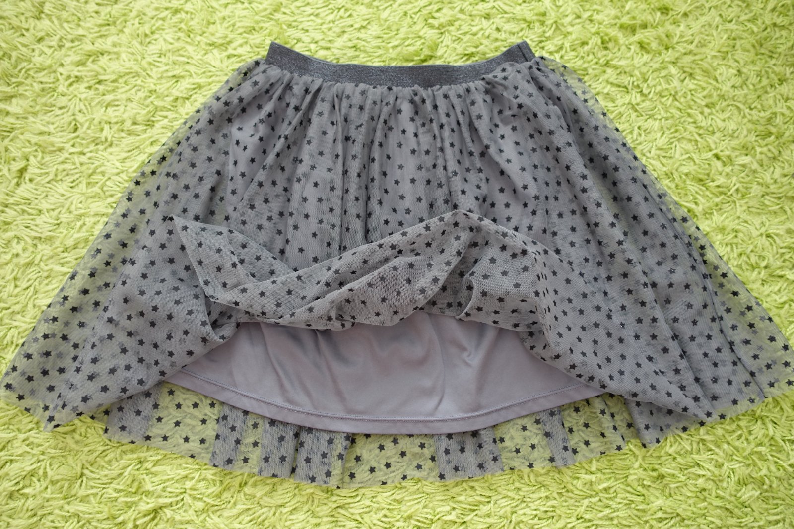 Predám svetlo šedú sukničku s trblietajúcimi sa čiernymi hviezdičkami vo veľkosti 140. Prekrásna, nedá sa mi dobre odfotiť, všetky čierne hviezdičky sa trblietajú. Trblietka neodpadávajú. Je peknučká, nadýchaná, má spodničku. Trblietavý zlatý pás je na gumu, natiahne sa. Krásne sa točí. Bola oblečená asi 2x, ale je top stav. Nemá žiadne zatiahnutie. Dĺžka sukničky po spodničku je 38 cm a od spodničky je ešte tá tylová časť o 6 cm predĺžená. Šírka pásu v kľude je 28 cm a natiahne sa aj do 38 cm. (SSD)