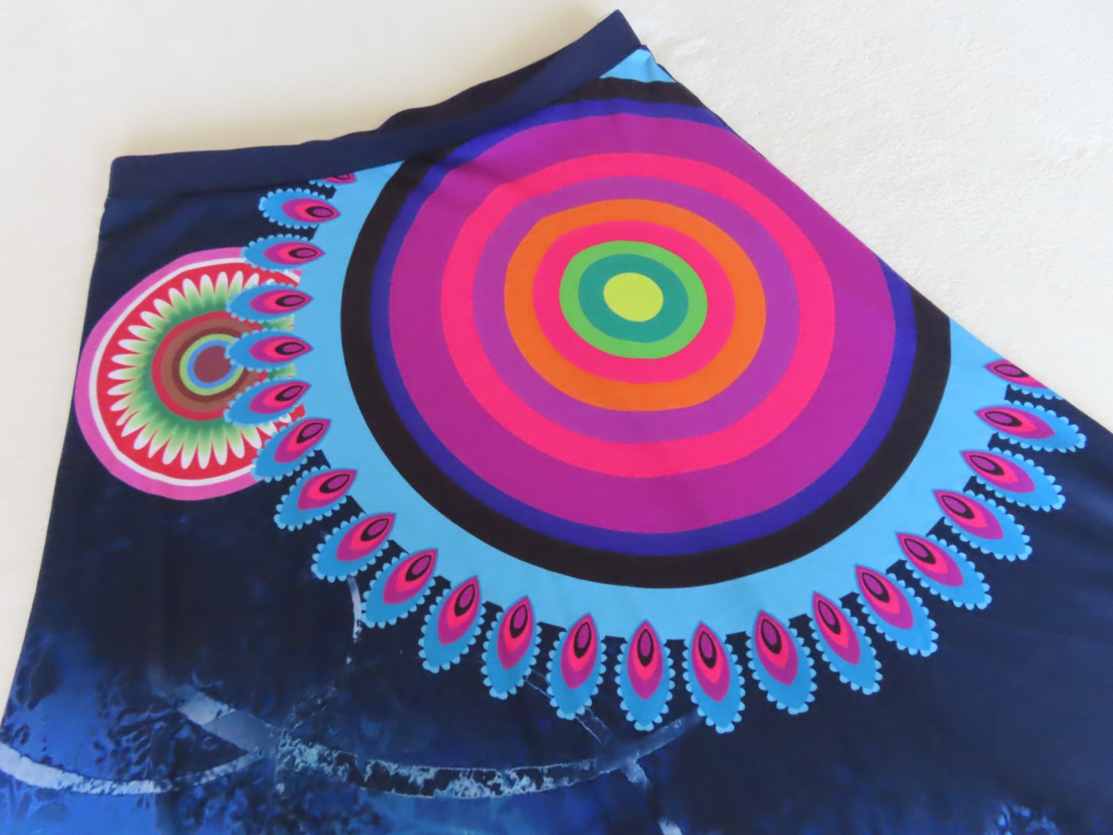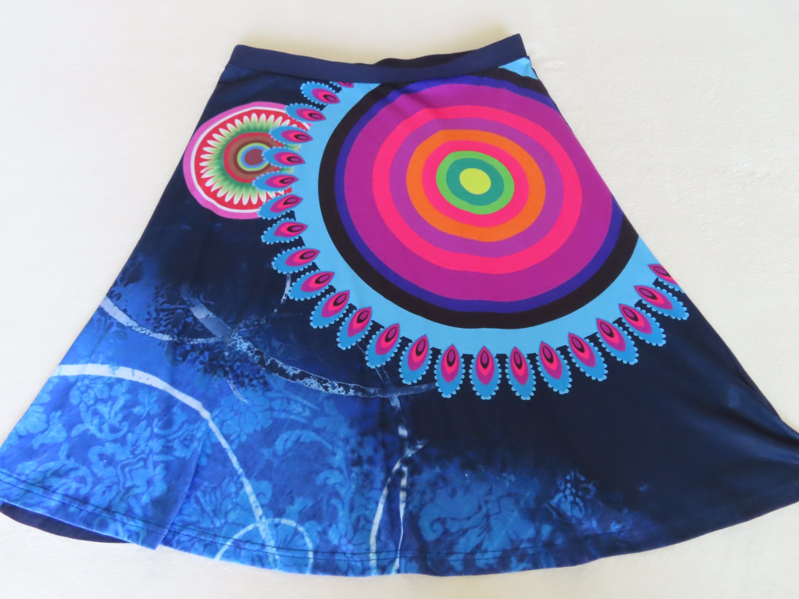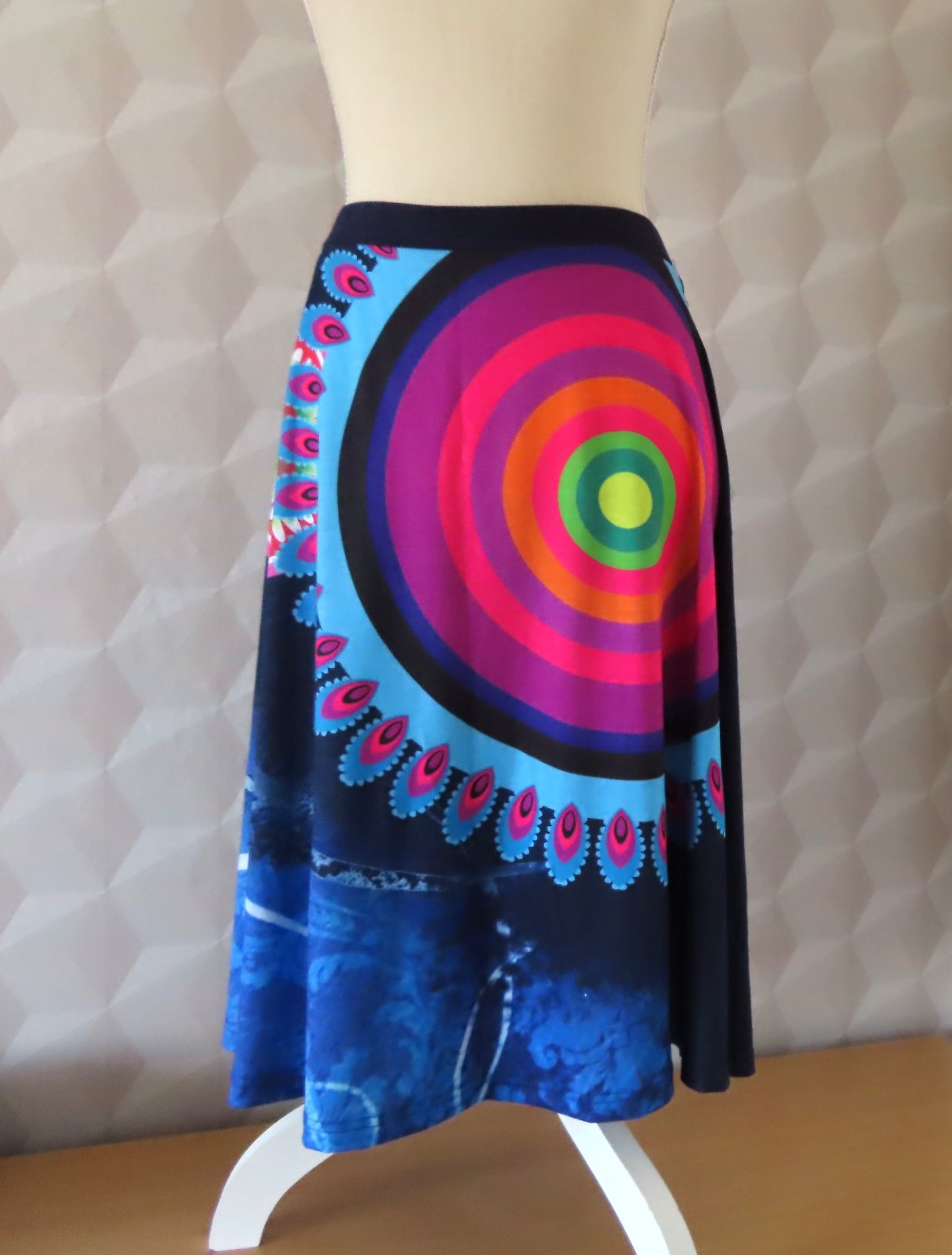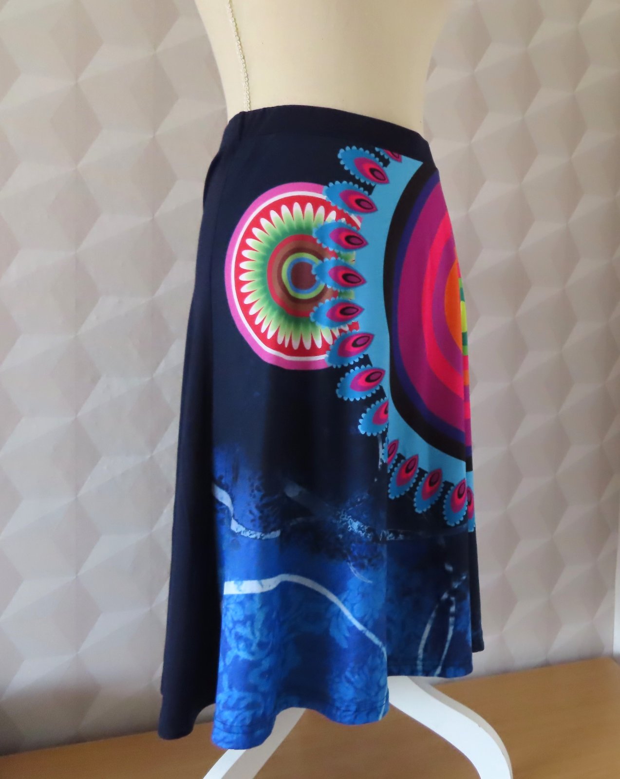 Bavlnená sukňa v páse na gumu. Veľkostne sedí na L aj XL - tu sú rozmery: dlžka 62cm, pás elastický 2x41-46cm. Materiál padavý, splývavý.