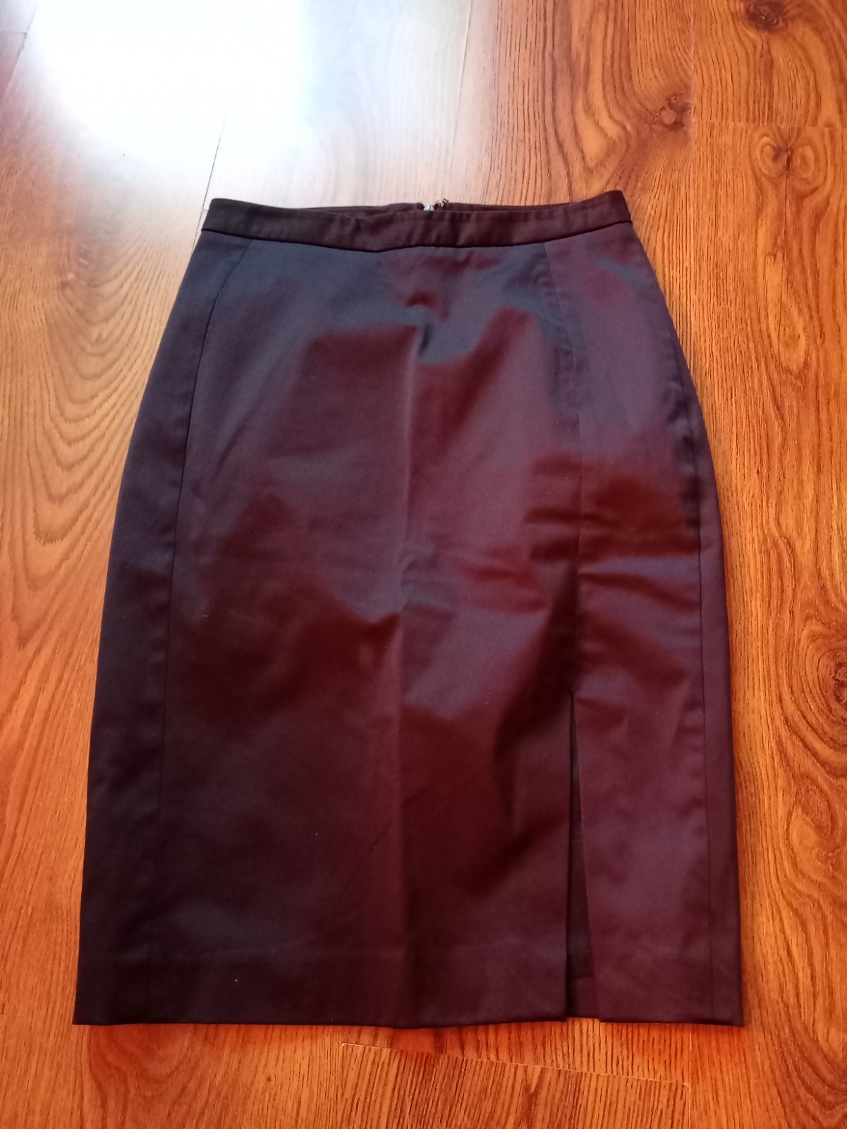 Kvalitná sukňa čiernej farby (na foto je svetlom akoby svetlejšia- nešlo to lepšie nafotiť, ale aspoň vidno aj rozparok). Dĺžka: cca 59,8 cm Rozparok vľavo dlhý cca 19,3 cm Obvod pása: cca 68 cm V ...