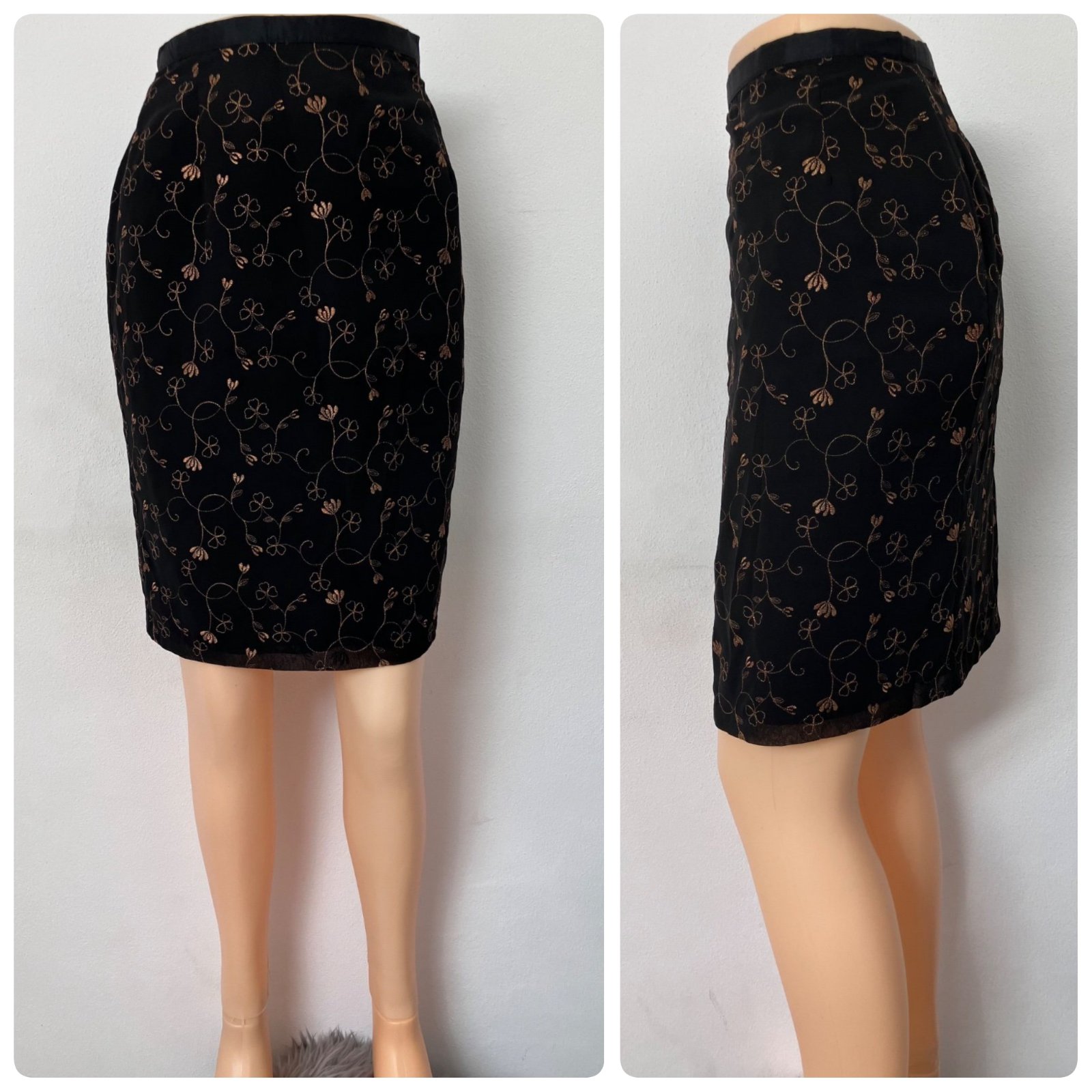Dámska čierno-zlatá puzdrová sukňa, vhodná na príležitosti aj na bežné nosenie, tenká, nie je elastická, zapínanie vzadu na gombík a na zips, materiál 100%polyester.