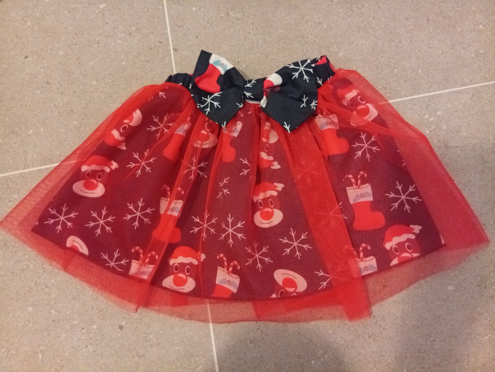 Asi 3x oblecena sukňa,vždy len na Vianoce, písaná veľkosť 86, ale obliekla ju v pohode aj moja 4.5ročná, v páse gumka. Trošku skreslená farba na niektorých fotkách, v skutočnosti klasická vianočná ...