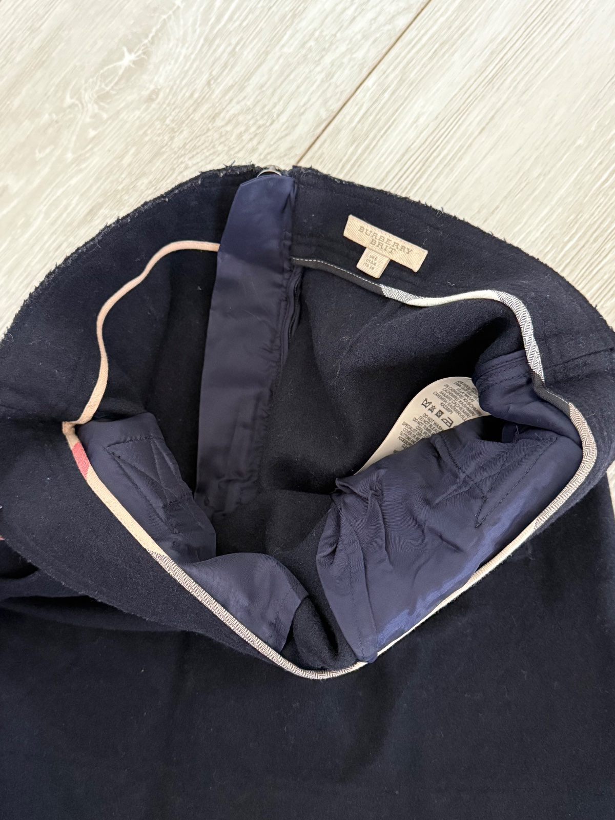 Krasna tmavomodra vlnená sukna Burberry Brit. Predný diel vrecká, v zadu zips. Velmi dobrý nosený stav. Velkost IT 38. širka pas 38 cm, dĺžka 40 cm.