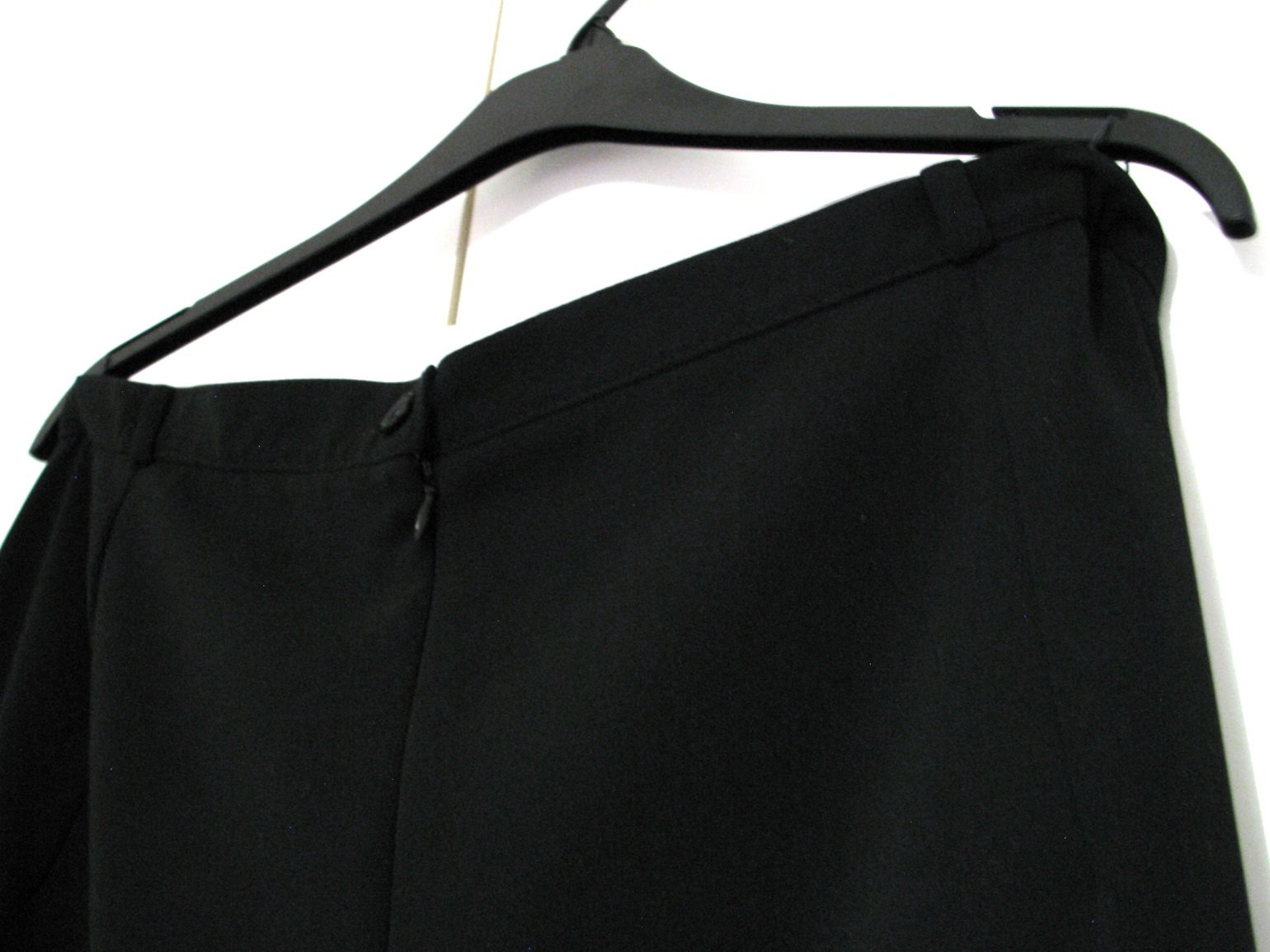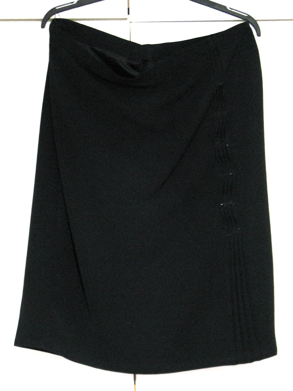 Čierna puzdrová midi sukňa, vhodná na spoločenské príležitosti či do divadla. Na boku má ozdobné sklady prešívané do vlniek a aplikácie štrasových kamienkov čiernej farby. zapínanie vzadu na zips, má aj podšívku. Výborne zachovalá, bez poškodení. Veľkosť uvádzam odhadom, na štítku píše perom 52, či to aj sedí neviem. Rozmery: šírka v páse je 50 cm, šírka cca v bokoch 58 cm, dĺžka 70 cm.
