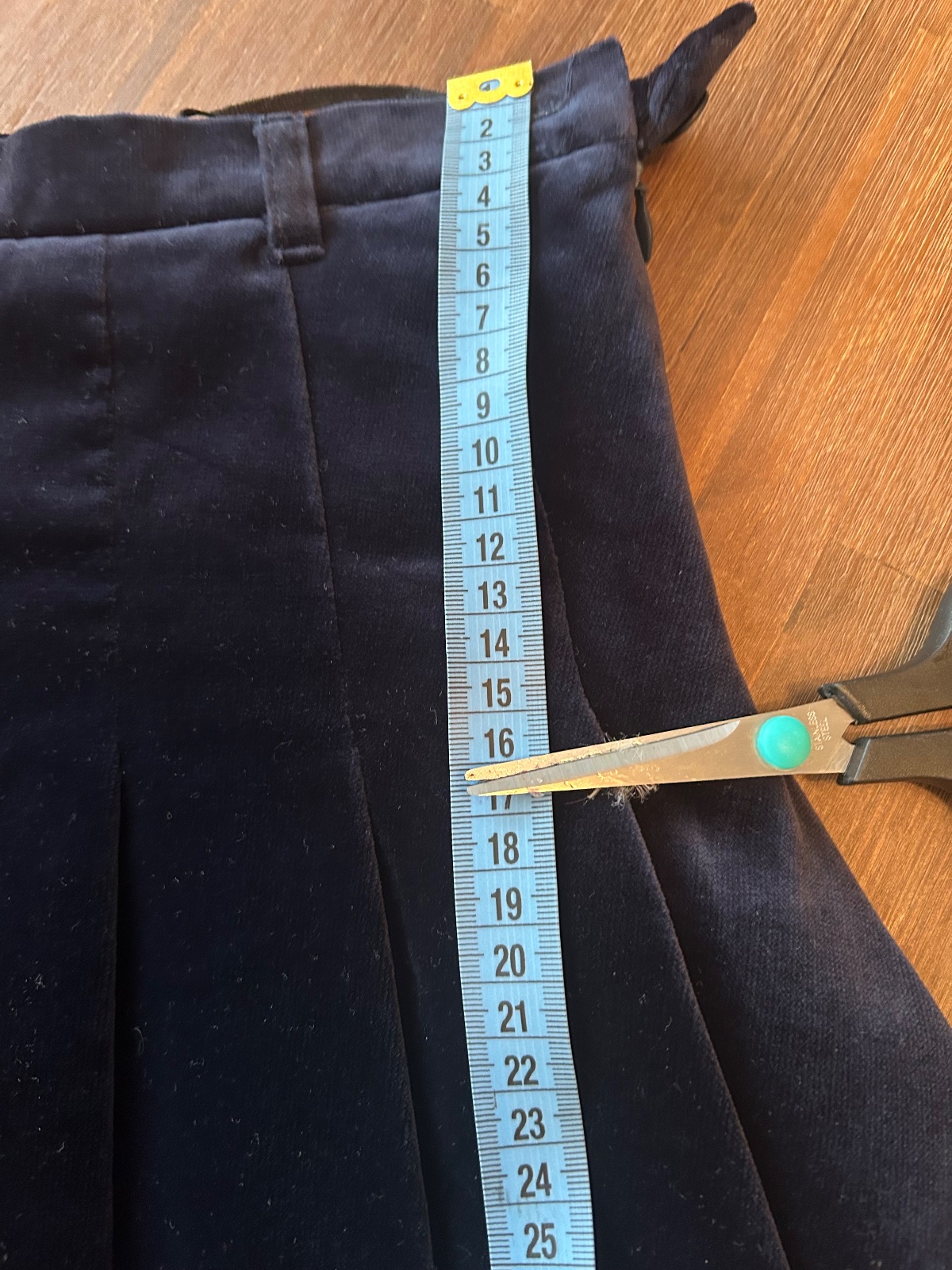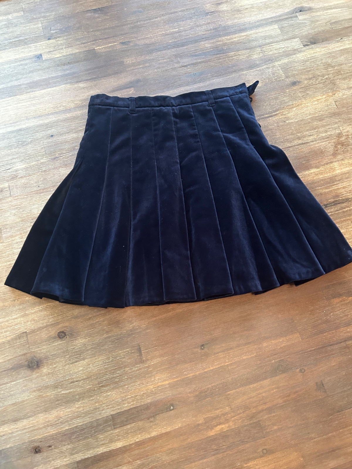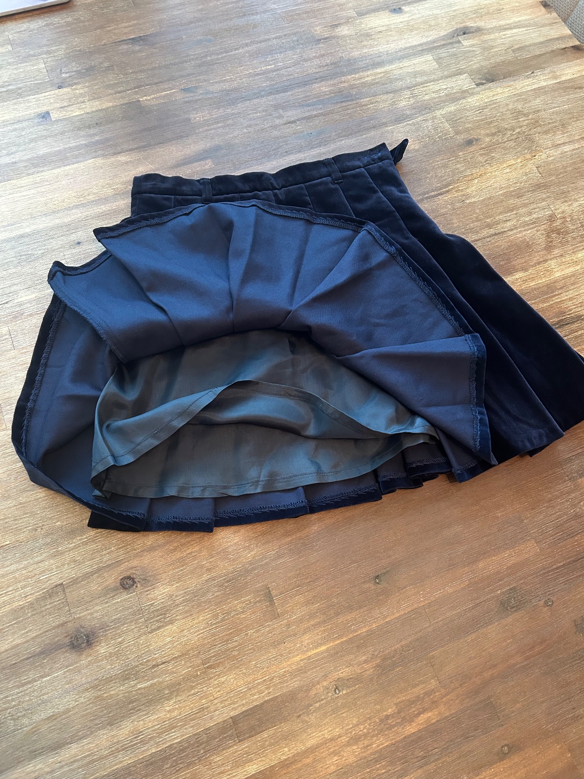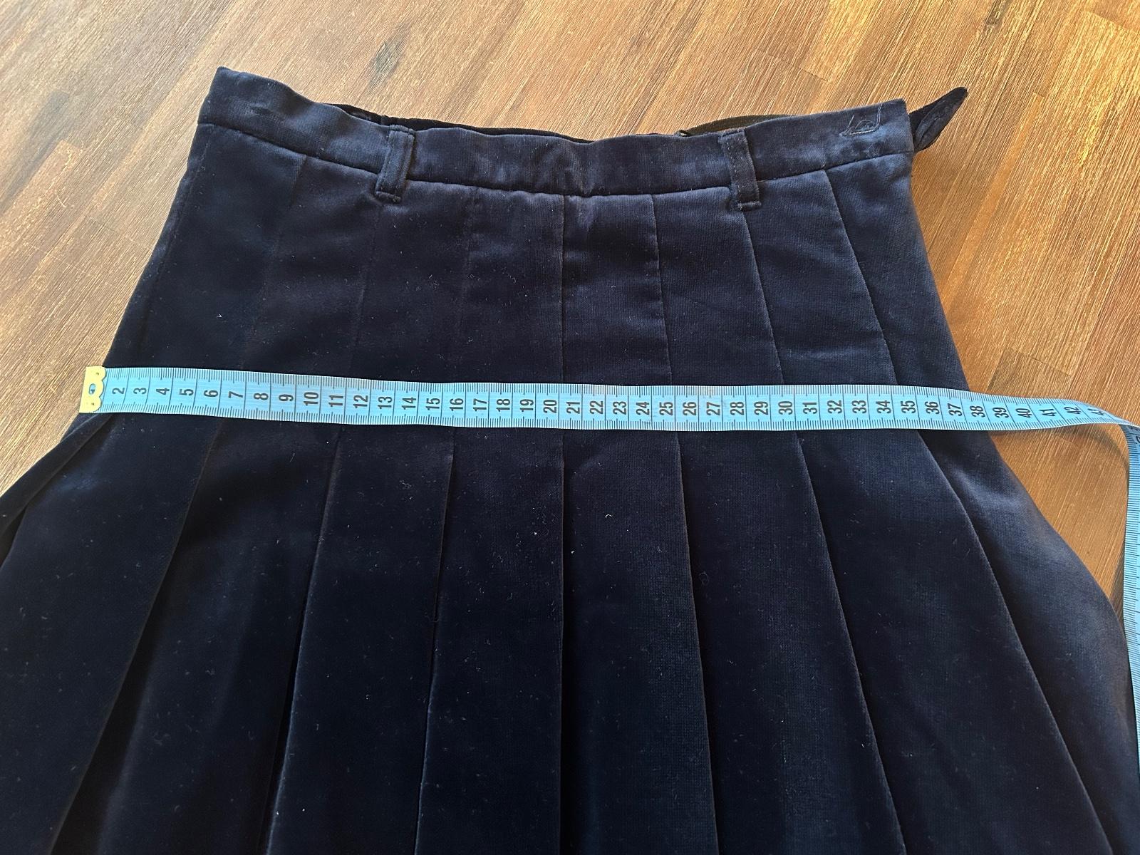 Krásna zamatová sukna skladaná, podšita spodnickou. Na boku zapínanie na zips a gombík. Na bokoch sa rozširuje do A tvaru. V pase na regulovateľnú skrytú gumičku. Dĺžka 43cm , šírka v bokoch 38cmx2, pas 64cm
