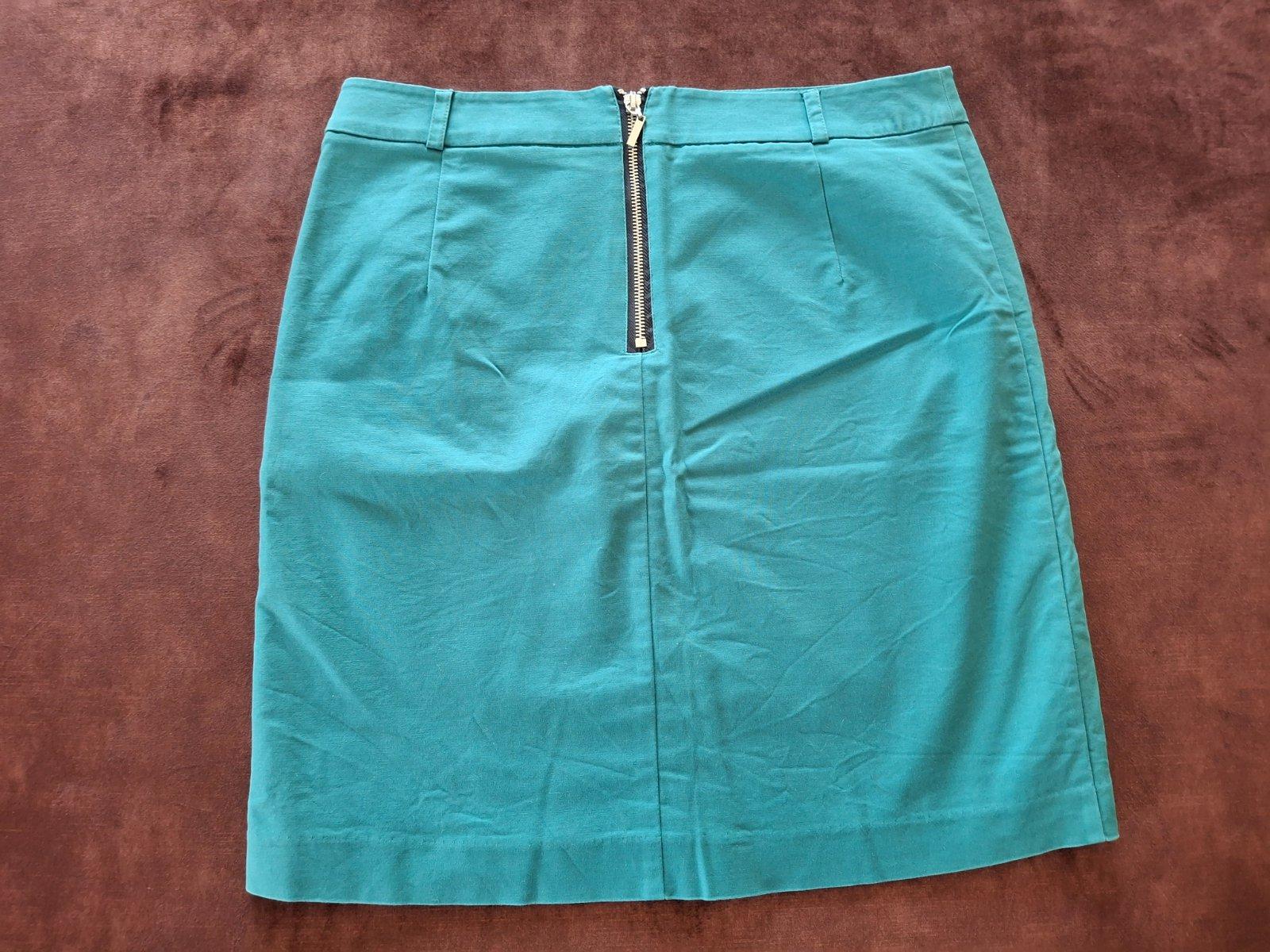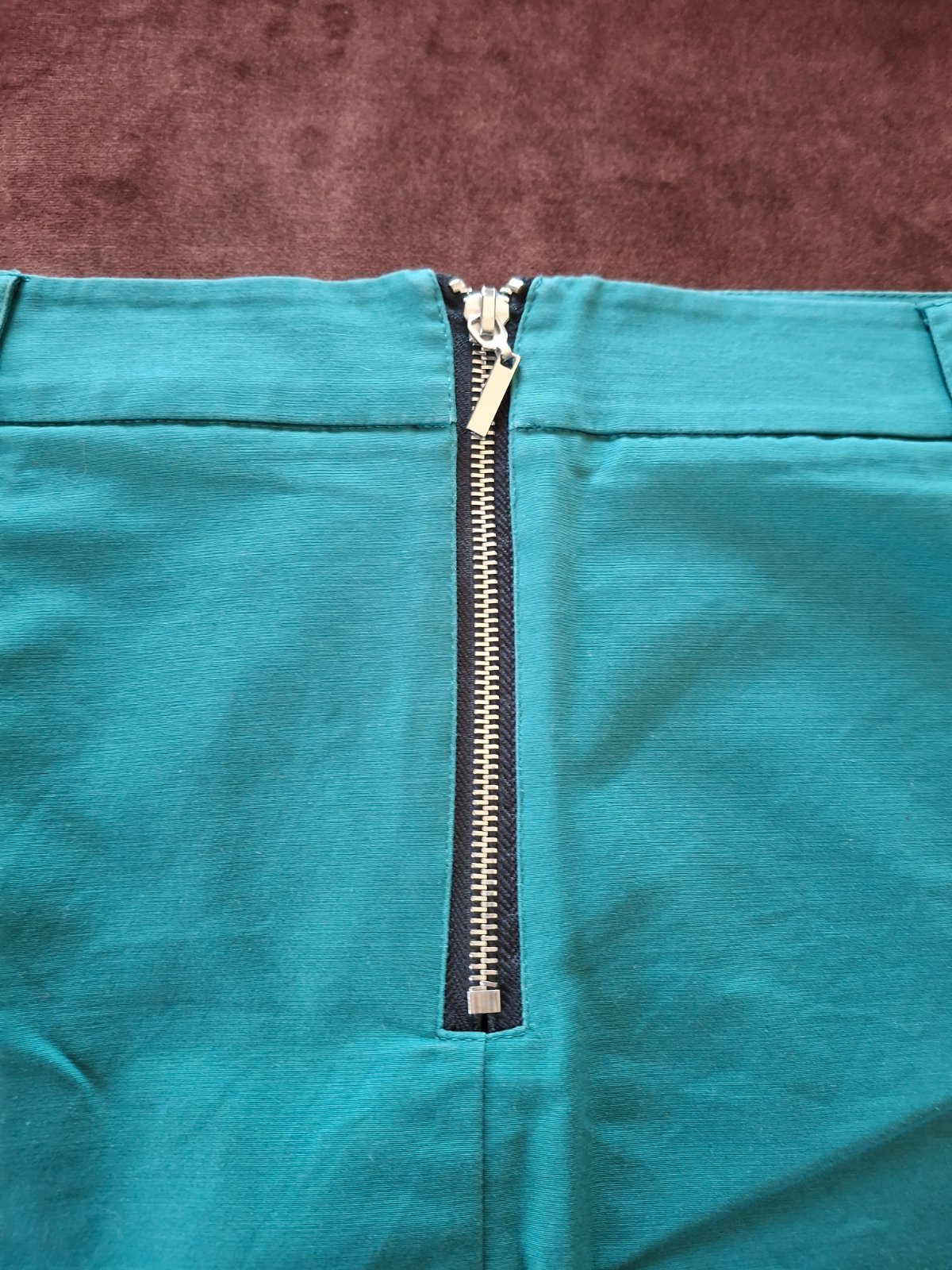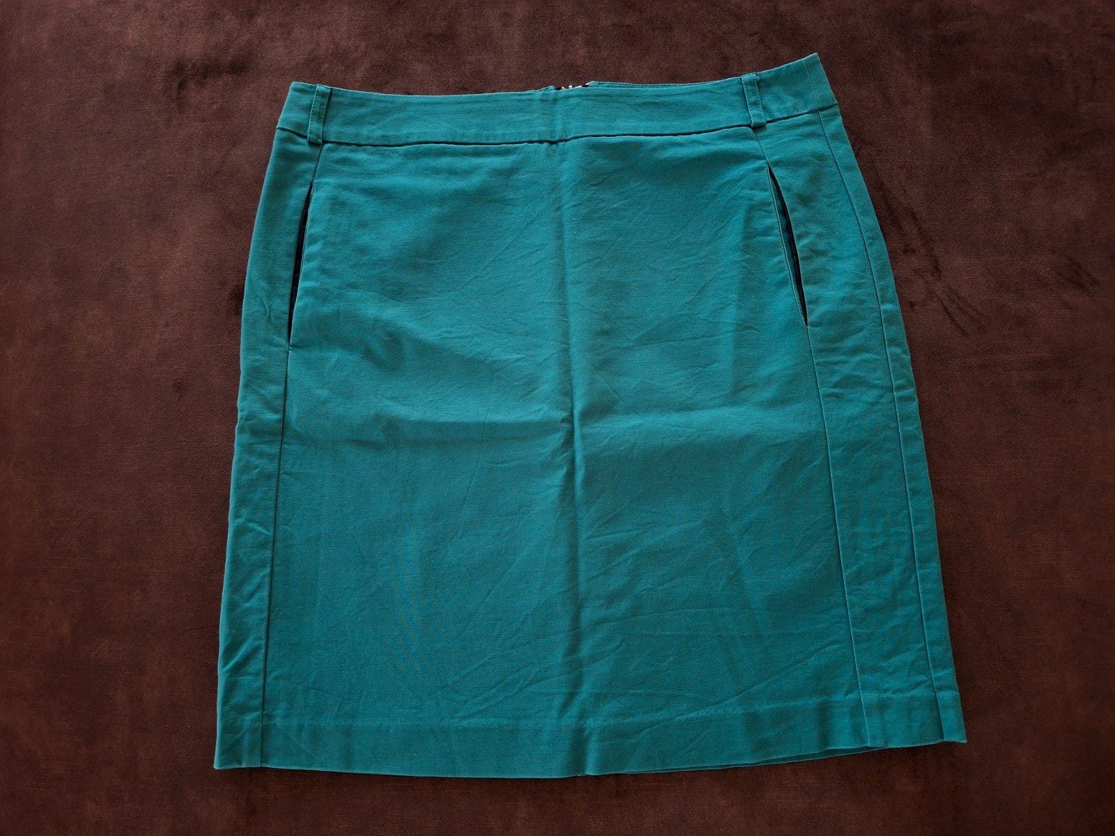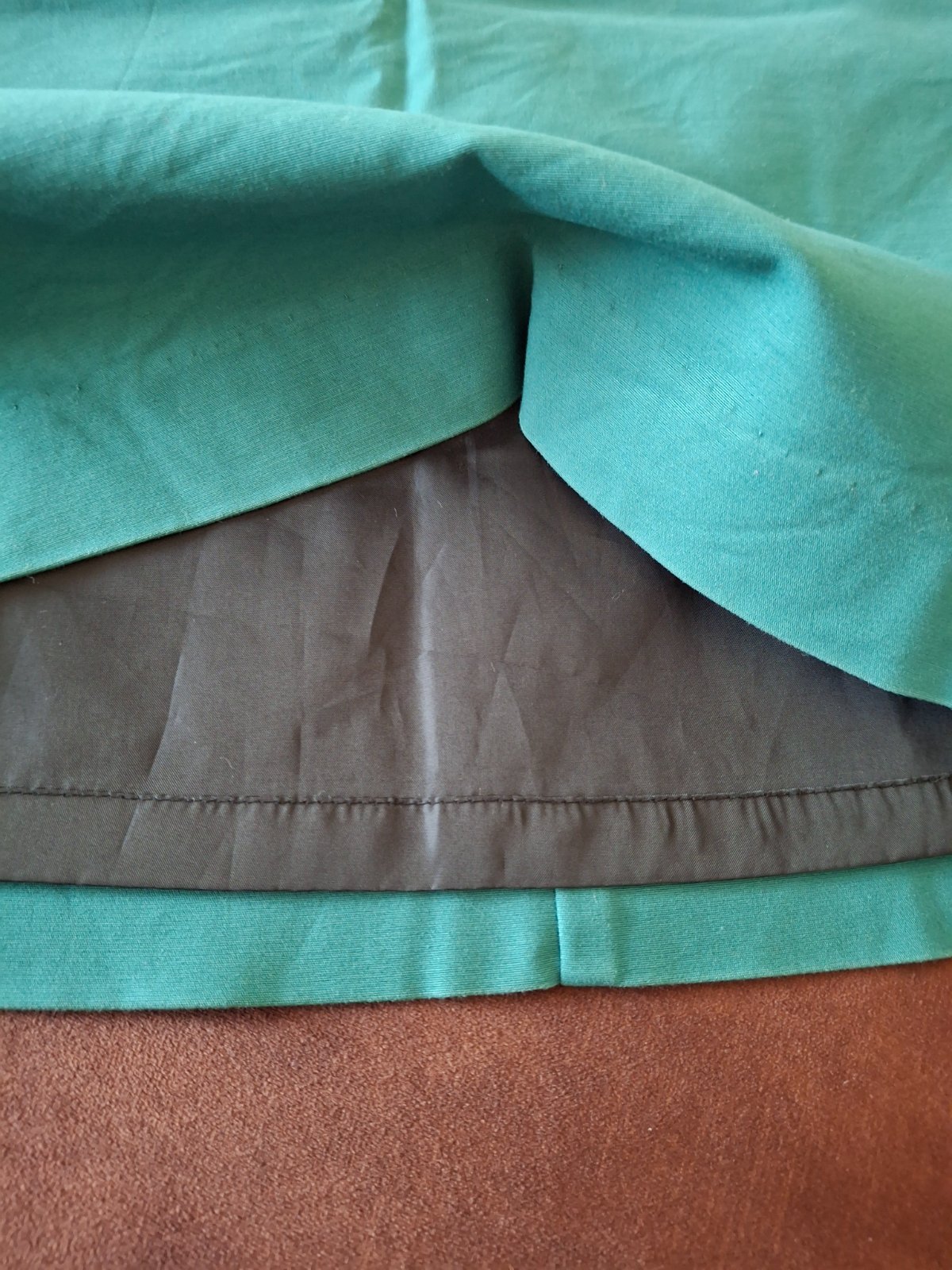 Sukňa mierneho A strihu, oblečená párkrát, takže v bezchybnom stave. Vrecká po stranách, plus tenký opasok zelenociernej farby, zips priznany vzadu. Čierna spodnica, pevnejší materiál. Pás 40 cm, šírka na spodku 51 cm, dĺžka 49 cm.