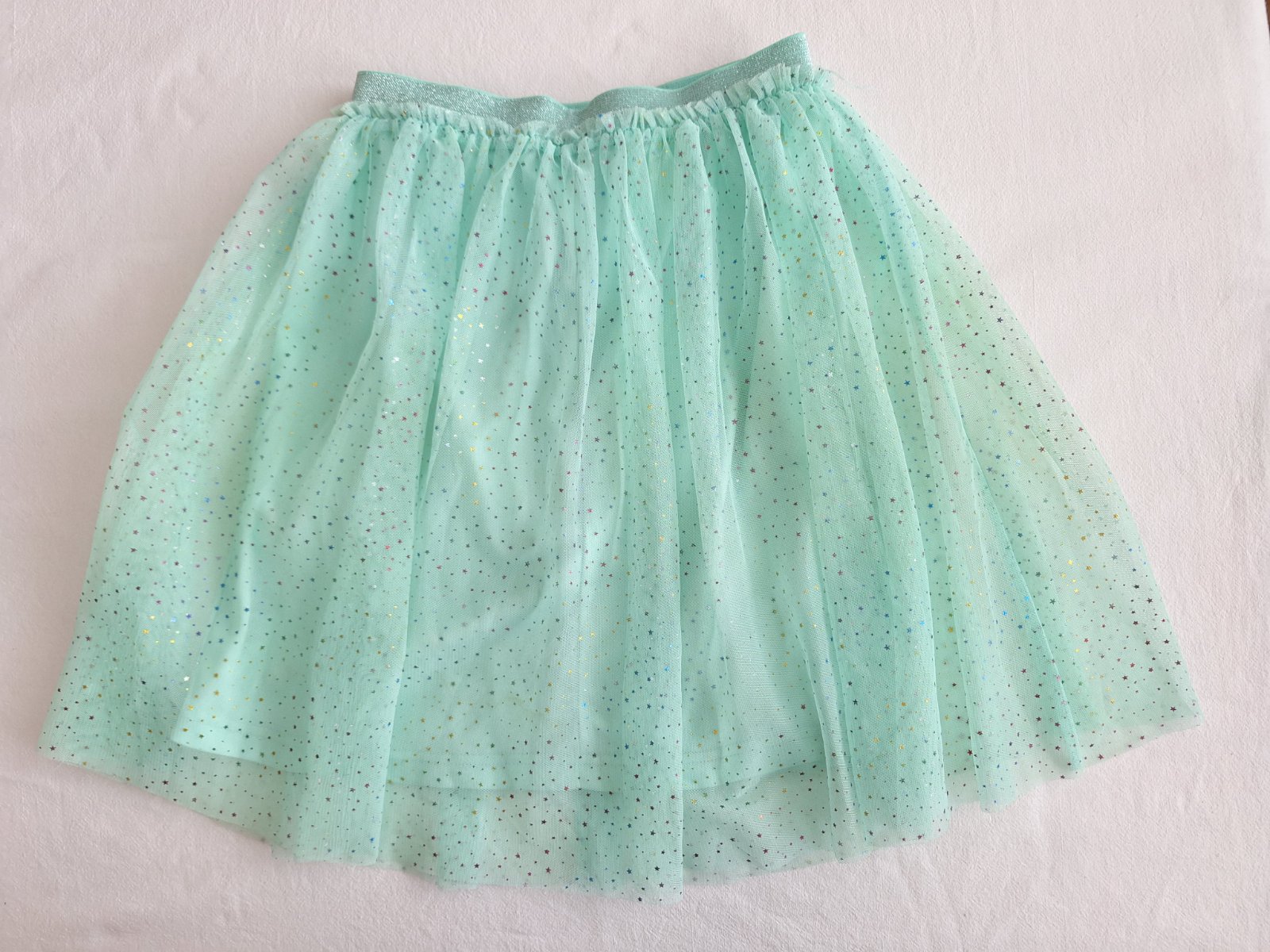 Krepova vrstvova sukna, dlzka 37cm, sirka pas 27,natiahne sa na 52cm, už len v bielo- bledozelenej farbe.1xoblecena.