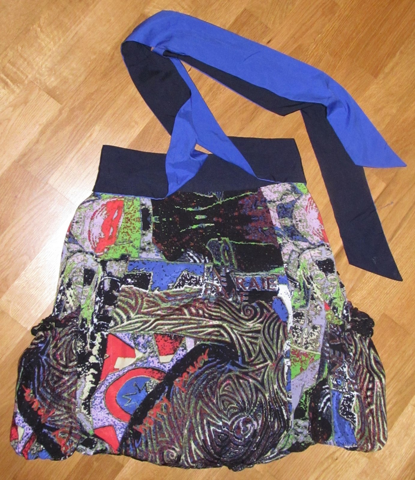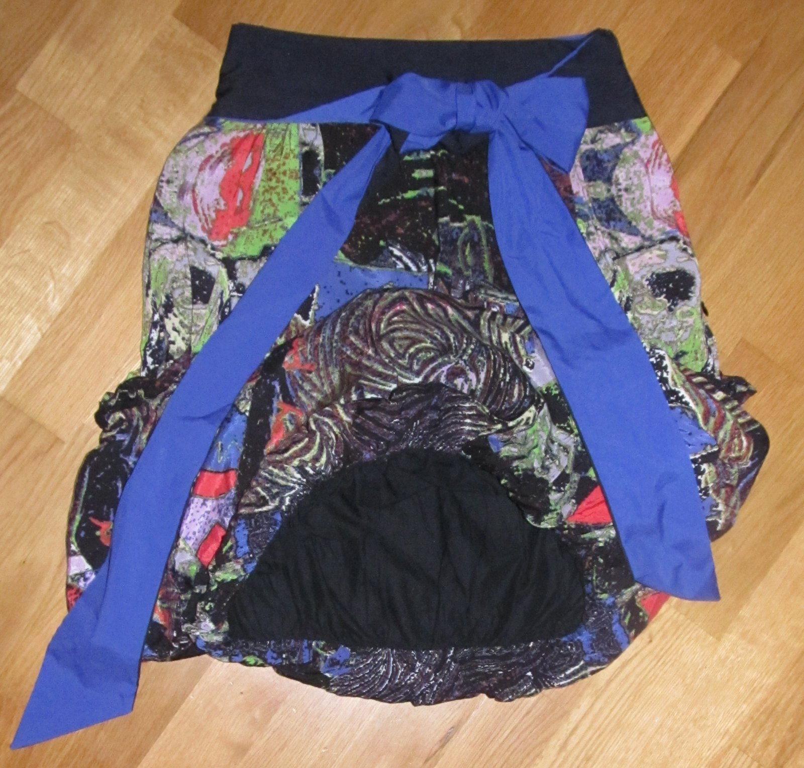 Par krat oblecena, podsita sukna, s riasenim na podsivke. Balonovy efekt je velmi mierny, kedze latka je padava. Dve zvonka nasite velke vrecka s ozdobnym riasenim na hornom okraji (zial tieto detaily na fotkach velmi nevidno ale v reali sukna ukaze krasne). Po bokoch su vsite "masle", cierno fialovej farby, masla sa da uviazat podla volby vzadu i vpredu. Obvod v pase 61 cm, dlzka 55 cm.