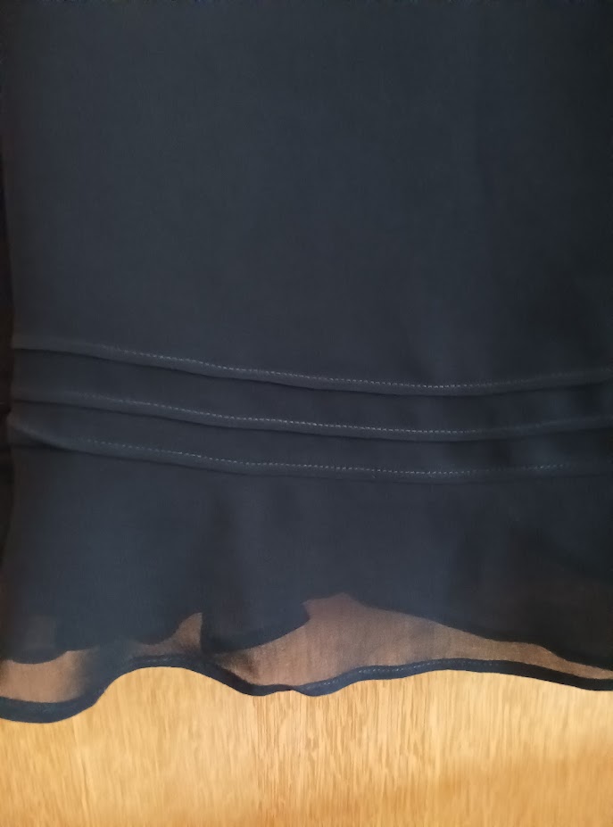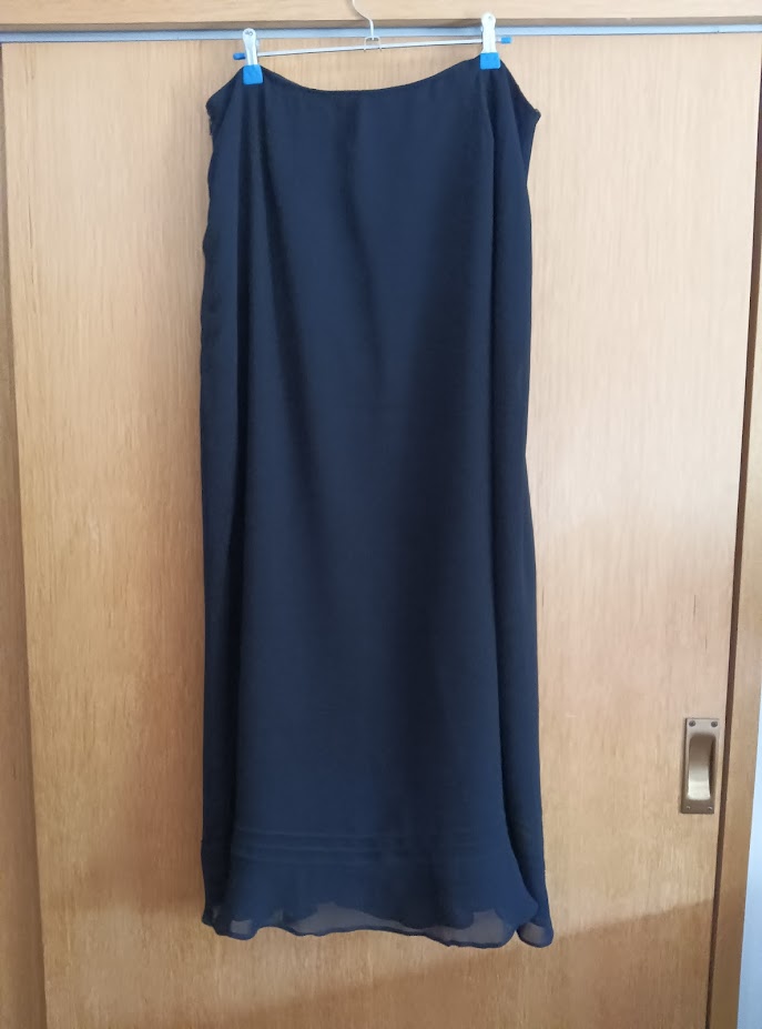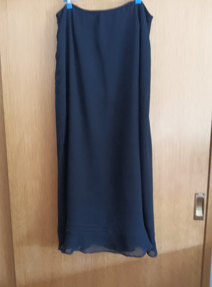 Pekná dlhá sukňa s tenkého materiálu s podšívkou, dole má krátky volán. Zips na boku, obv. pás: 45x2, dĺ: 97cm, boky : 64x2, dole 77cm x 2. Udaná veľkosť je 46-48, a UK 18