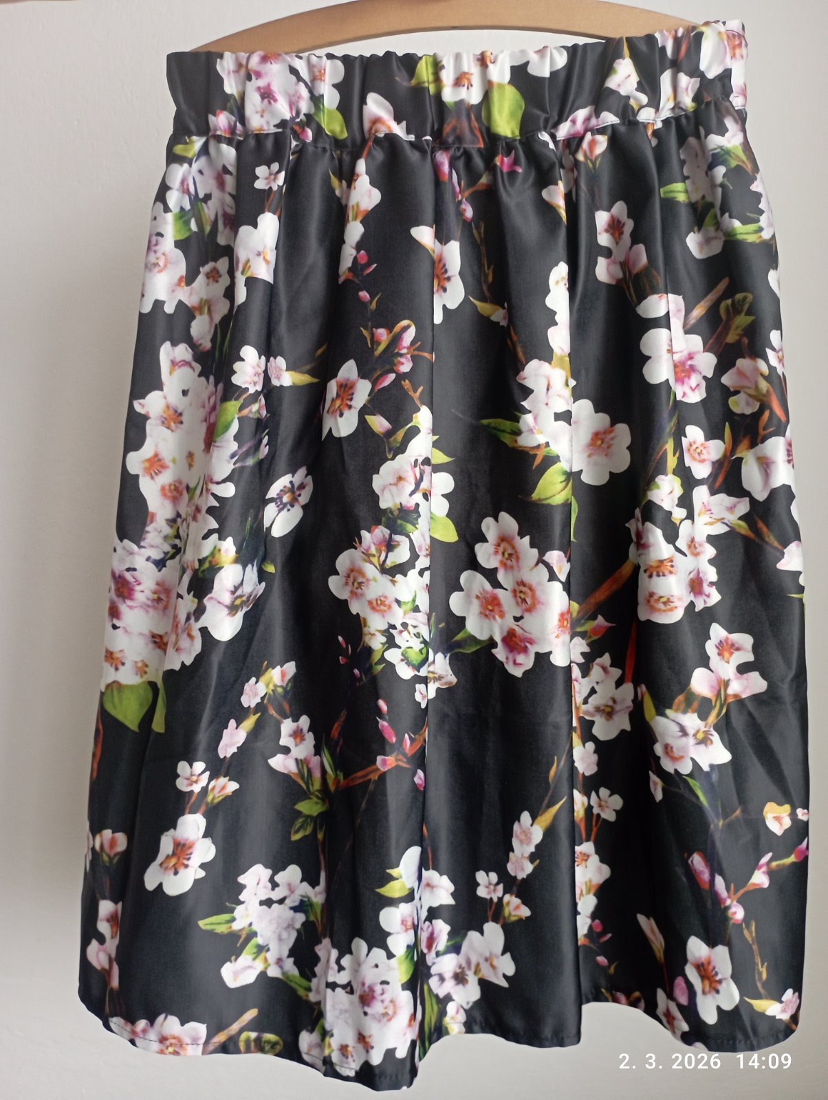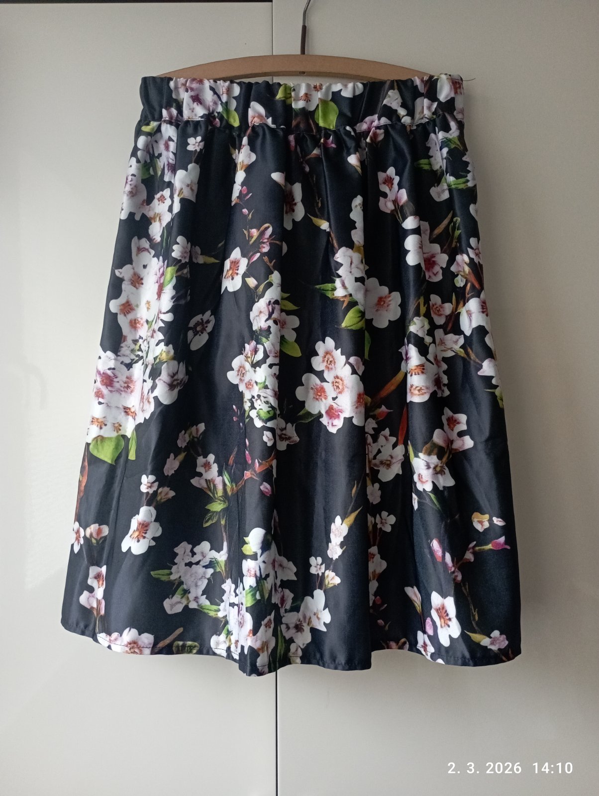 Sadne na S aj M, v páse je guma, ktorá sa dobre prispôsobí. Dĺžka je vhodná aj pre vyššiu postavu. Sukňa pekne ukáže s čiernym opaskom (doplním foto). Zips je na boku.