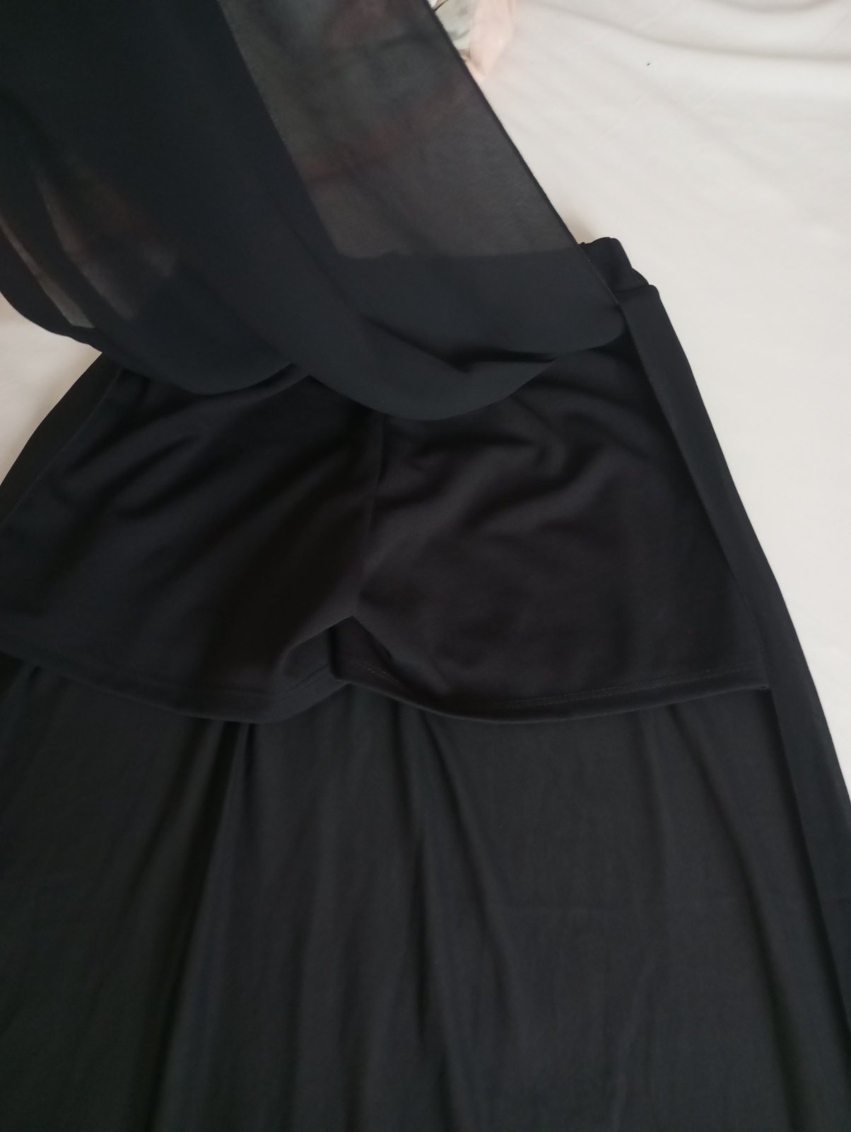 Nosená, veľmi zachovalá čierna sukňa s bielym kvetovým vzorom. Zapína sa v páse.