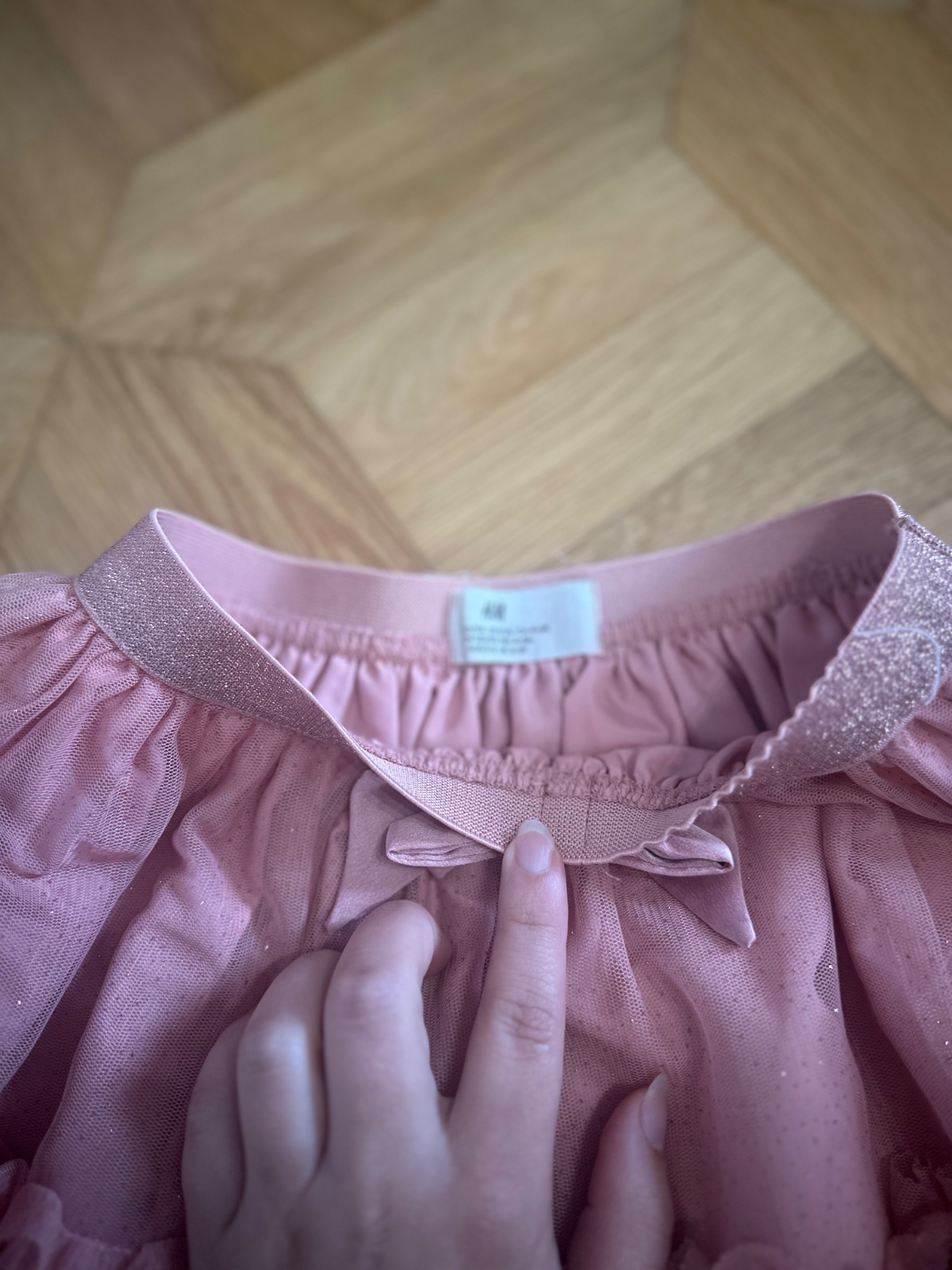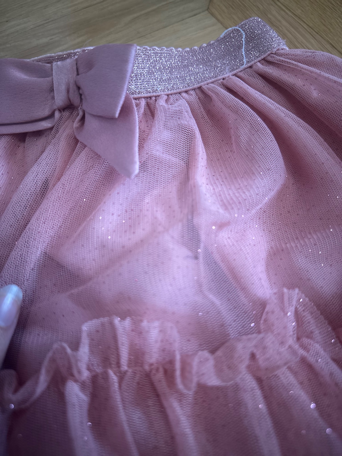 predám používanú nepoškodenú krásnu tylovú sukničku pre dievčatko svetlo ružovej farby s trblietkami zn. H&M veľkosť 110/116cm, pás gumičkový, šírka pásu v kľude je 28cm, ešte sa natiahne