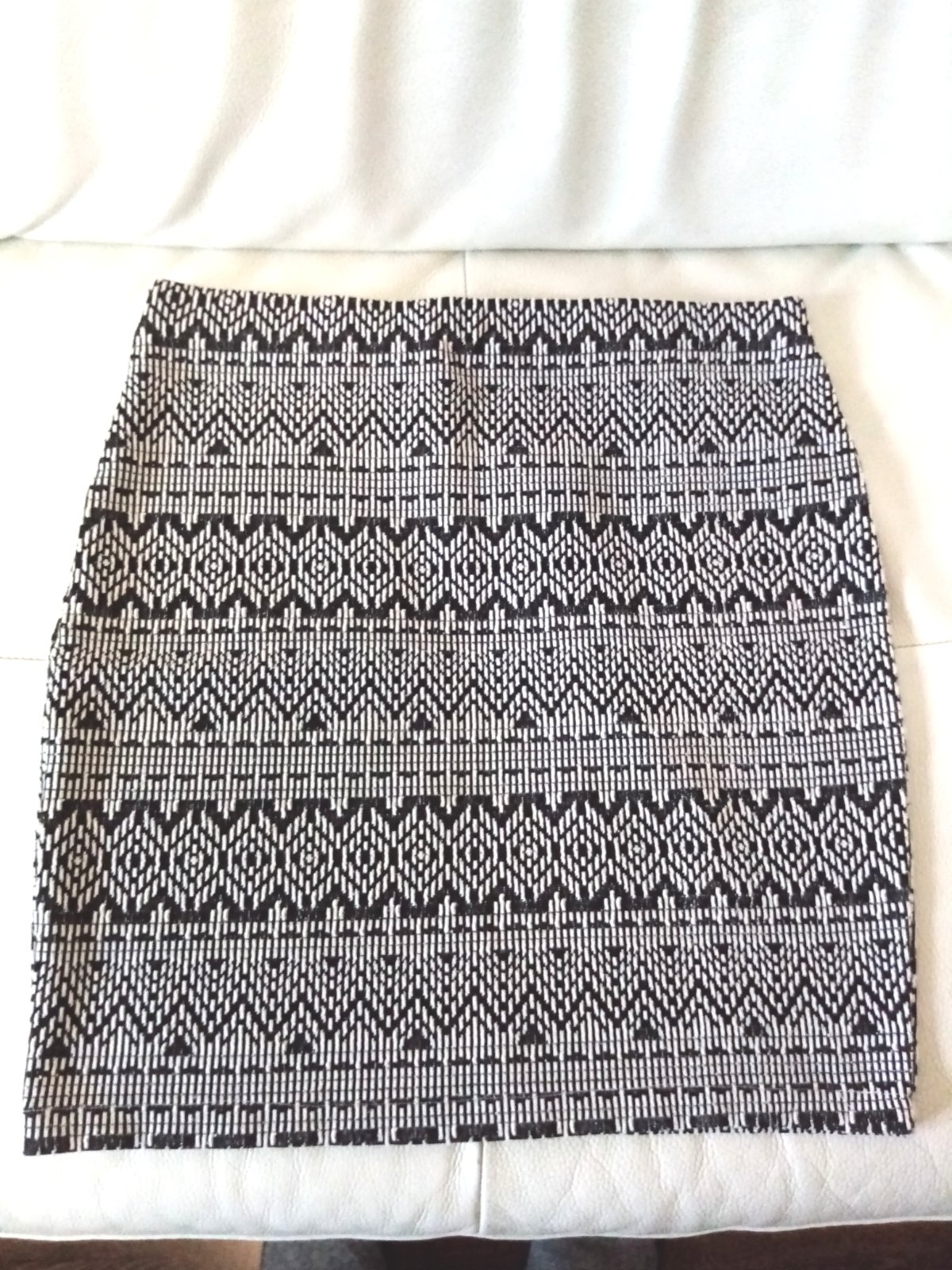 Kvalitná stredne hrubá sukňa čierno-bielej farby s podšívkou, v páse čierny koženkový lém, zapínanie vzadu na zips, materiál 74% polyester, 26% viskóza, super stav. šírka v páse39x2 cm, boky 50x2 ...