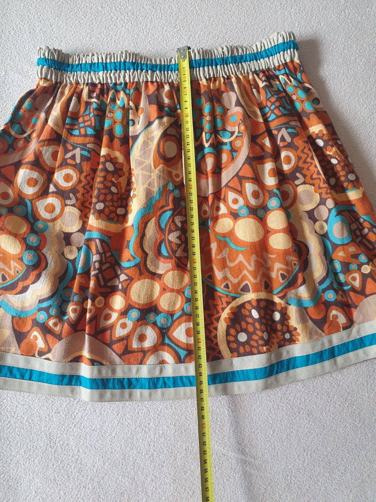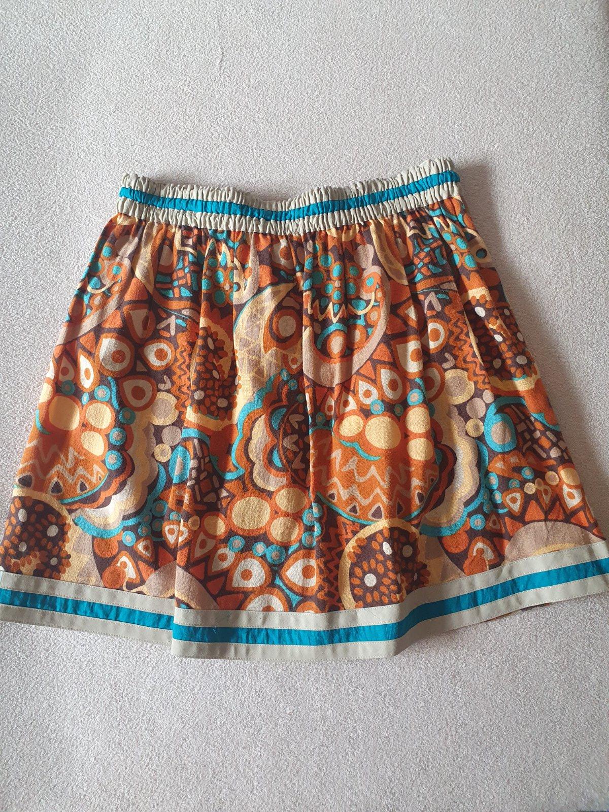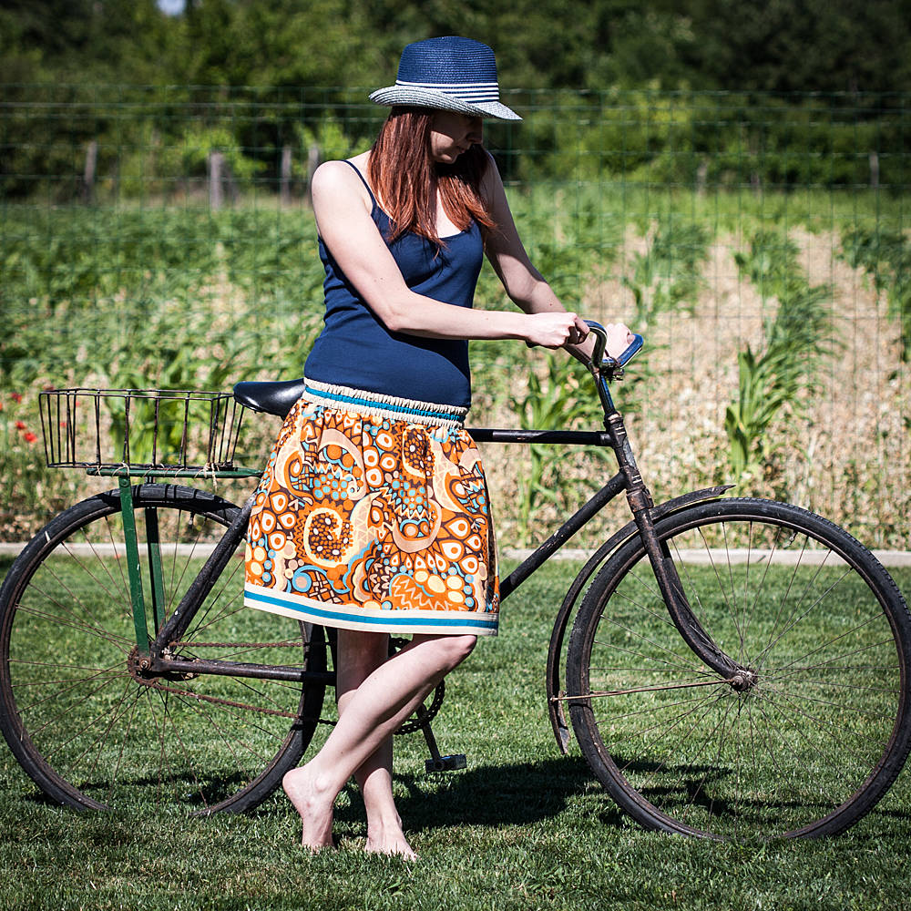 Sukňa je ušitá zo 100% bavlnenej látky, na spodnom okraji spevnená lemovkou. V páse stiahnutá gumičkou.