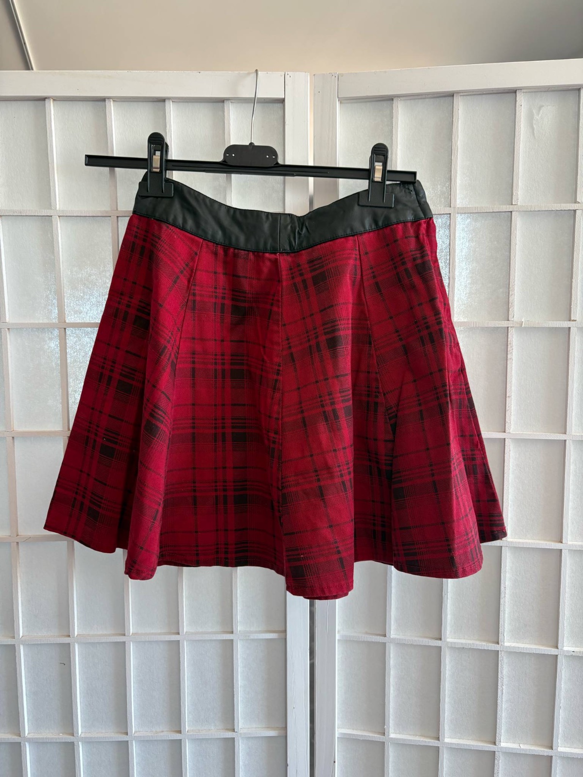 Tehlovocervena kockovana sukňa. Veľkosť S. Vpredu na zips. Vzadu 2 vrecká. Obsahuje elastan. Dĺžka 39 cm. Boky 92 cm, bedra 80 cm.