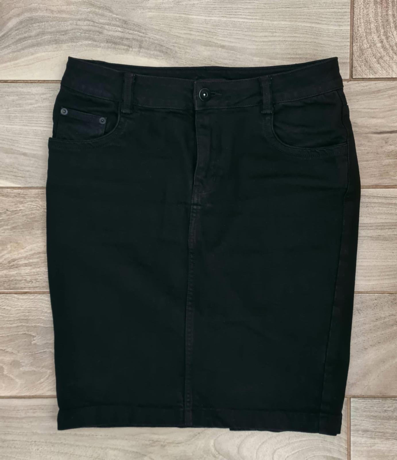 Elegantná čierna lesklá sukňa pod kolená so zapínaním naboku(zips a gombík).Vzadu je klasický rázporok.Ma vysoký pás a vpredu dve vrecká. Nosena bez poškodenia.