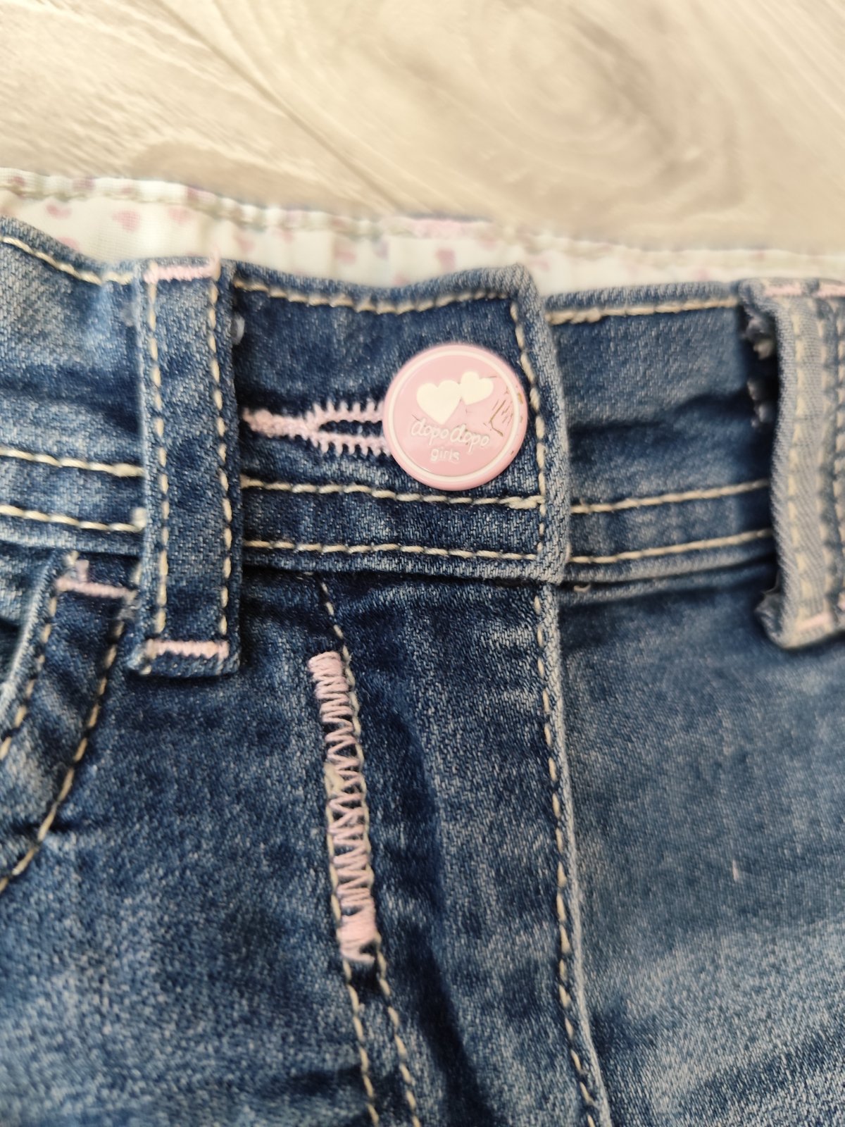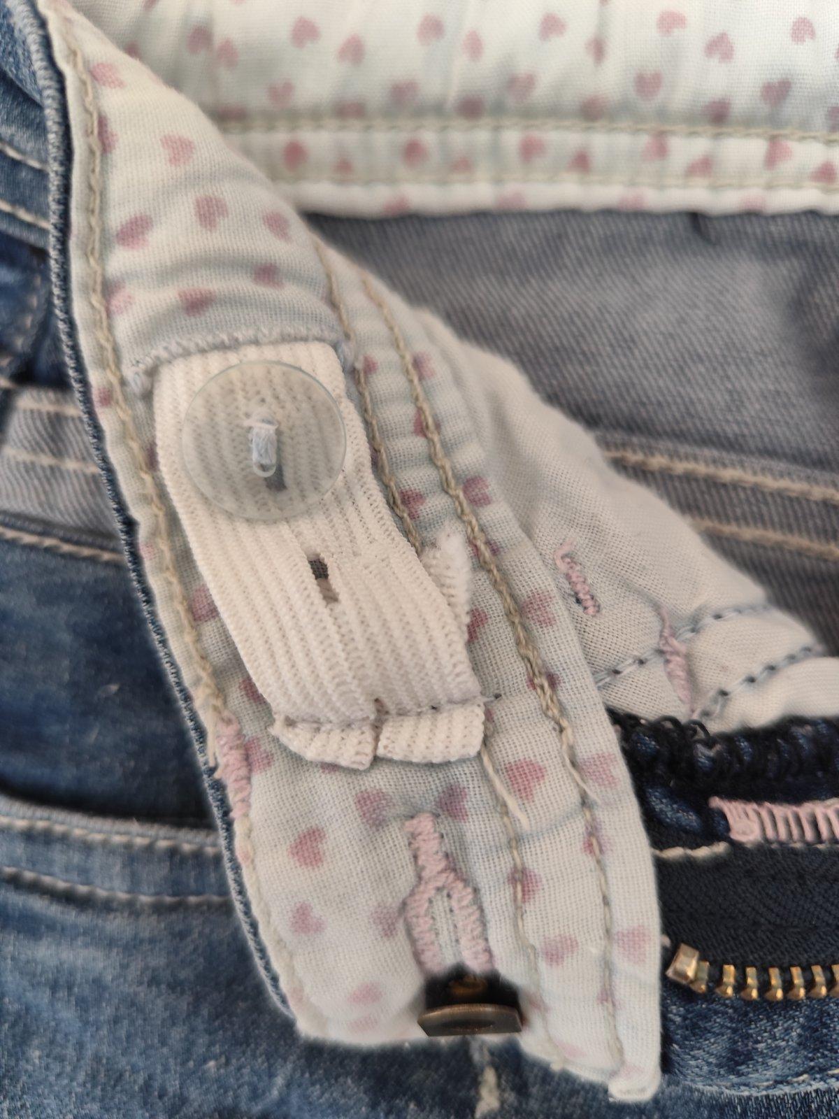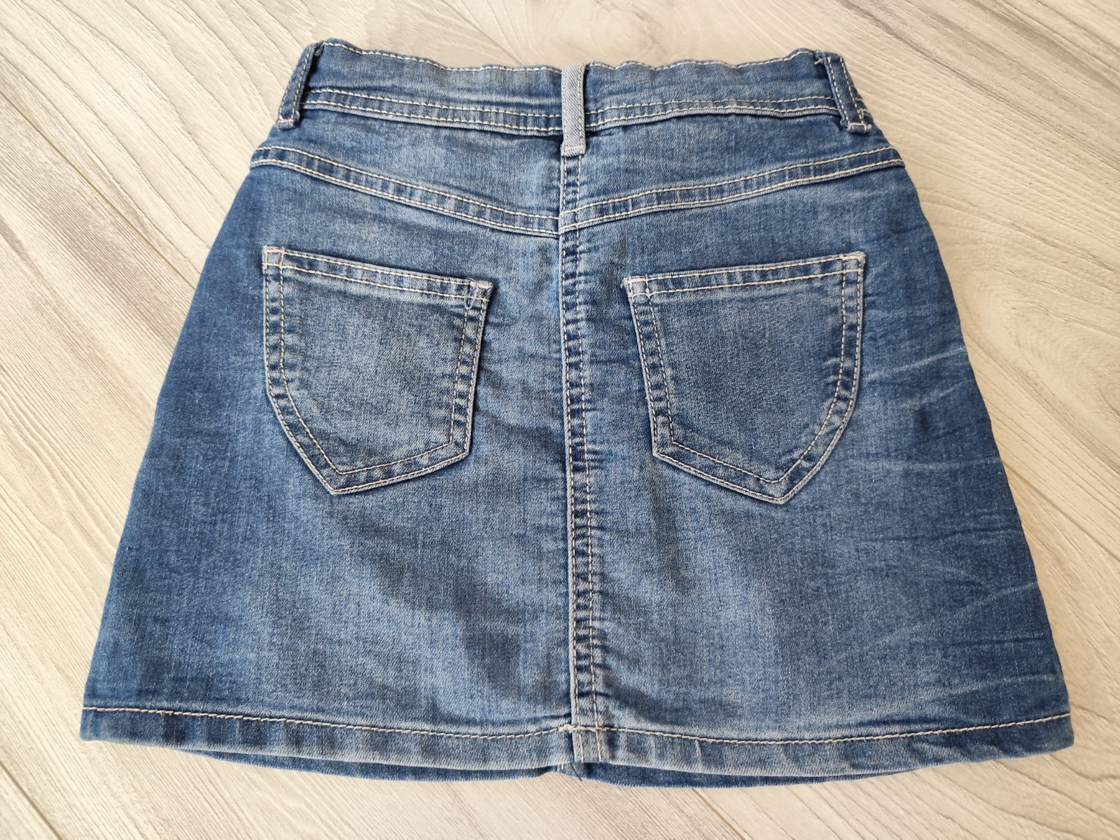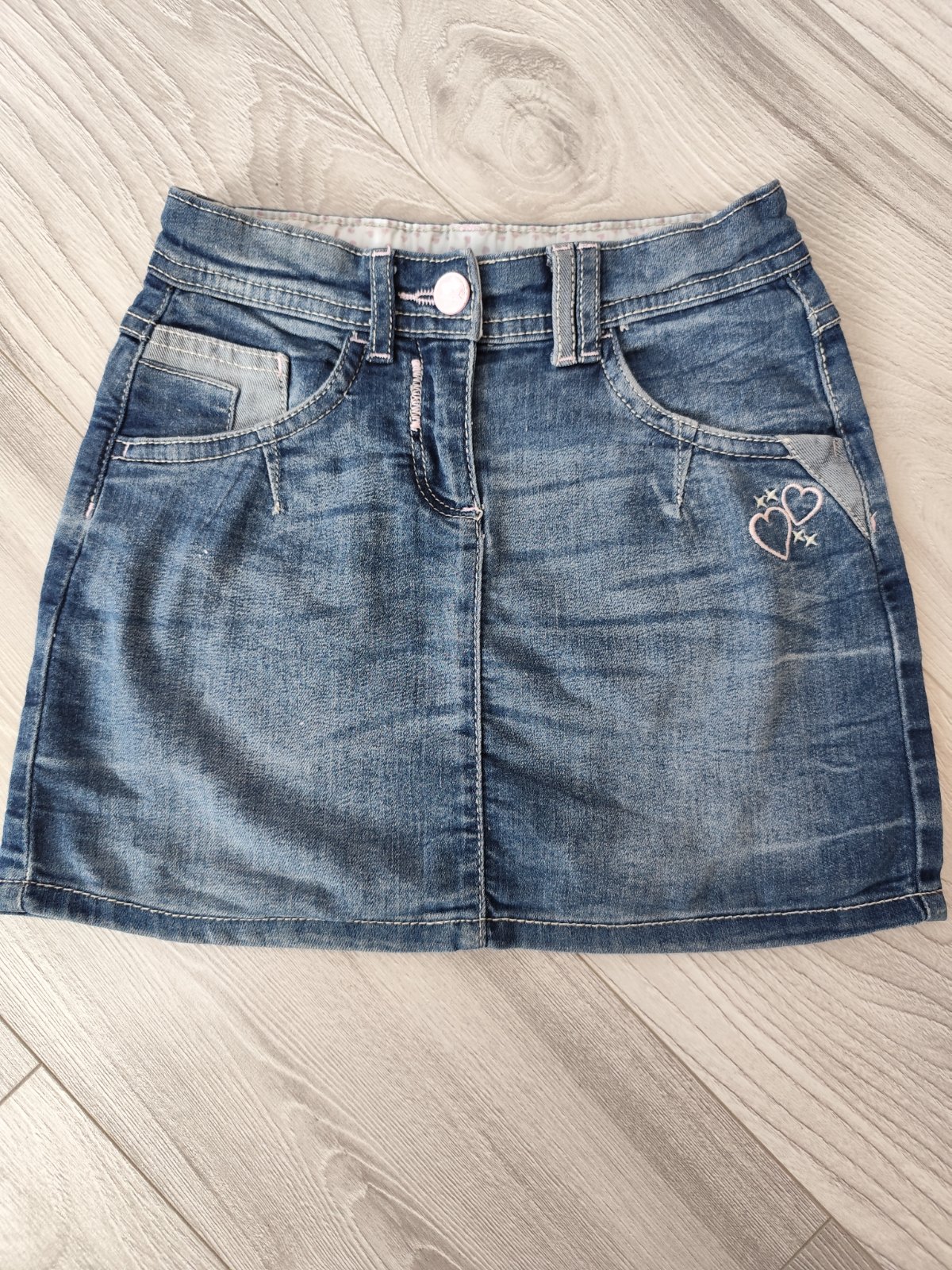 Dievcenska riflova sukna vel 128, s vreckami vpredu aj vzadu. Stiahnutie v pase (system gumicka s gombikom)