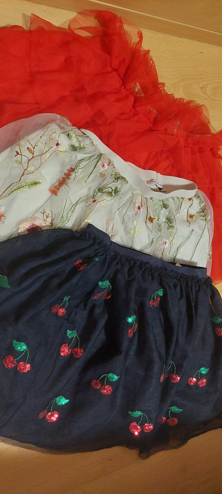 Predám sukne červenú, tmavo modrú a krásnu bielu s kvetinovým vzorom velk 128 spolu za 10,00 €.