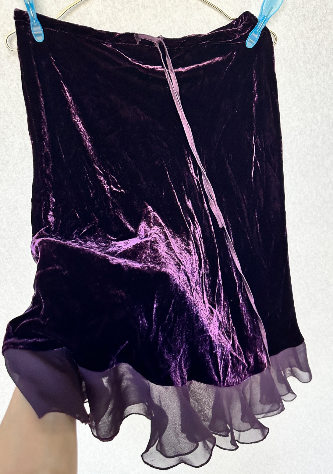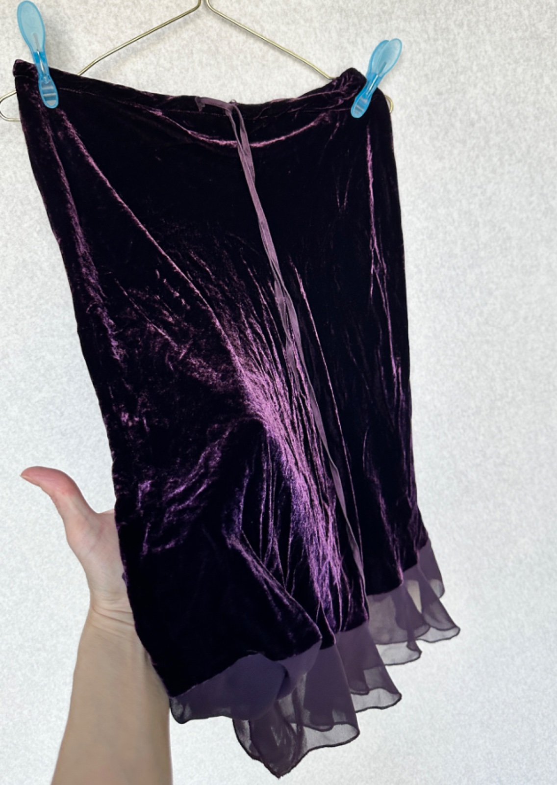 Padavá sukňa v krásnej tmavej baklažánovej farbe z viskózového zamatu. Volán a šnúrka v páse sú 100% hodváb. Látka je strihaná šikmo, takže sukňa sa prispôsobí obvodu.