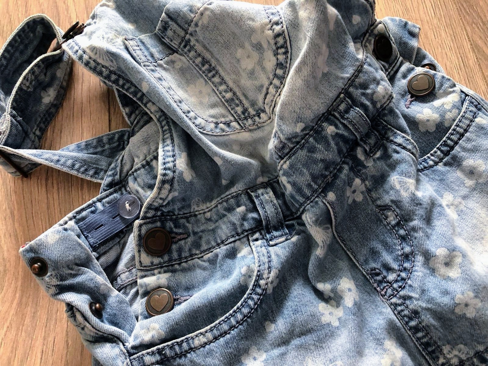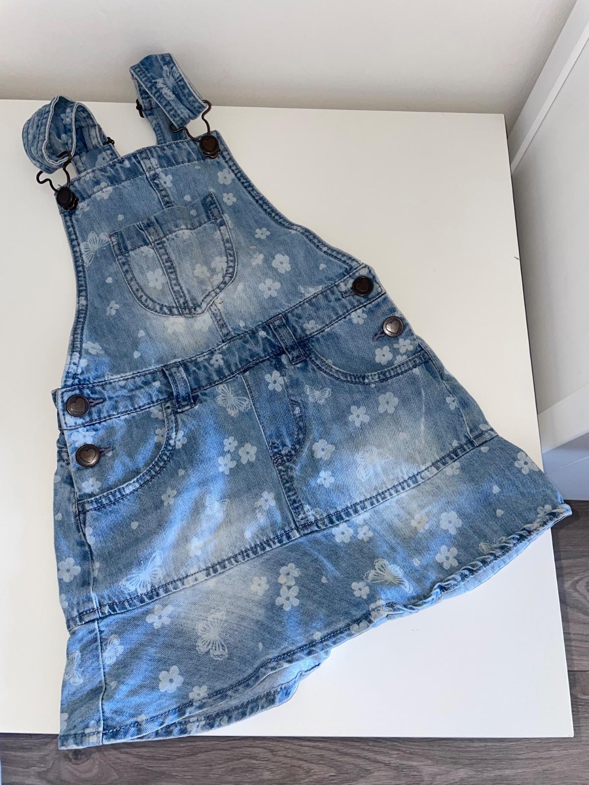 Džínsová sukňa na traky Dopodopo, vel.122. Traky nastaviteľné, pás prispôsobiteľný pomocou gombíkovej gumy, viď detailné foto. Jedno náprsné vrecko a dve na bokoch, príjemná mäkká riflovina. Top stav bez poškodení.