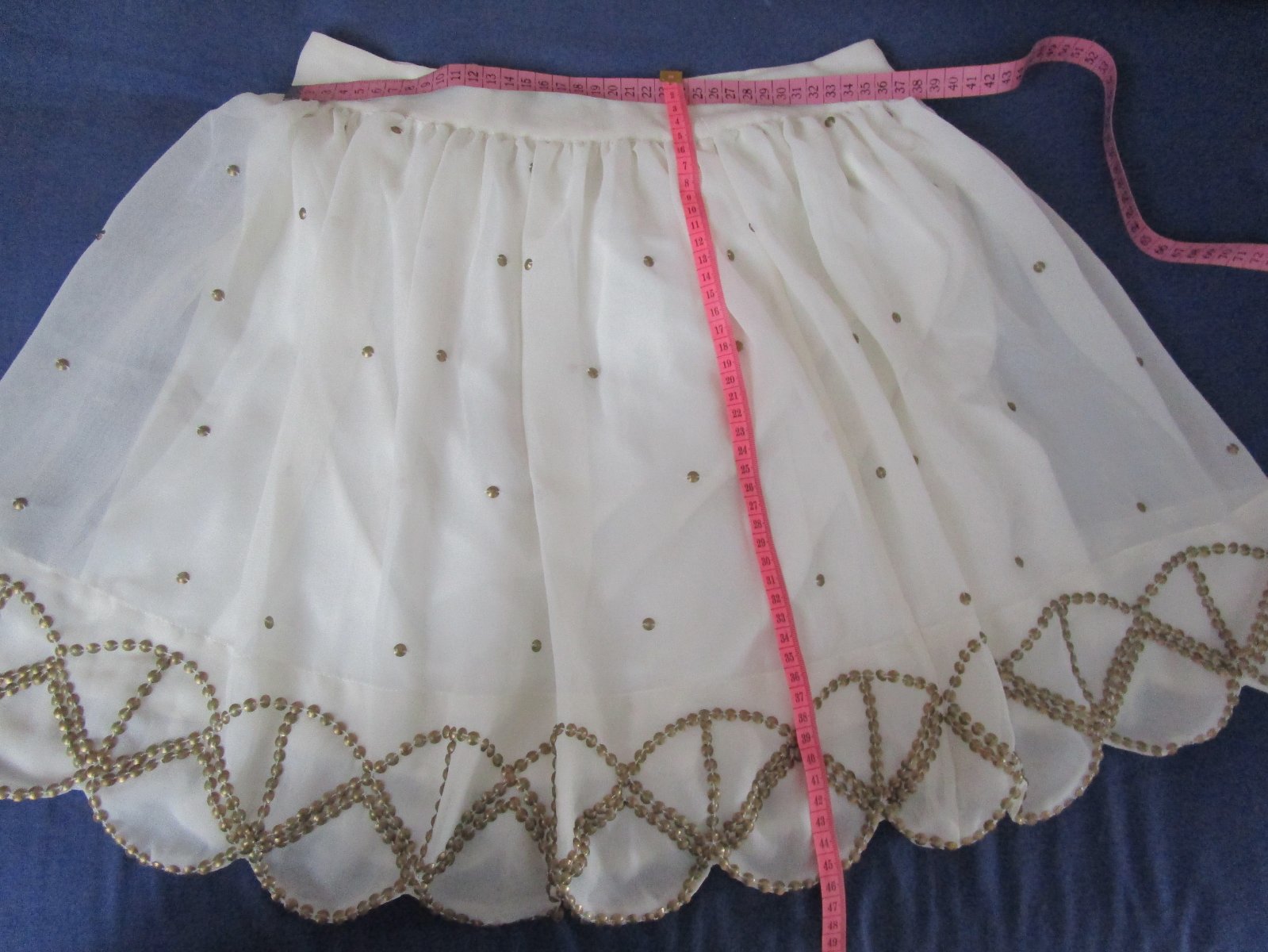 Jemný tenký žoržet. Podšitá, pás pevný so zipsom.