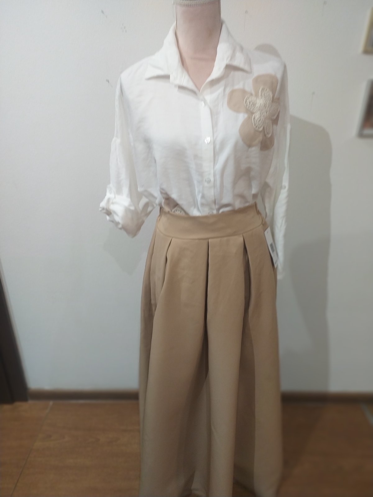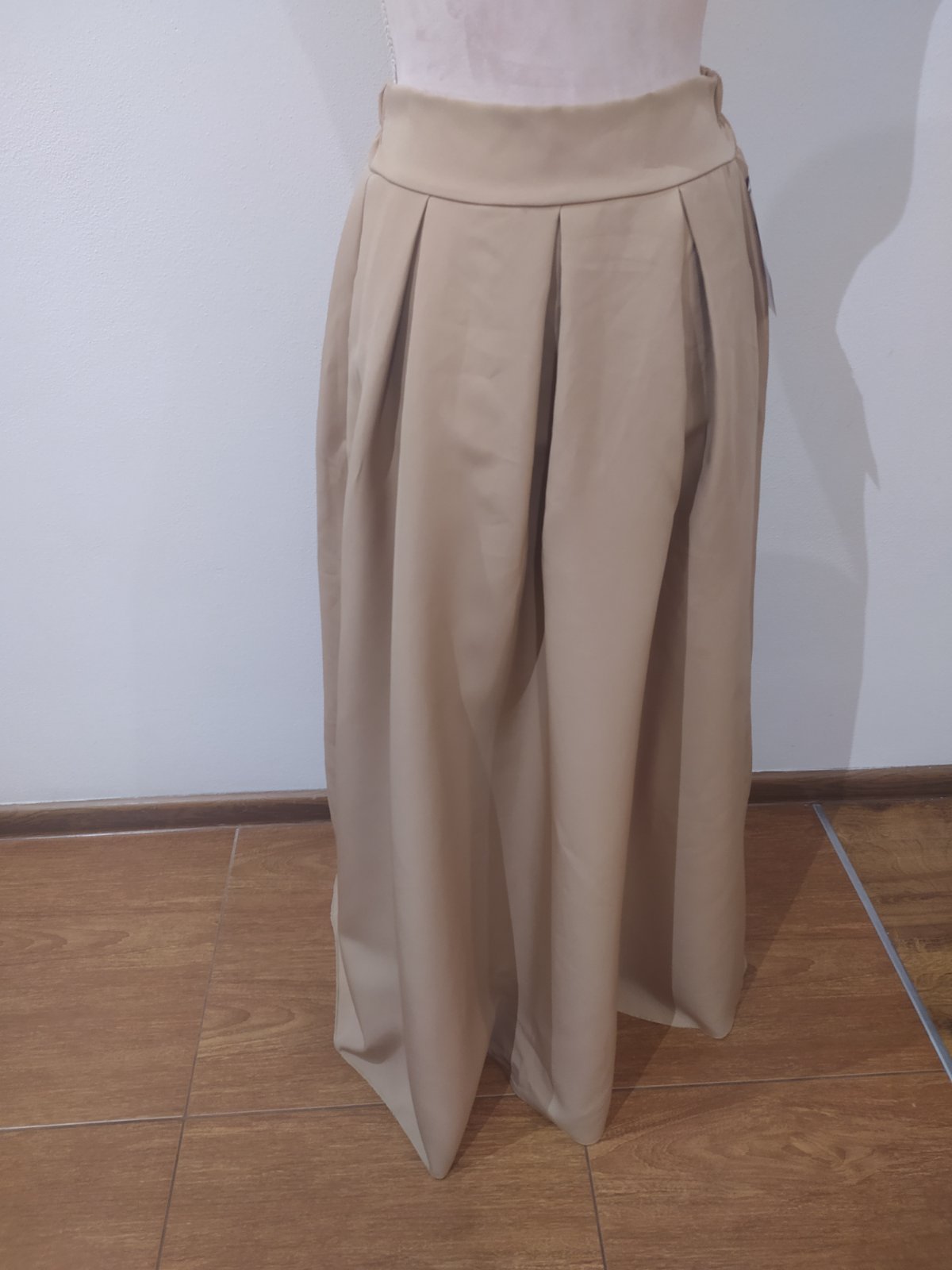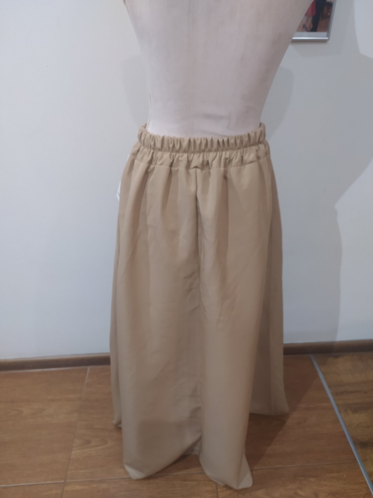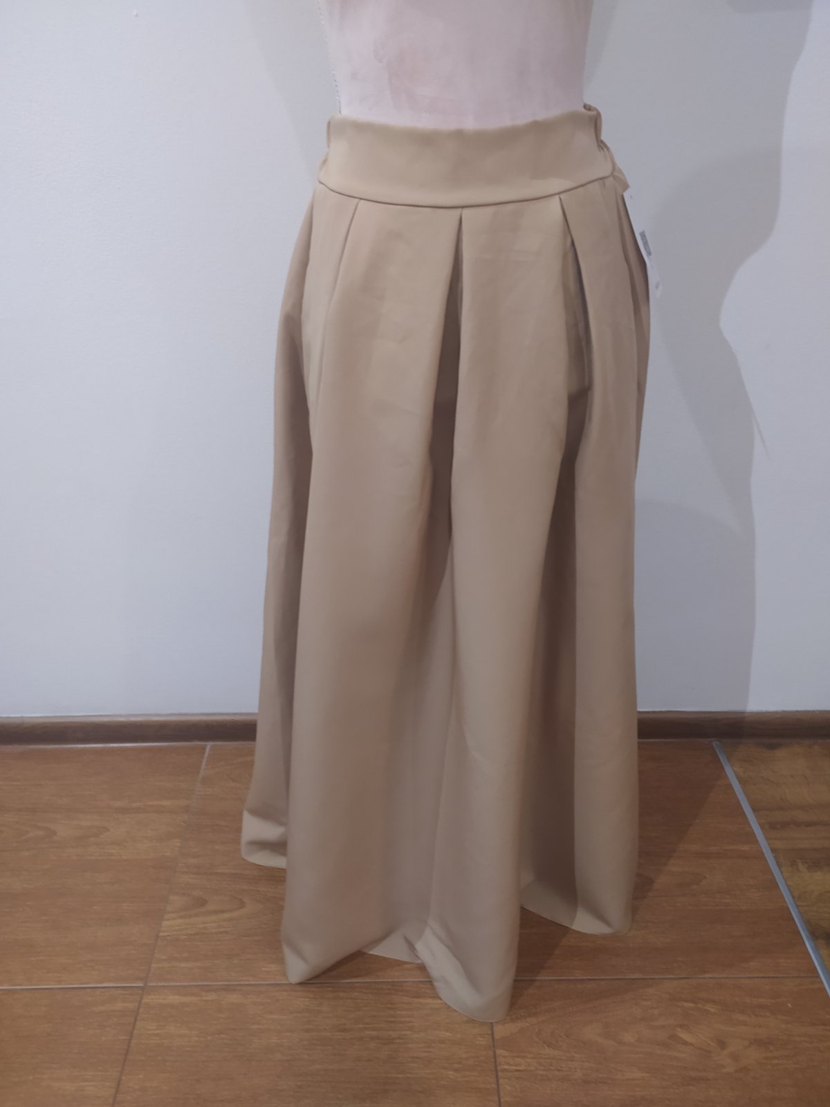 Sukňa maxi dĺžky , spredu skladana ,vo švíkoch vrecká.Pas vpredu pevný vzadu guma.Vel Uni vhodné pre veľ S-L