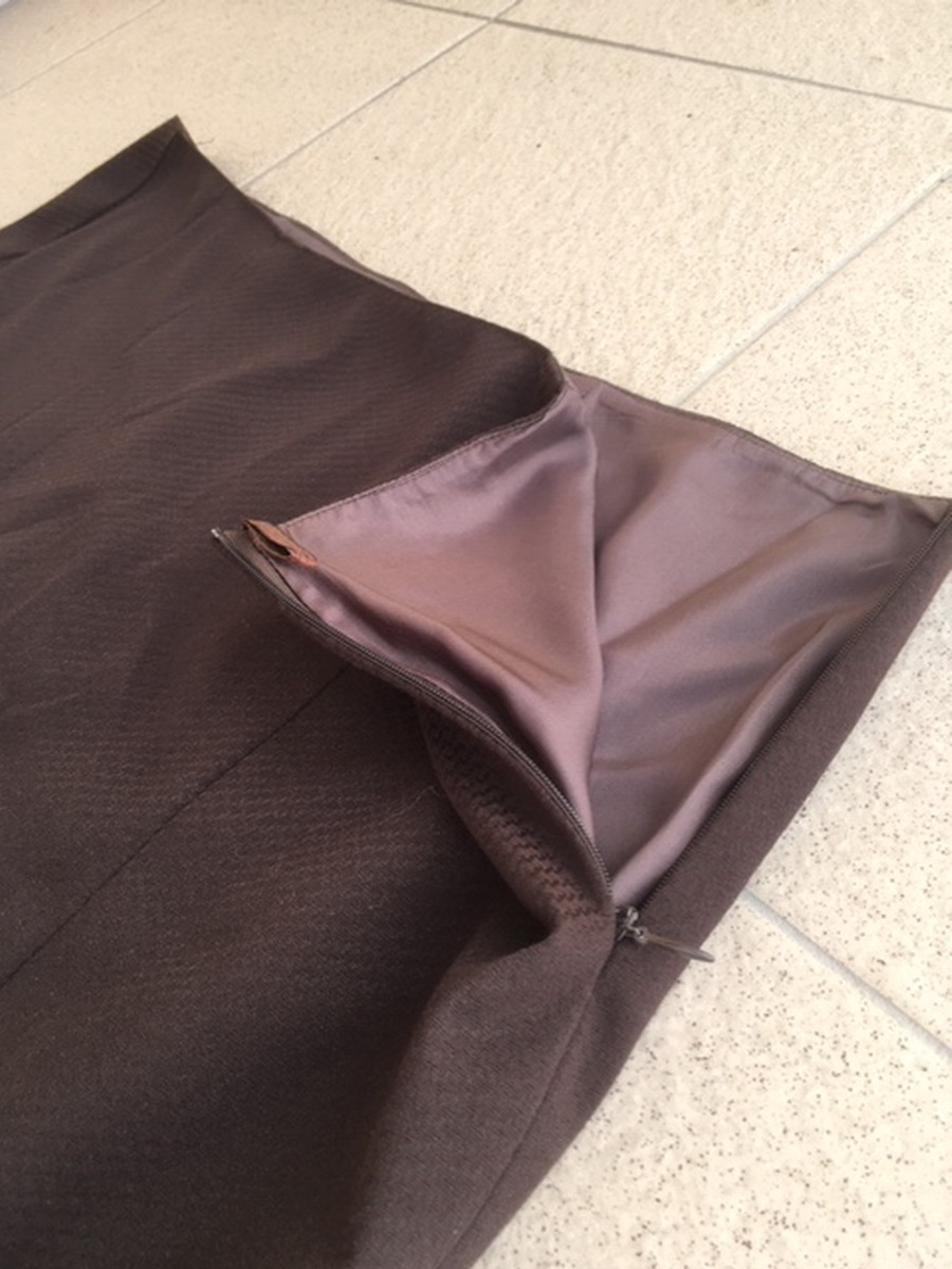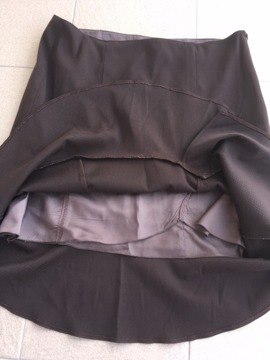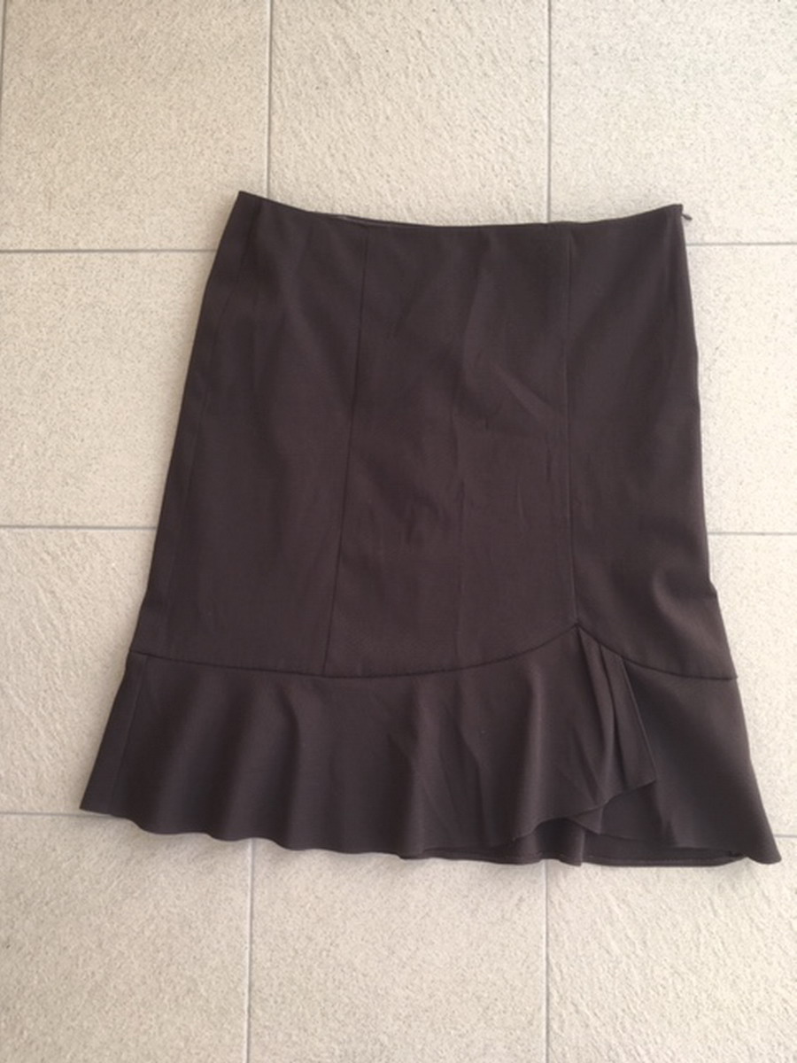 Látková sukňa v tmavohnedej farbe nad kolená, značka Zana V collection, veľkosť je uvedená 48, ale je menšia (tipujem 46) vyrobená na Slovensku, zapínanie na zips na boku, sukňa je podšitá, materiál: 65% polyester, 30% viskóza, 5% elastan
