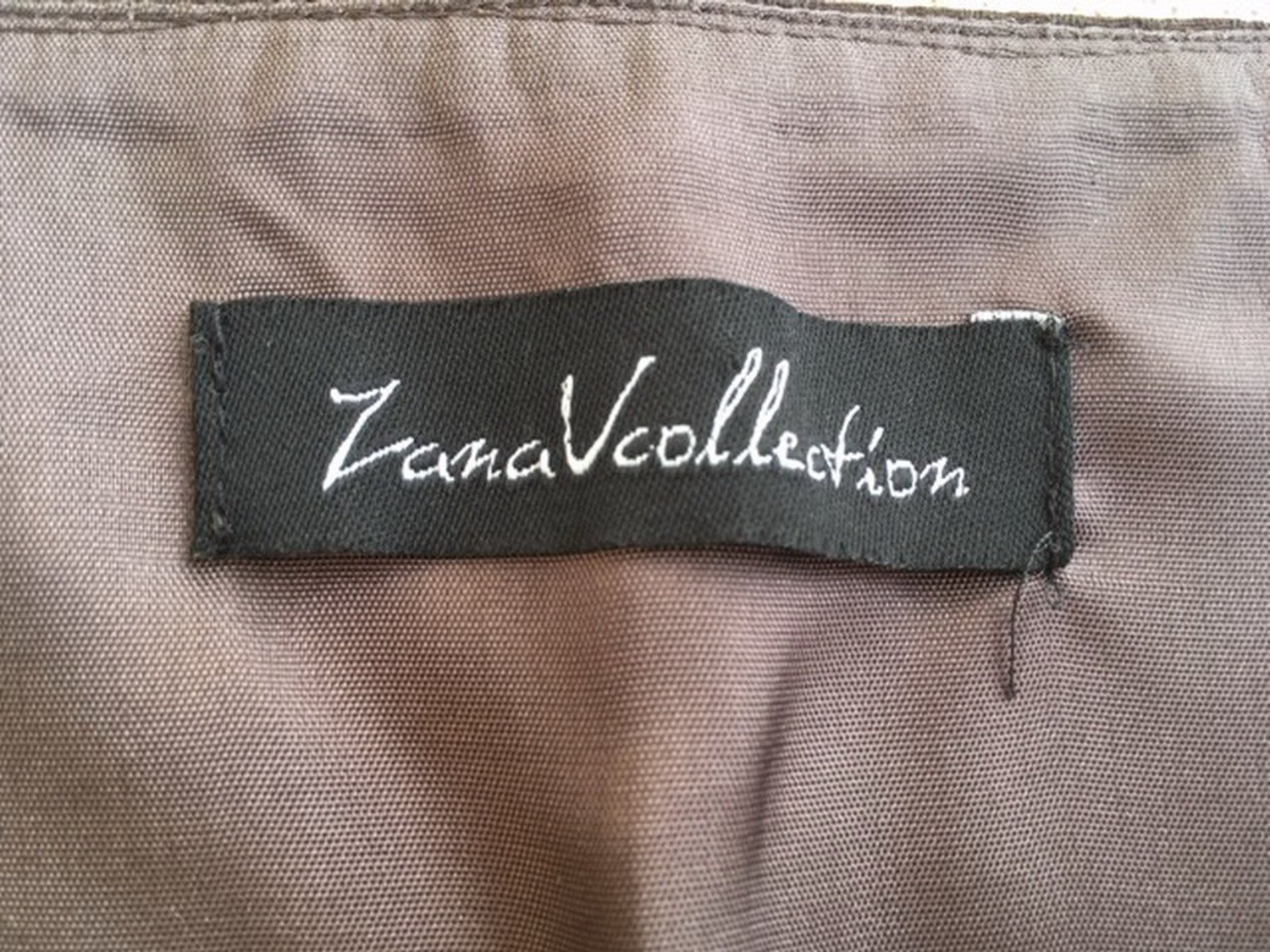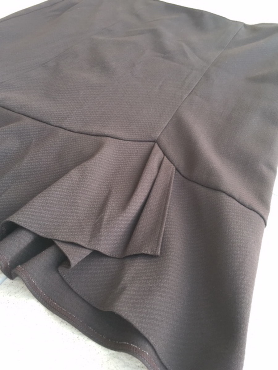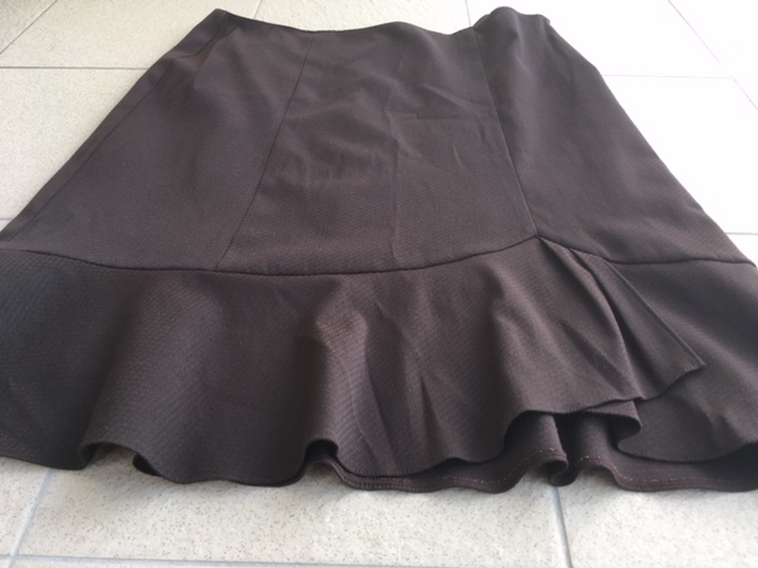 Látková sukňa v tmavohnedej farbe nad kolená, značka Zana V collection, veľkosť je uvedená 48, ale je menšia (tipujem 46) vyrobená na Slovensku, zapínanie na zips na boku, sukňa je podšitá, materiál: 65% polyester, 30% viskóza, 5% elastan