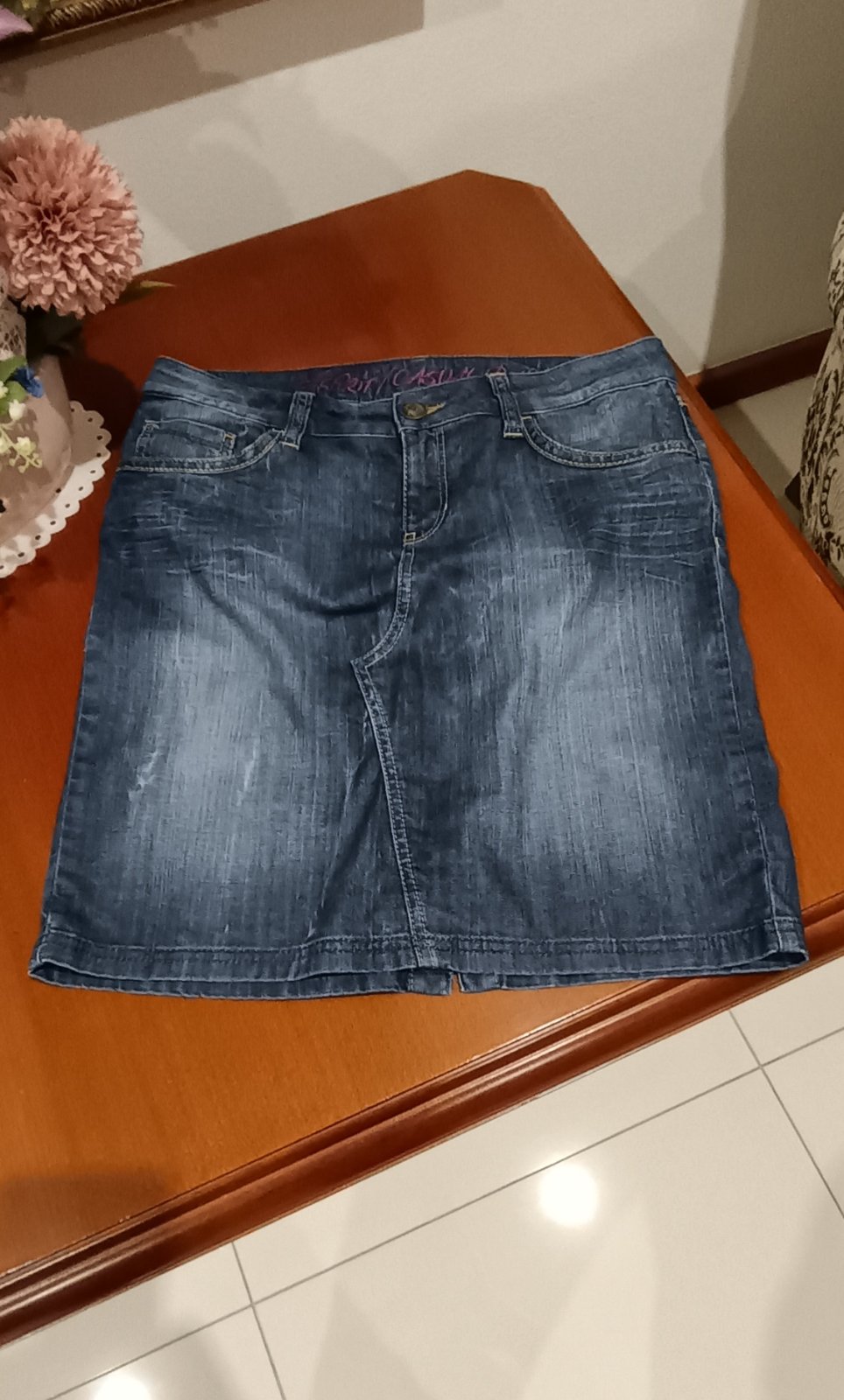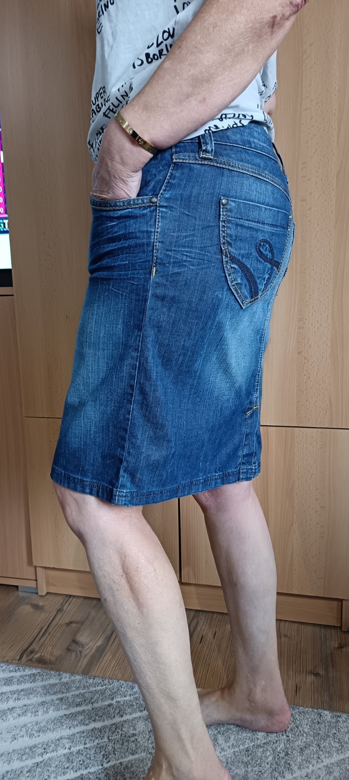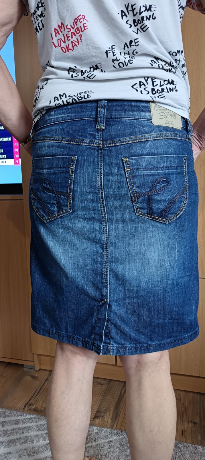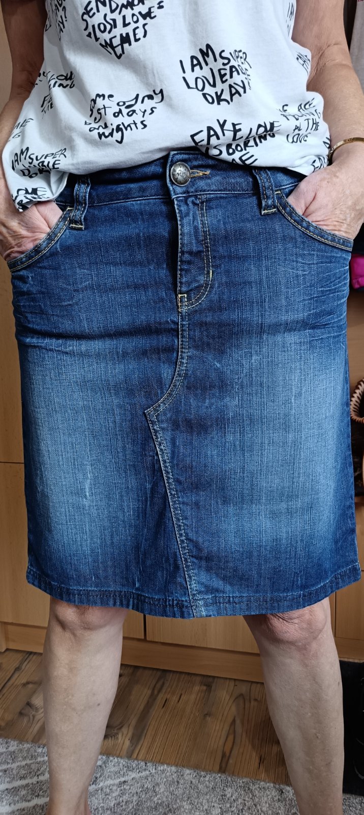 Krásna jemná elastická riflová sukňa, príjemná mäkká tenšia riflovina, pekné detaily, 98% bavlna, 2% elastan, / foto 172 cm, boky malé L /, v super stave, nosená pár krát v lete, mám veľa.