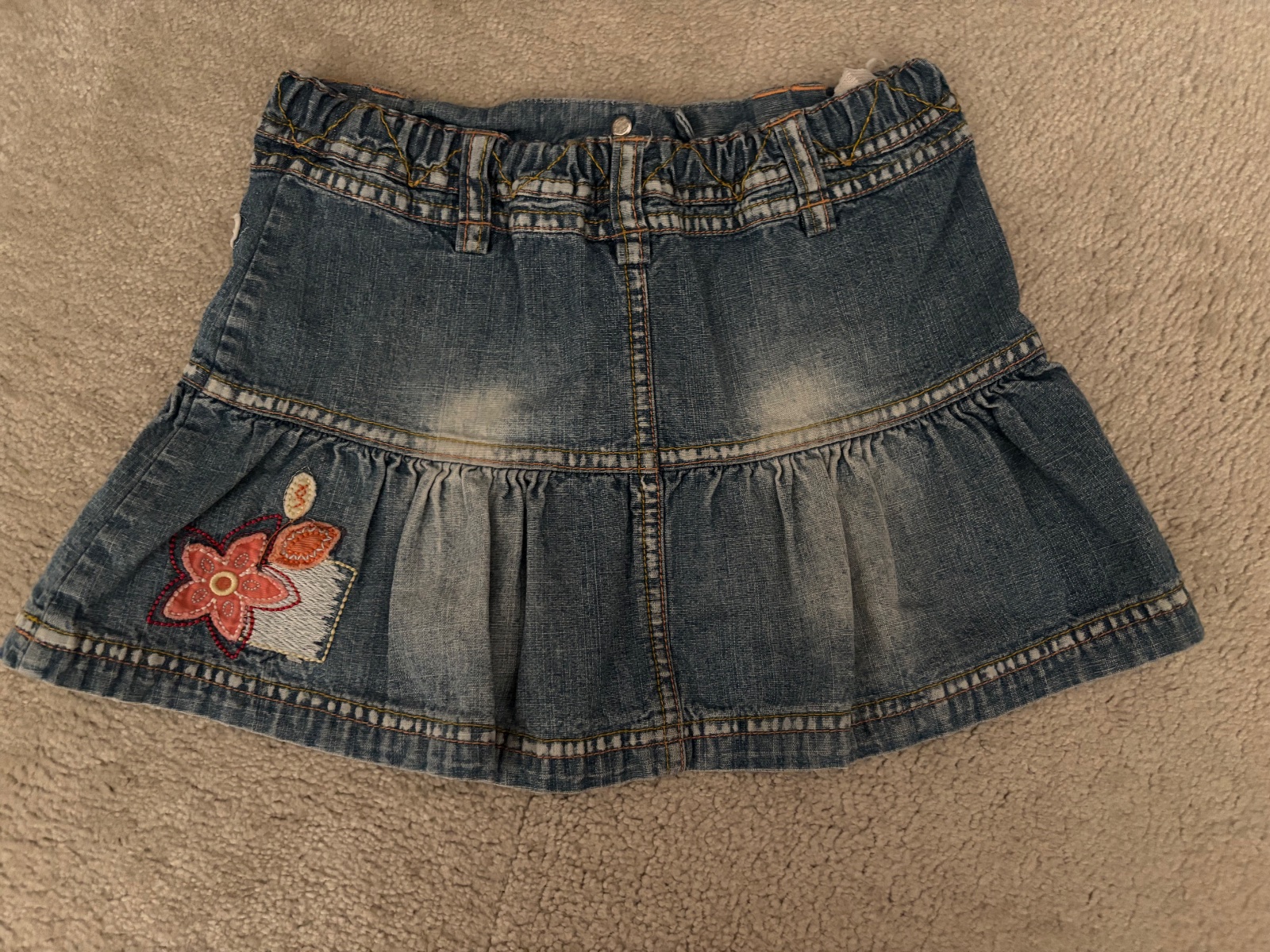 Riflová prestrihnutá suknička s volánikmi vhodná bežné nosenie. Vpredu zapínanie na gombík a zips. Regulovateľná gumička. Top stav. Veľkosť uvedená na štítku je 98, vďaka regulovateľnej gumičke j...
