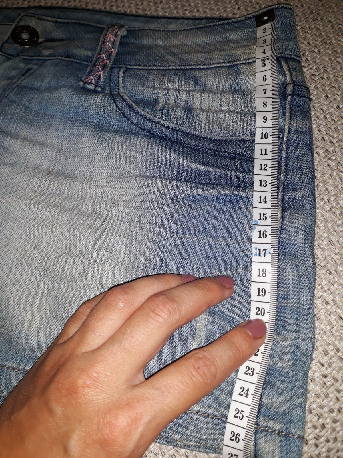 Moderná rifľová mini sukňa v obnosenom vzhľade. Veľkosť 28.
