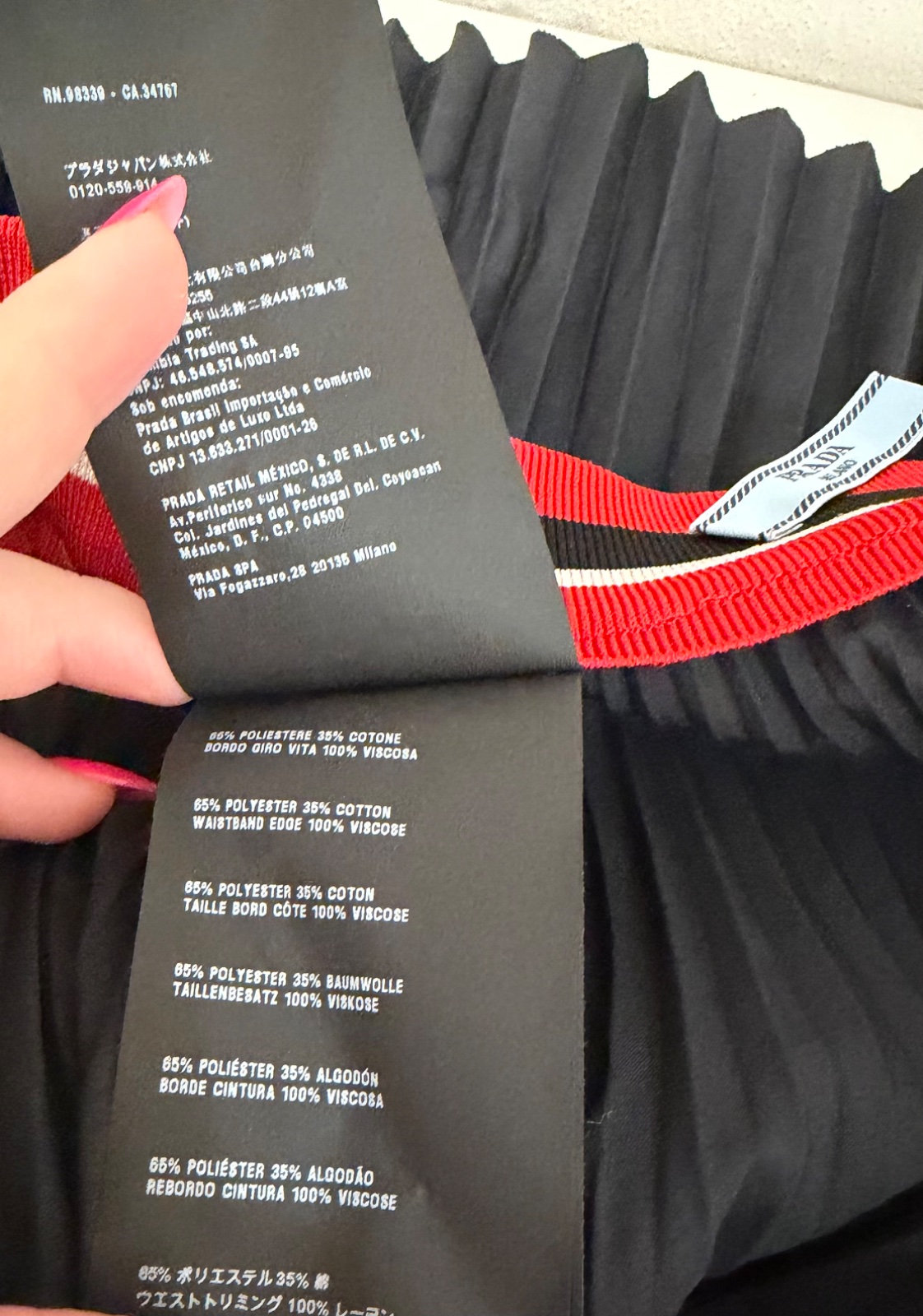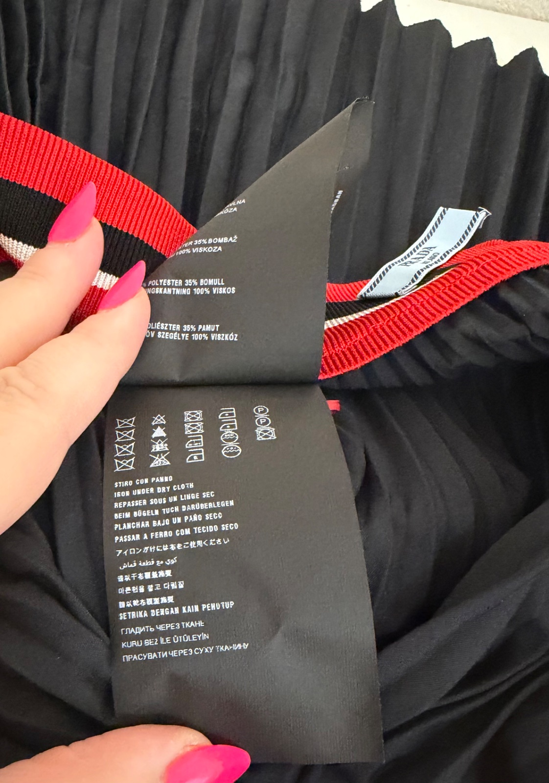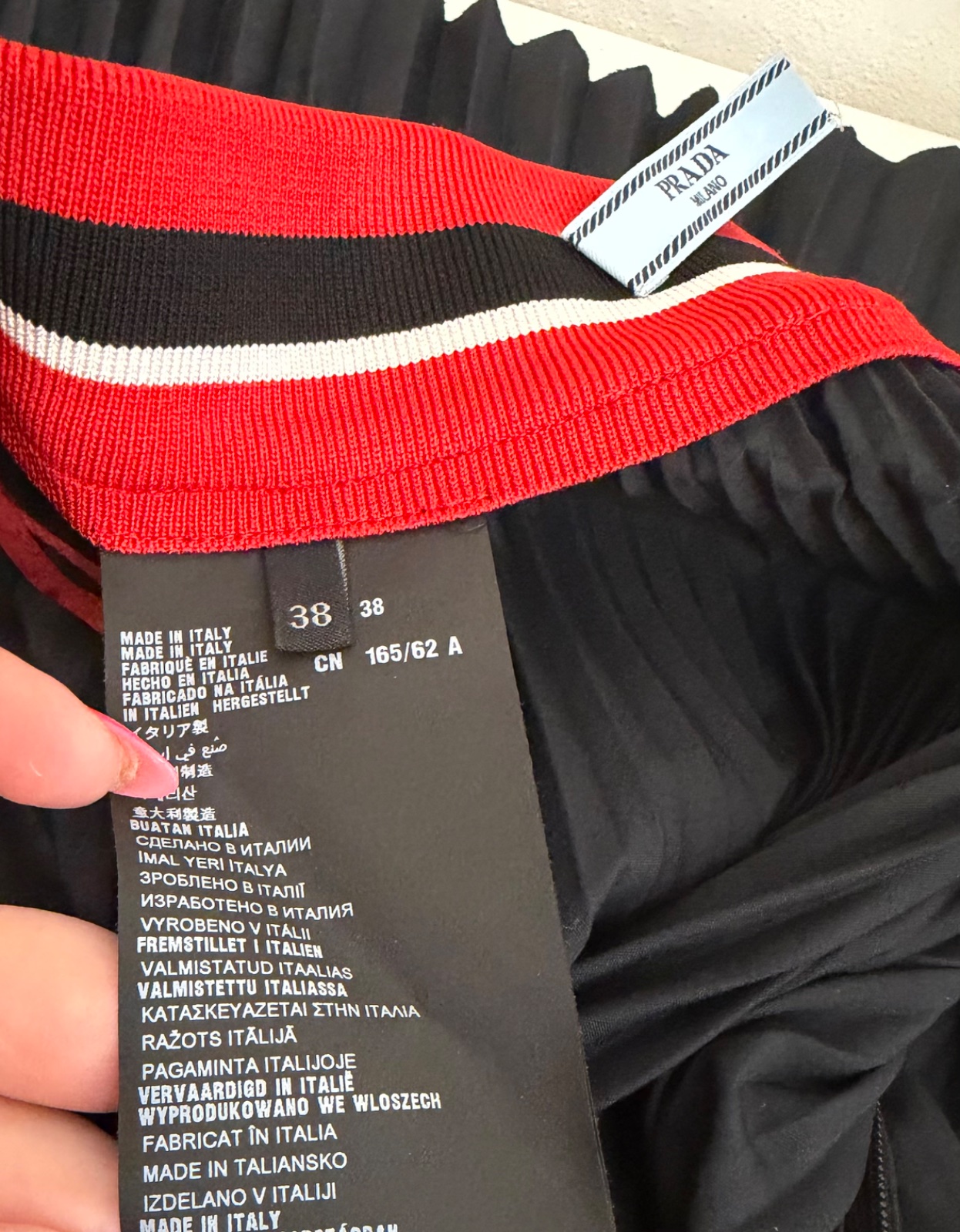 Nádherná originál Prada plisovaná sukňa z kolekcie 2014 s ikonickým športovo-elegantným pásom v kombinácii červenej, čiernej a bielej.
