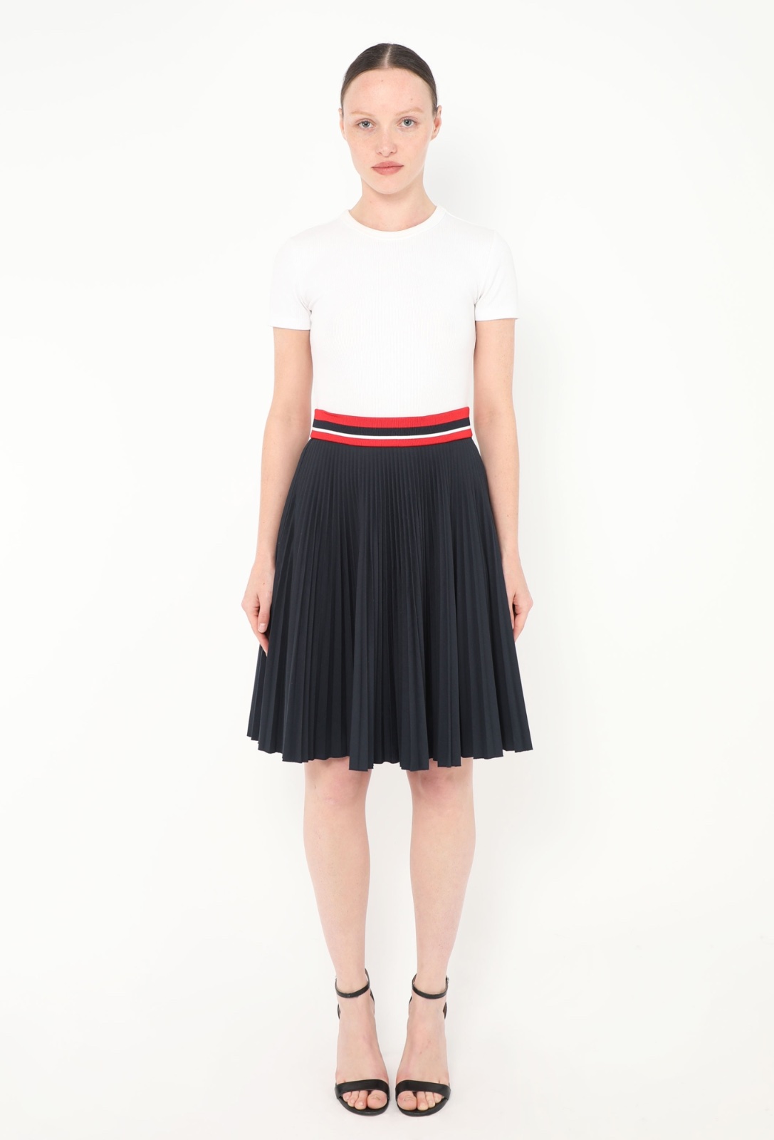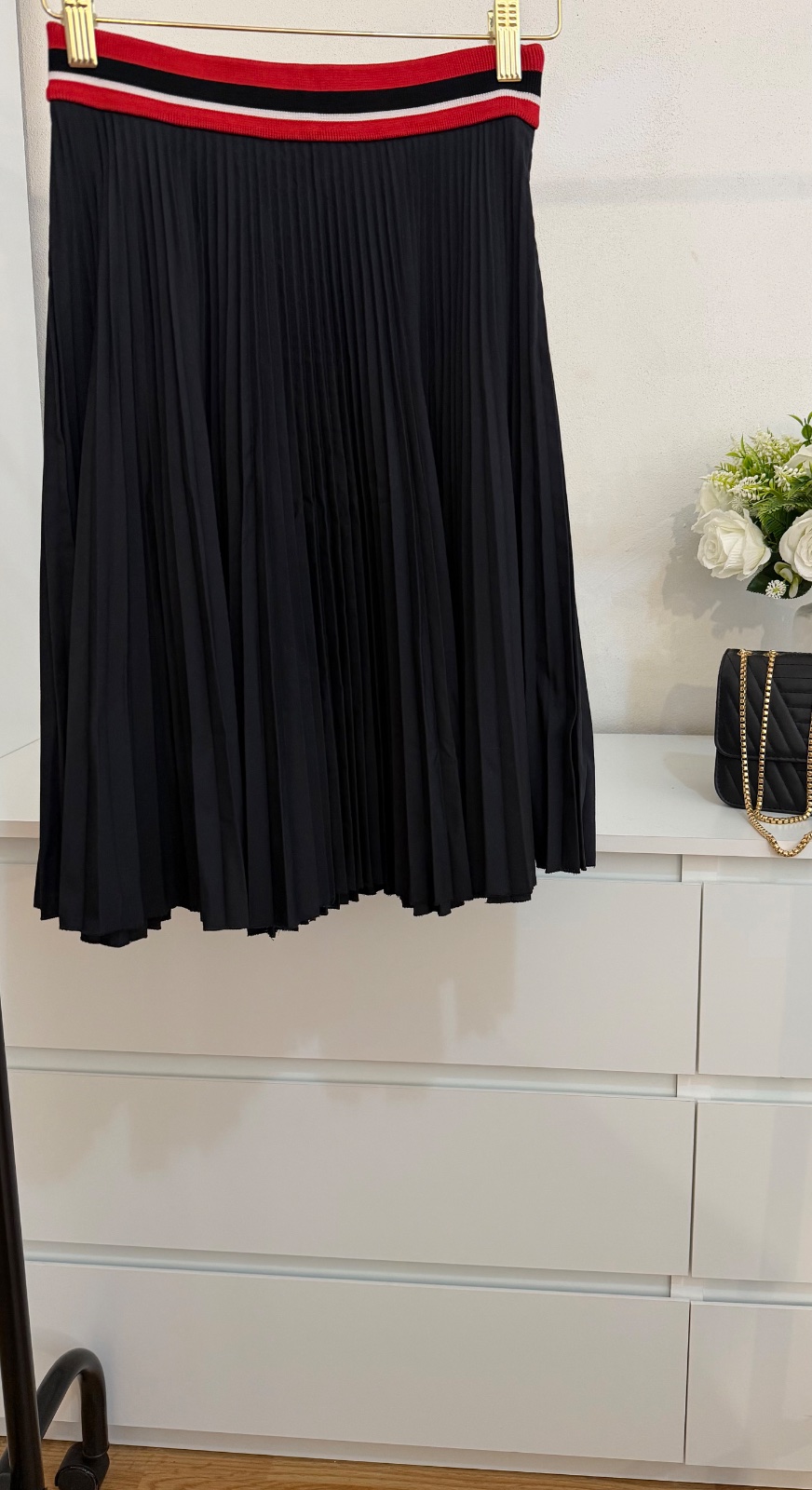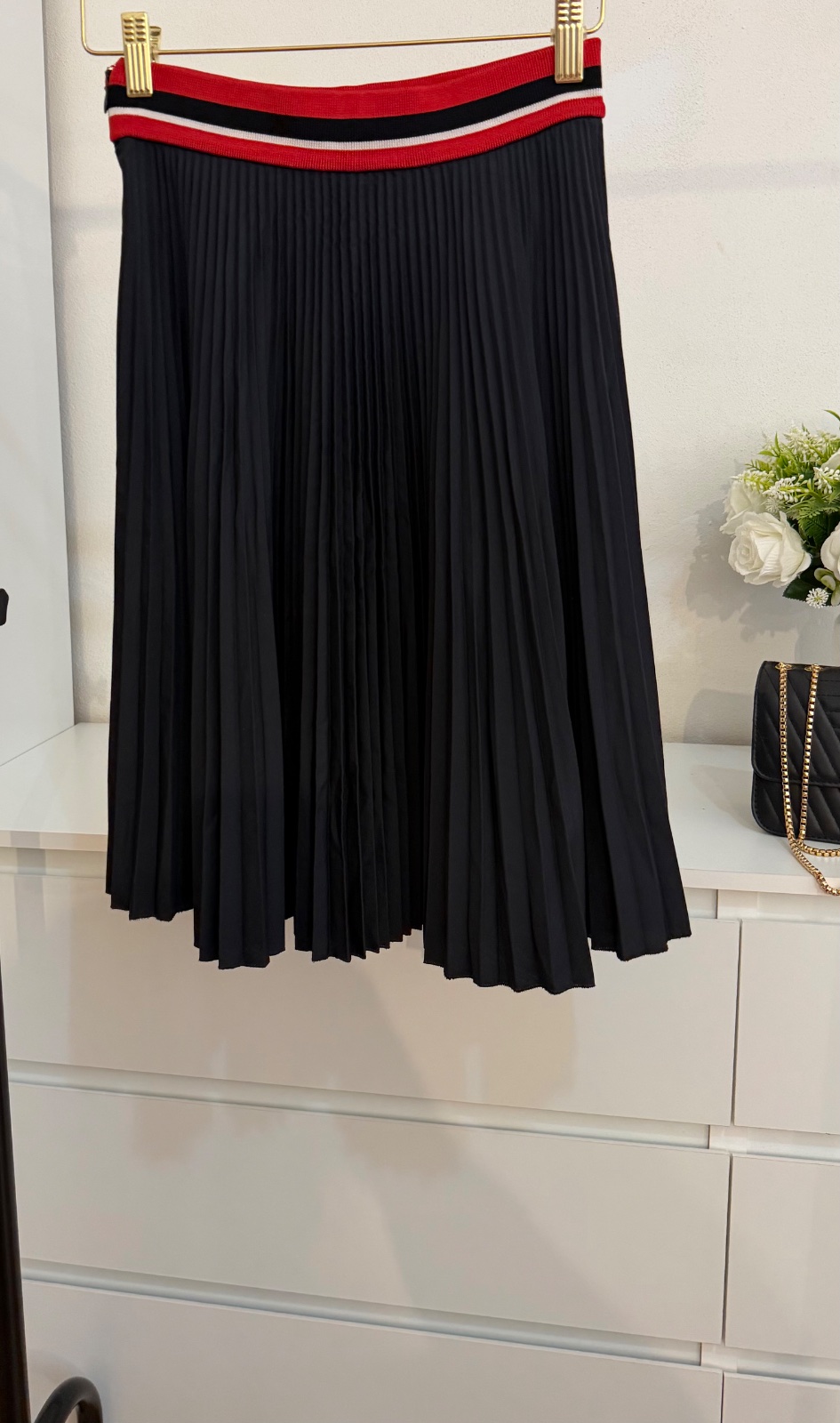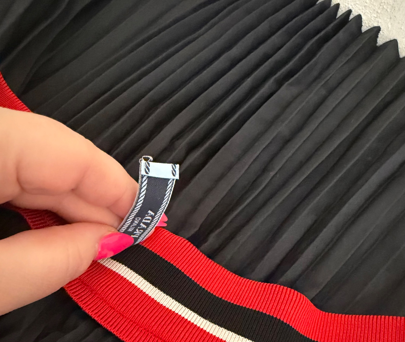 Nádherná originál Prada plisovaná sukňa z kolekcie 2014 s ikonickým športovo-elegantným pásom v kombinácii červenej, čiernej a bielej.