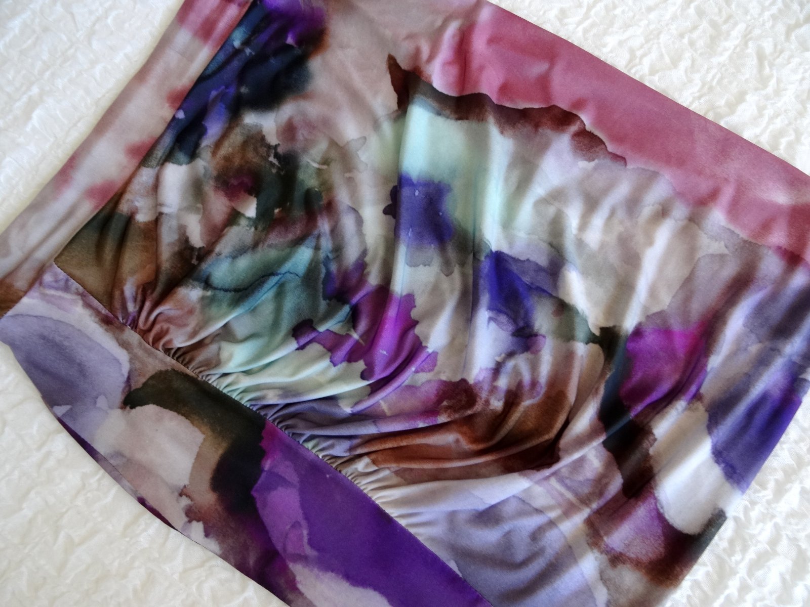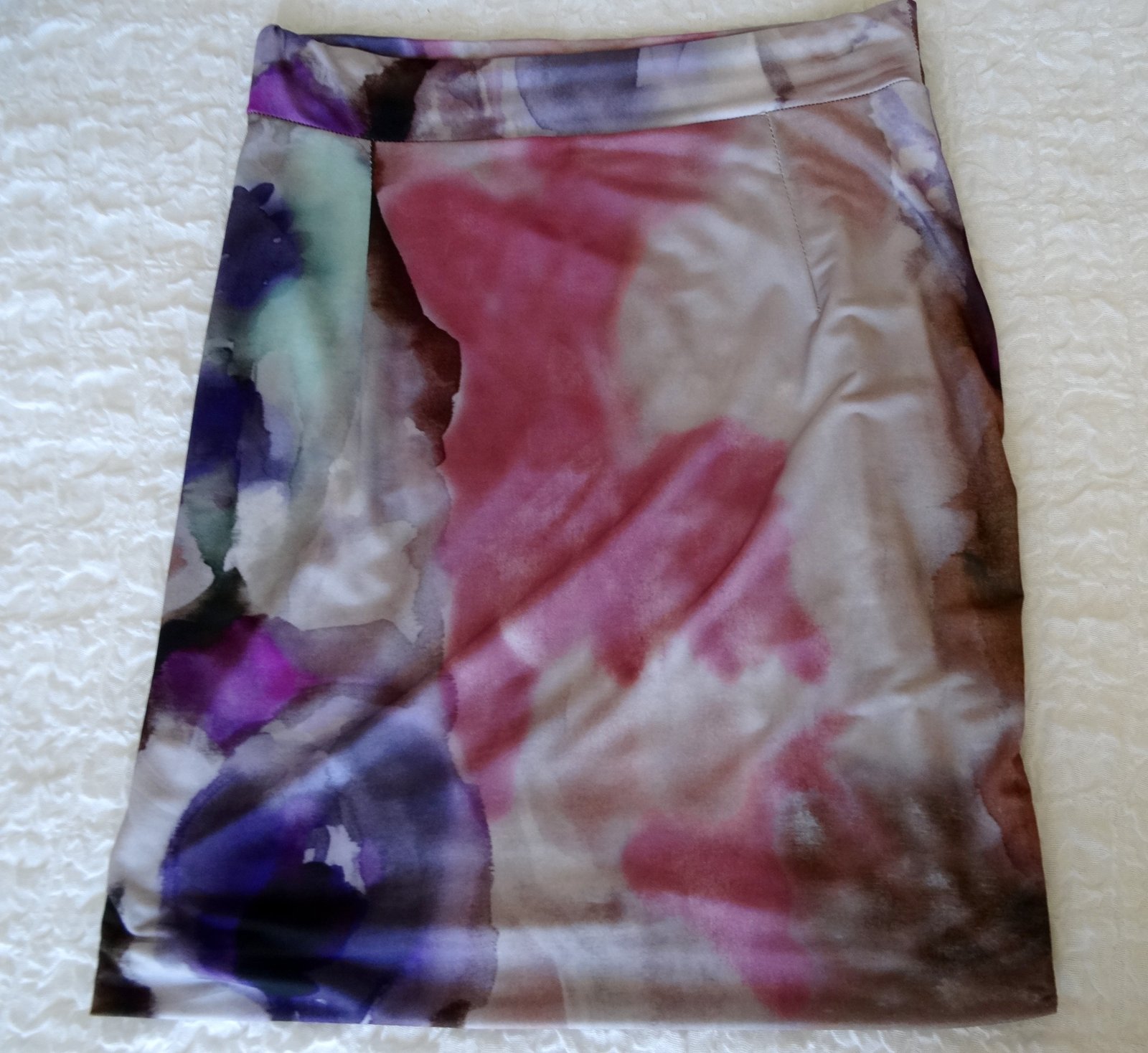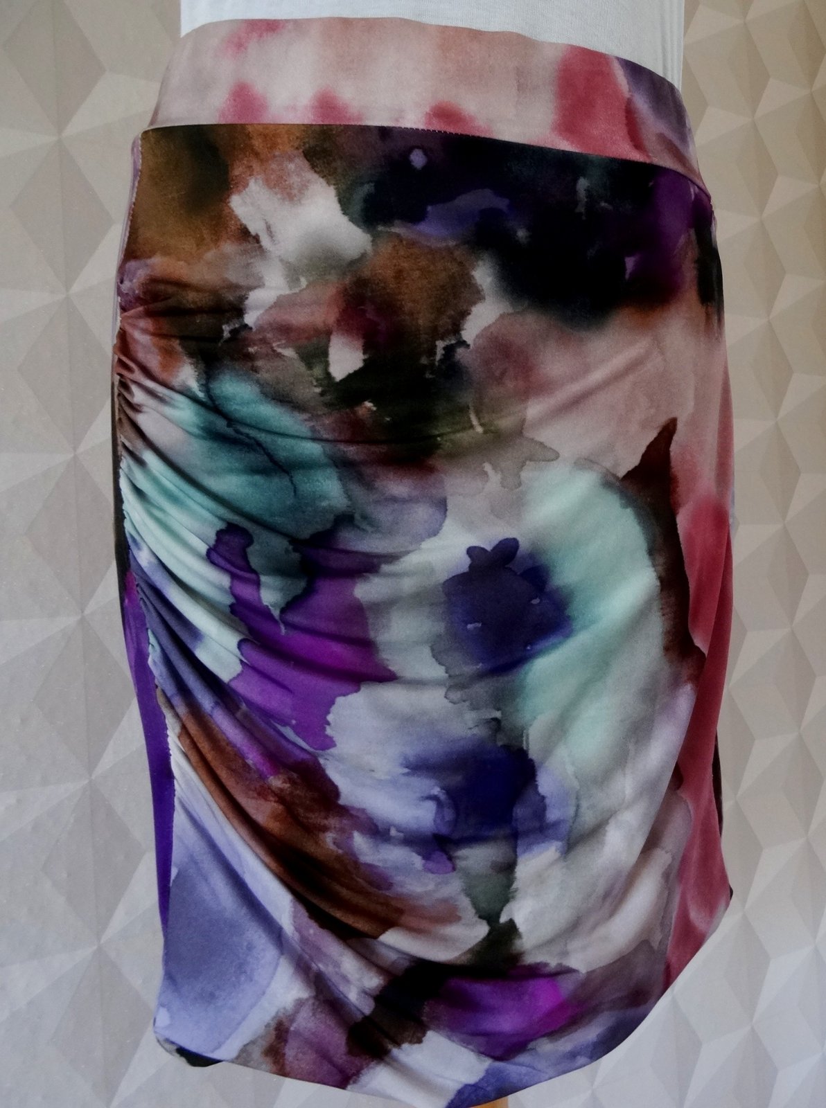 Sukňa je tesne nad kolená, padavý materiál, na jednom boku riasená.